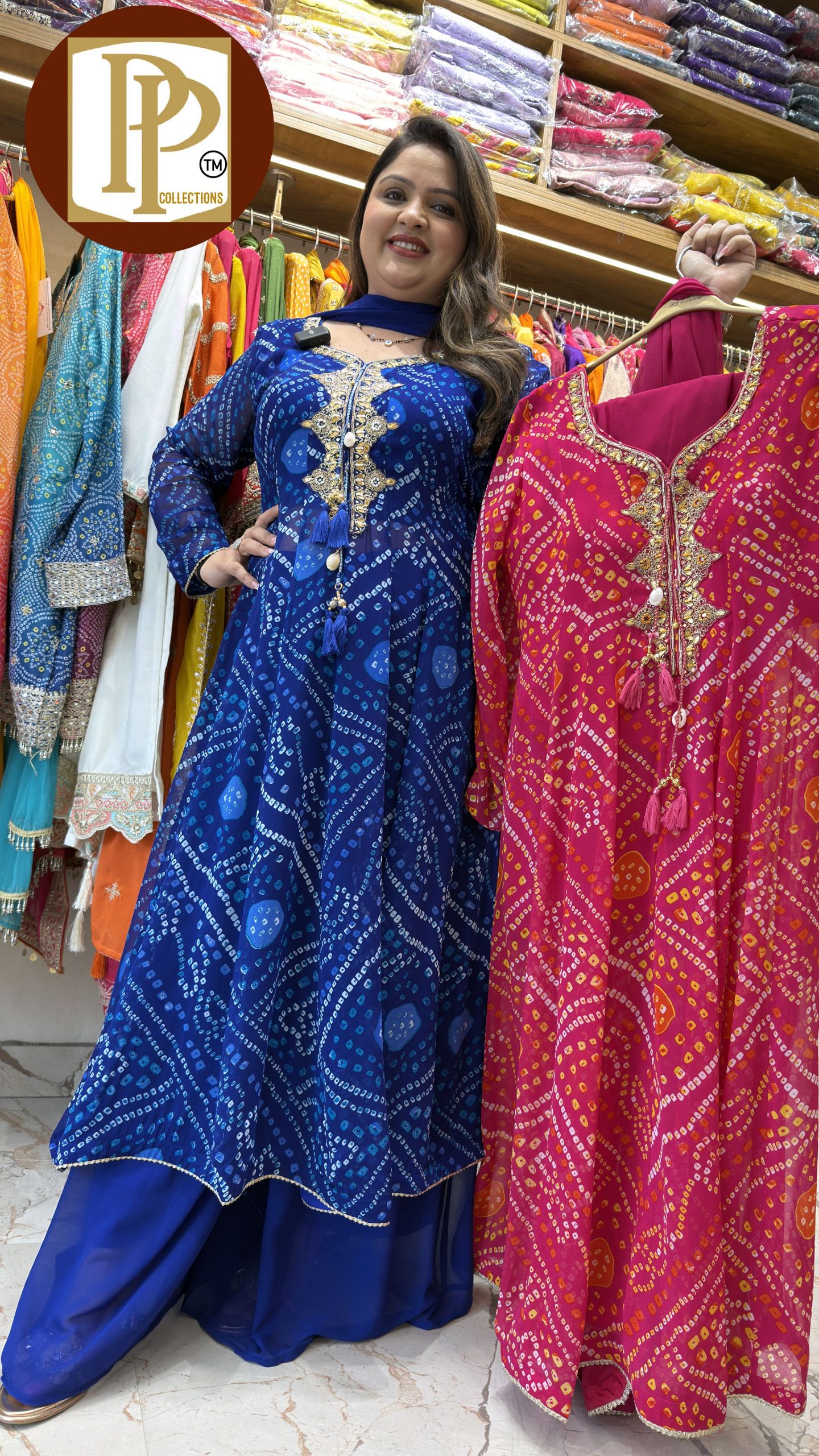 Description : 3piece Plazzo Set Fabric Type : Georgette Style : Anarkali Set Work Type : Bandhej On Original Mirror & Hand Work With Matching Dupatta.