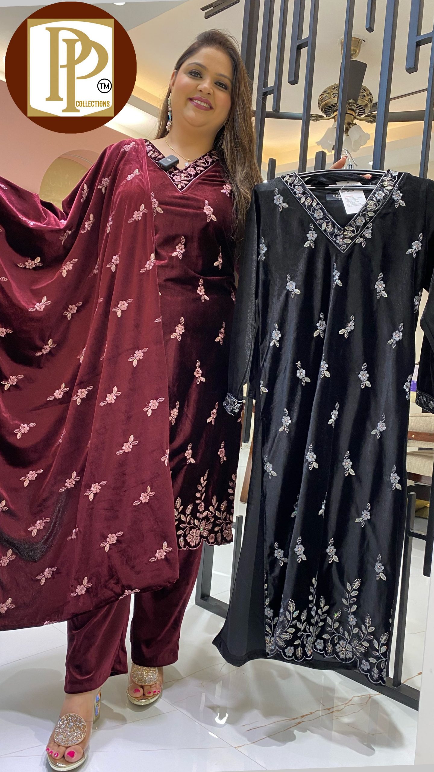 Description : 3piece Pant Set Fabric Type : Woollen Style : Stright Set Work Type : Thread Work With Matching Shawl.