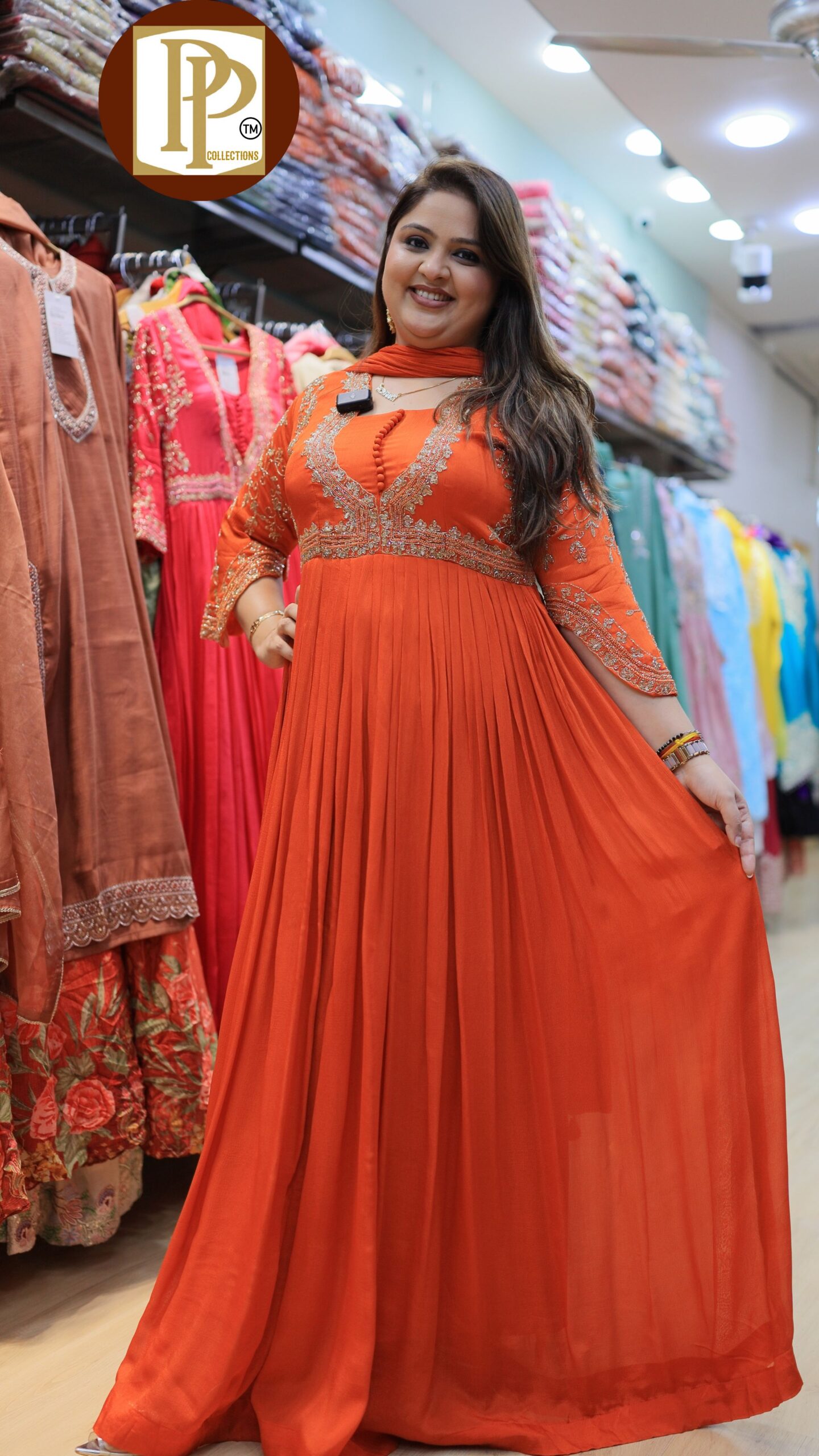 Description : 2 pcs Gown Fabric Type : Chinnon Style : Gown Work Type : Heavy Hand Work With Matching Dupatta.