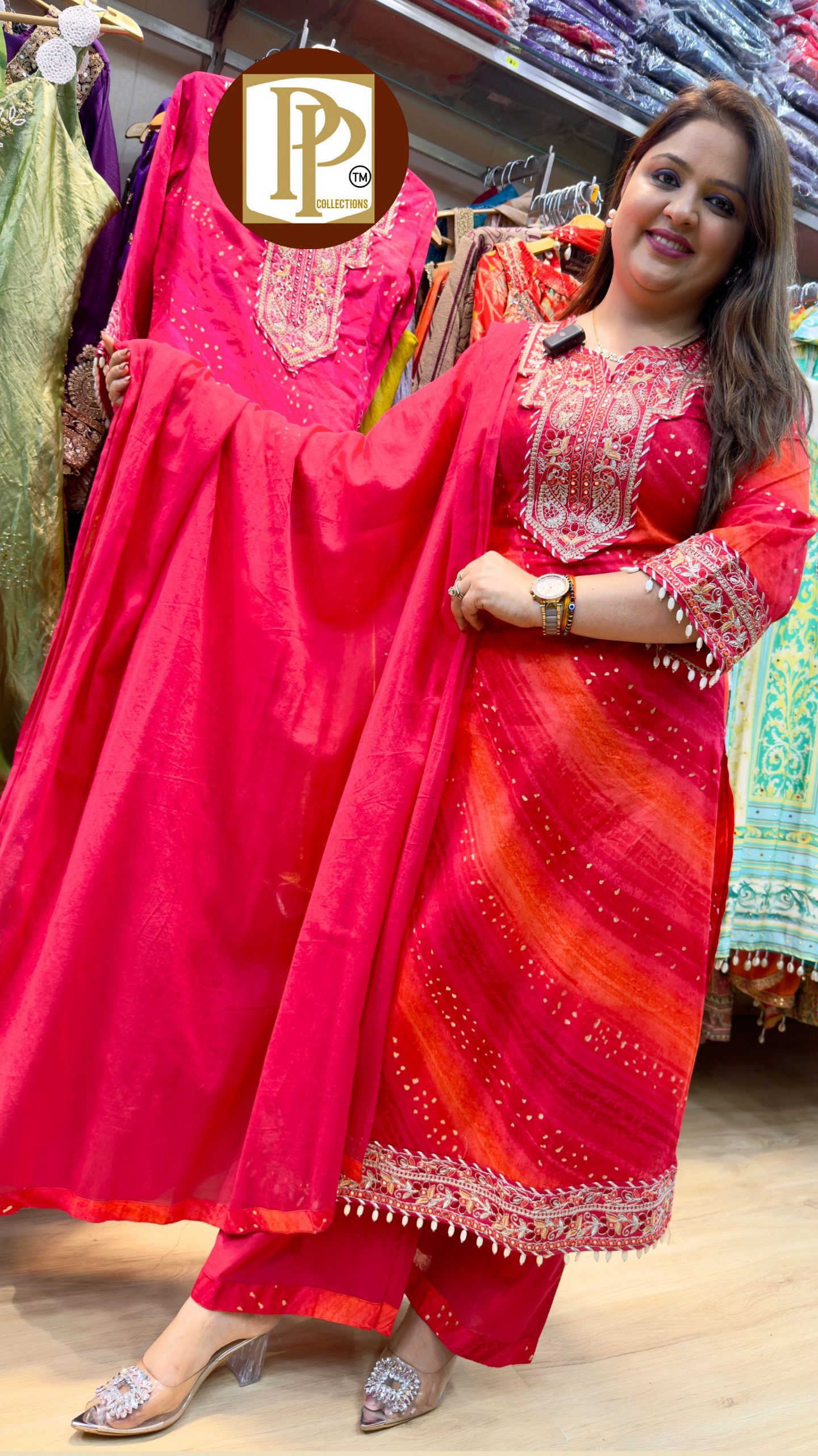 Description : front cut with pent set Fabric Type : Dola Silk Style : front kurti and plain pent . Work Type :heavy handwork with matching pent and dupatta.