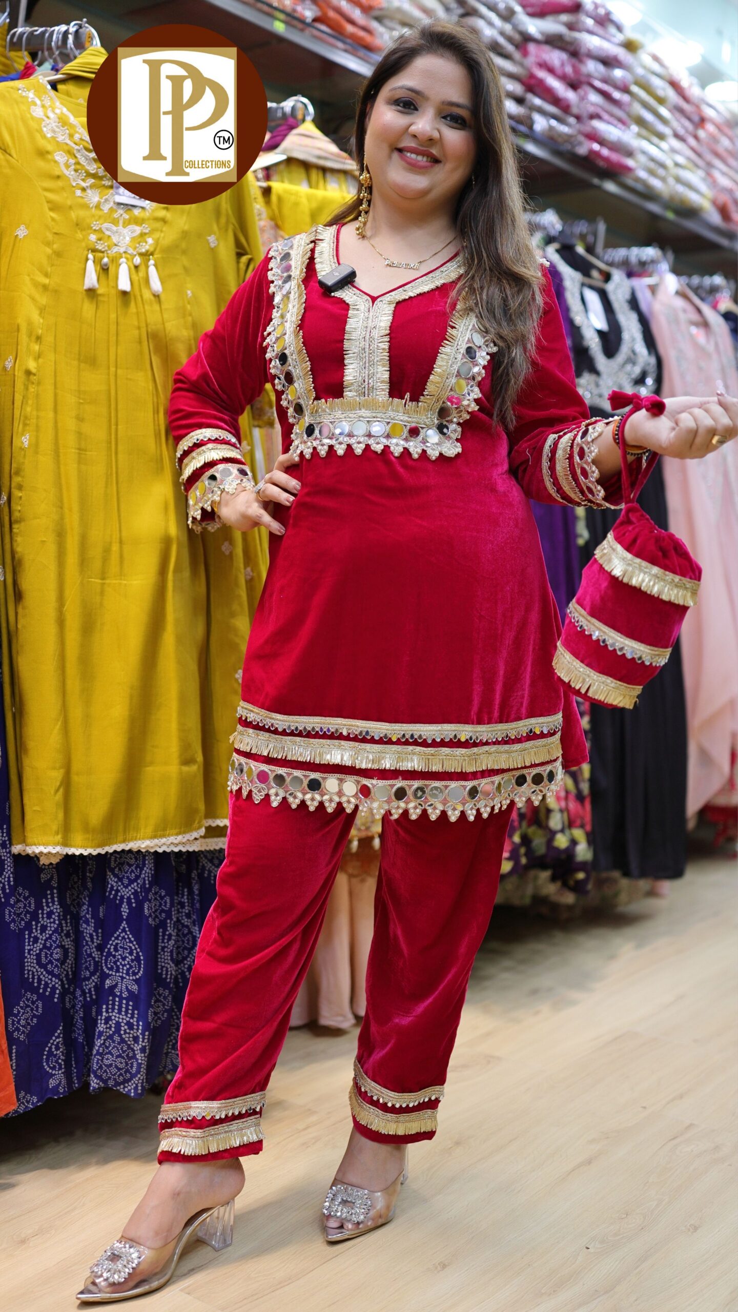 Description : 2pcs cord set Fabric Type : velvet Style : cord & pant Work Type : laces & mirror work in kurta with matching pant & potli .