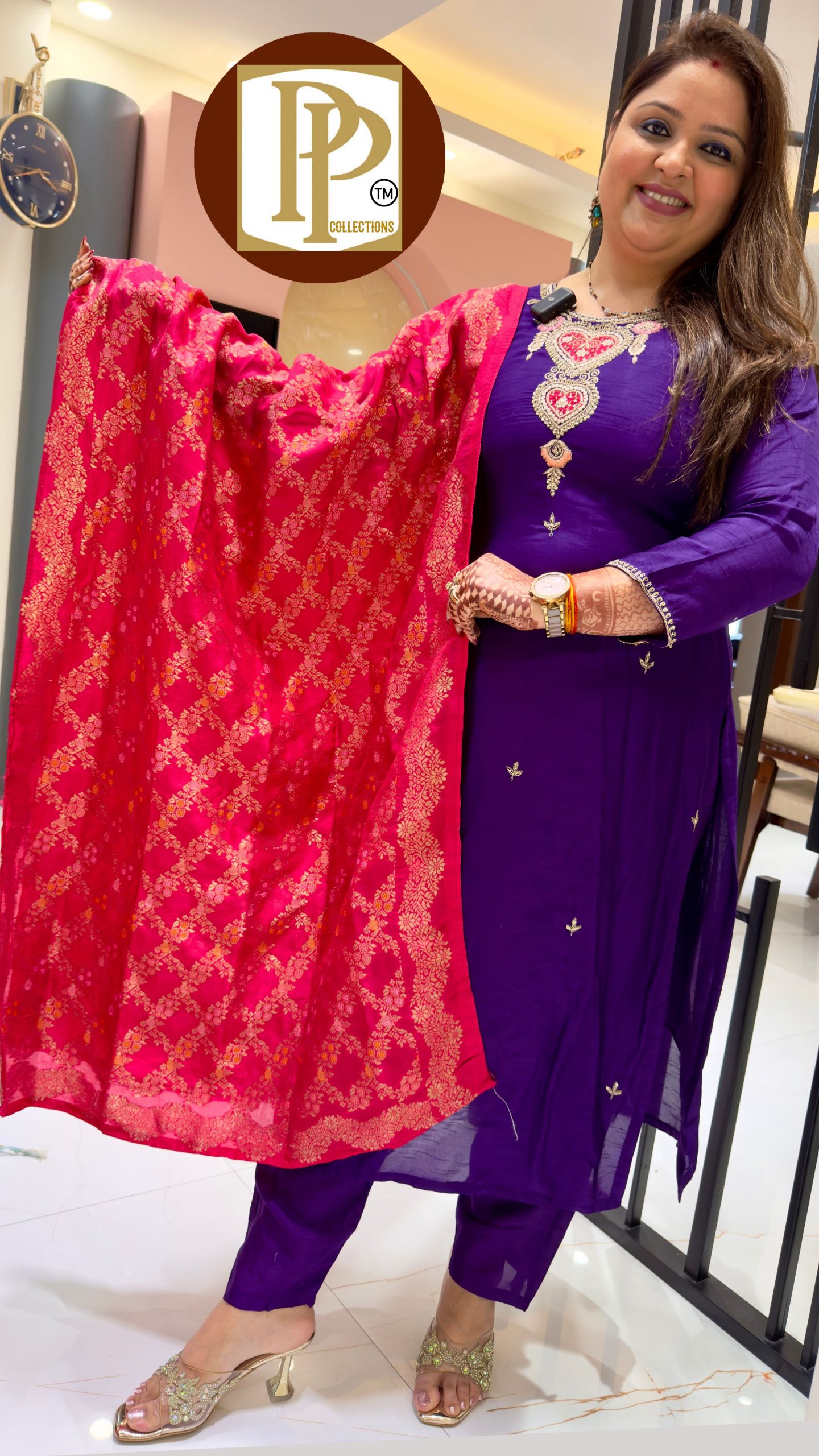 Description : 3pcs pent set Fabric Type : dola silk Style : kurti with pent . Work Type : heavy handwork with matching contrast Banarasi dupatta .
