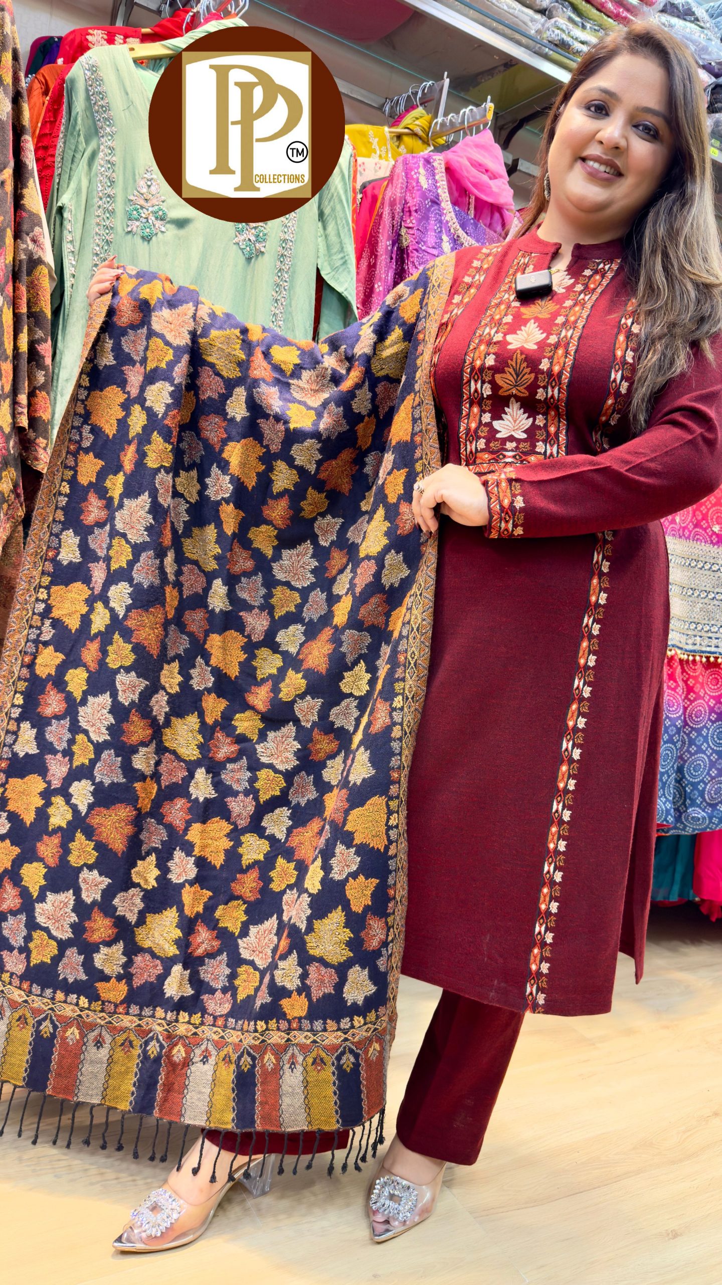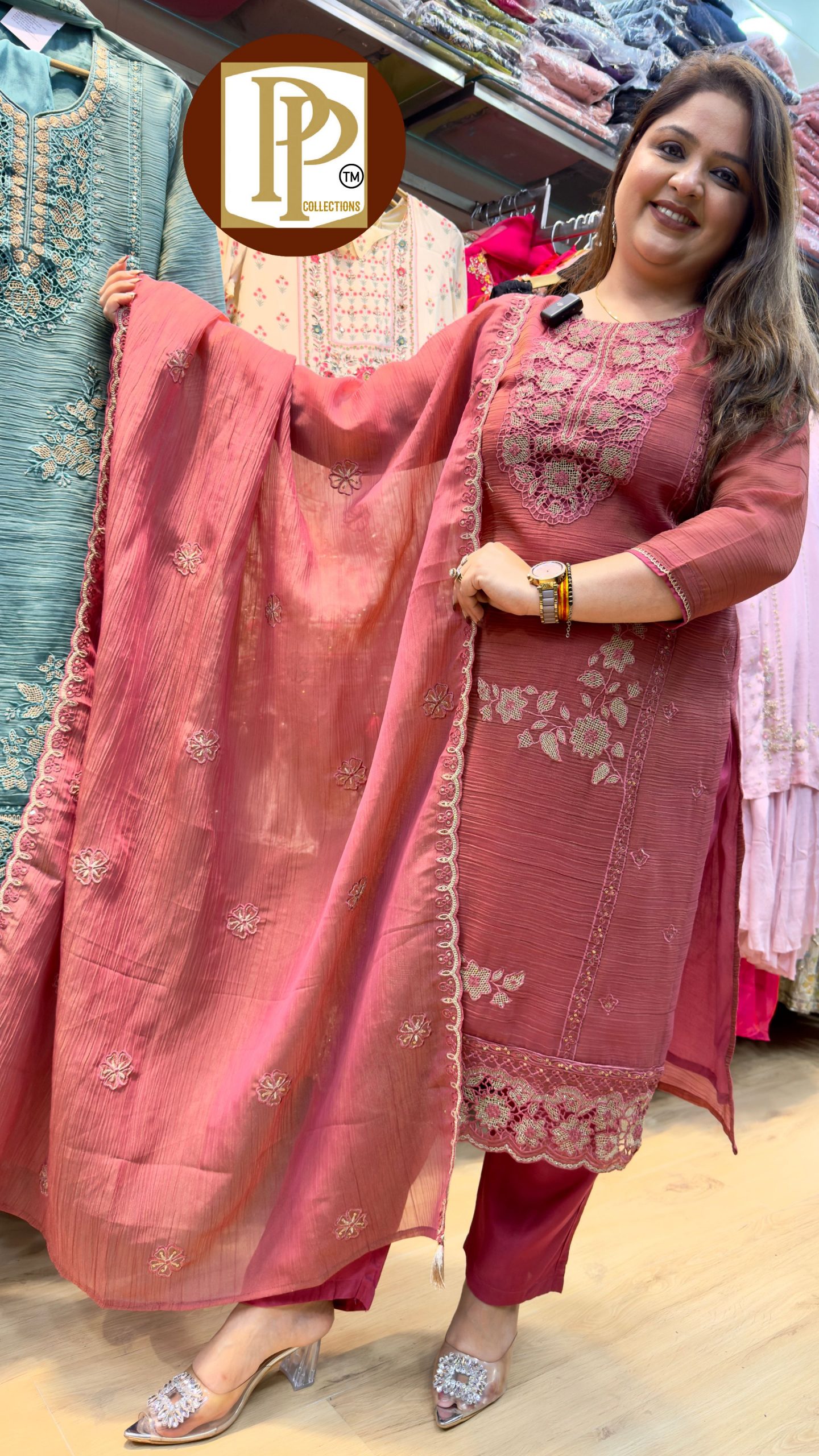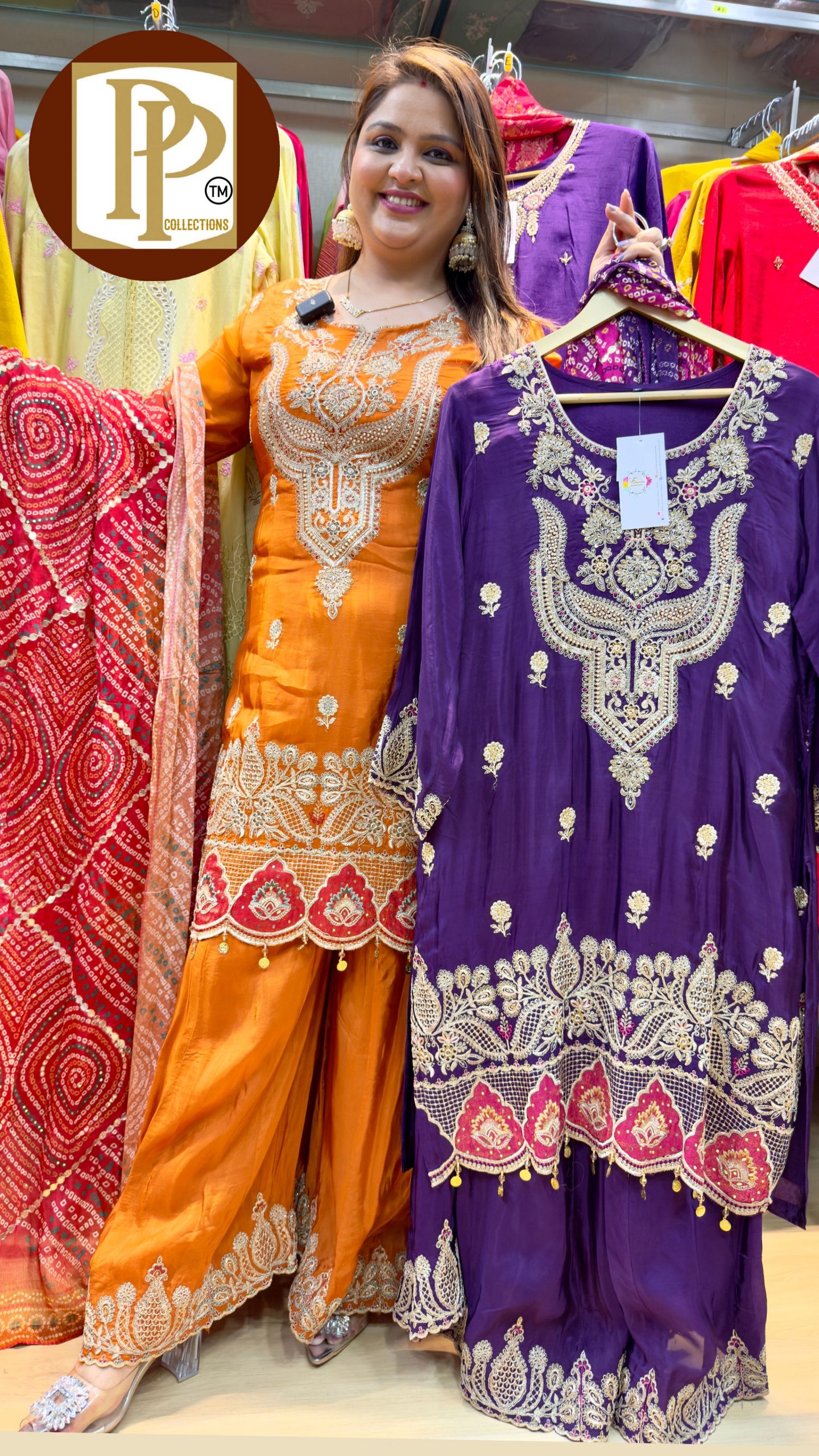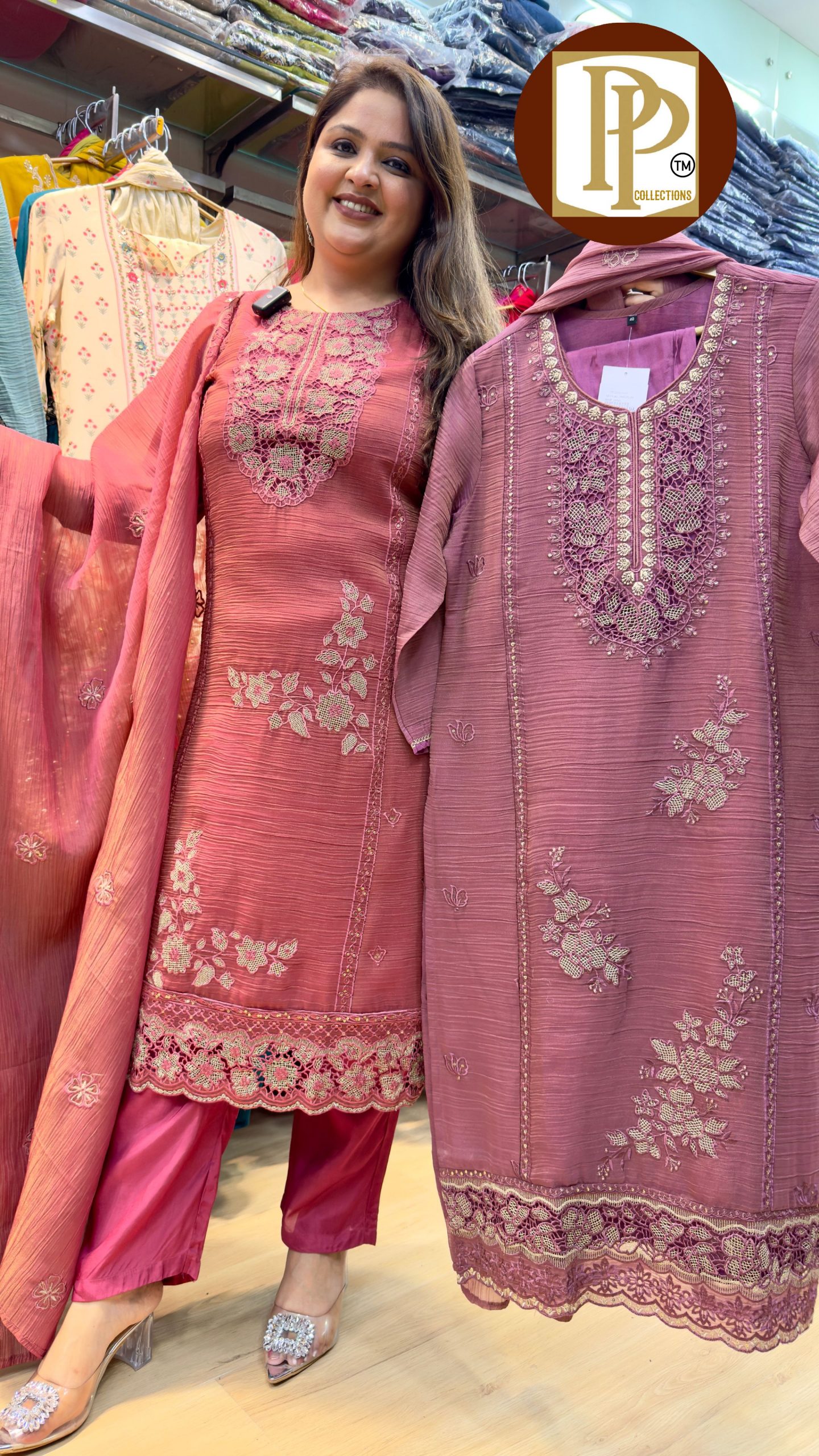 Description : 3 Pcs pant set Fabric Type :wrinkle tissue Style : straight suit Work Type : threadwork and Sipi work in kurta & matching pants with dupatta.