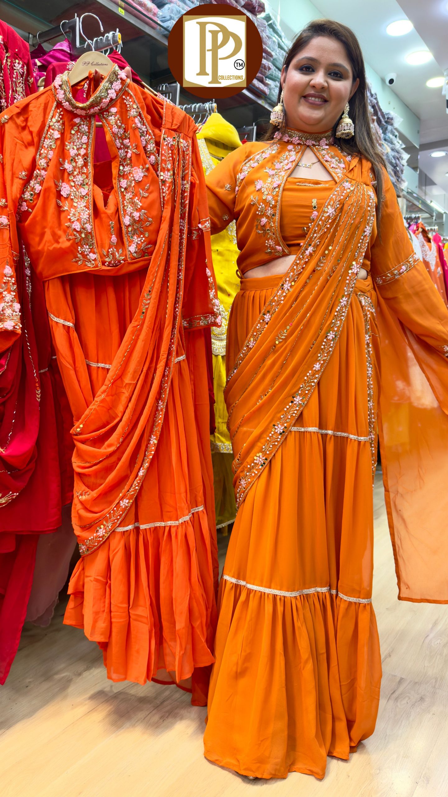 Description : 2piece Drape Set Fabric Type : Georgette Style : Blouse & Skirt Drap Sari Set Work Type : Full Havey Hand Work With Matching Choker Style Neckless.