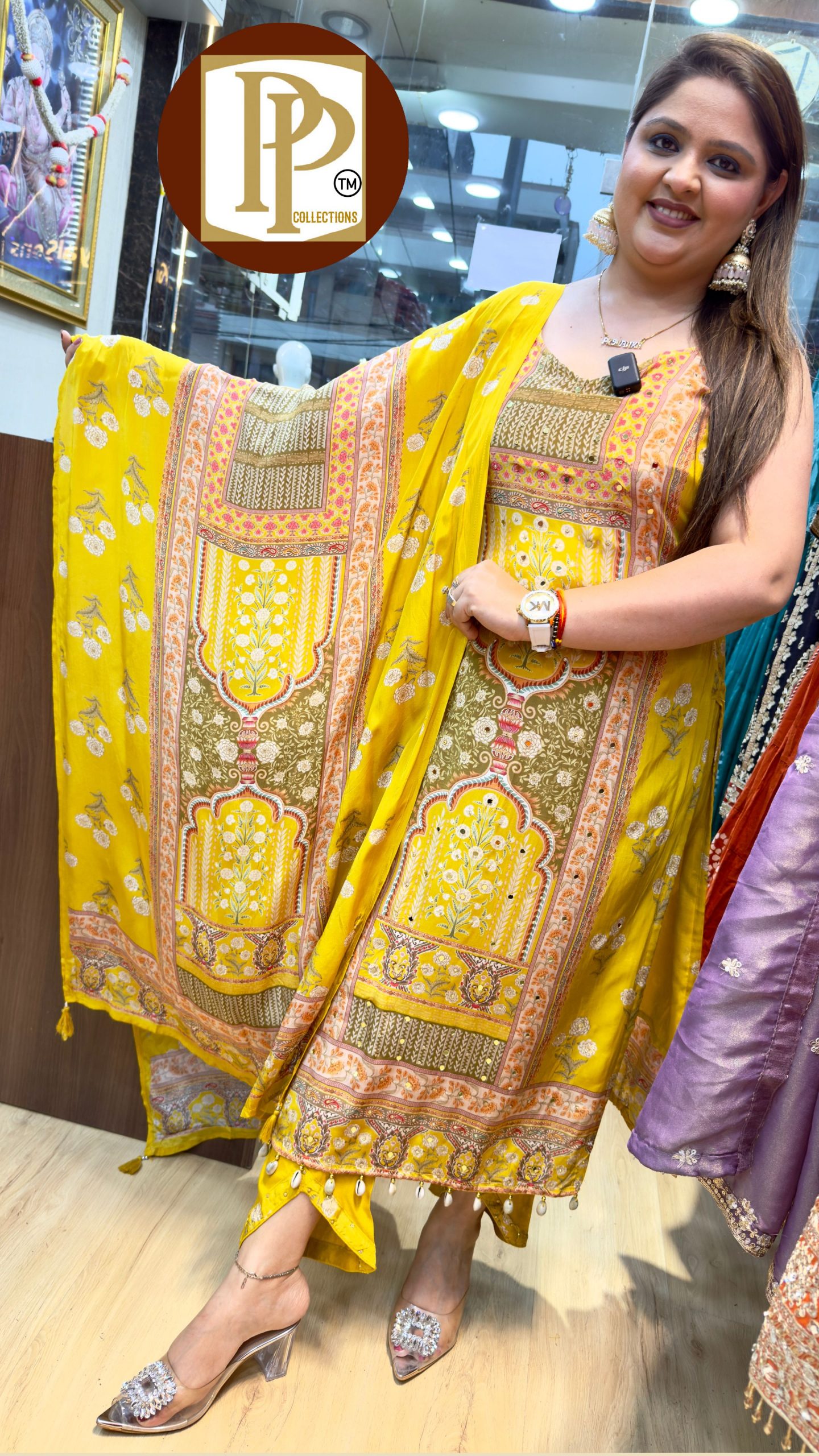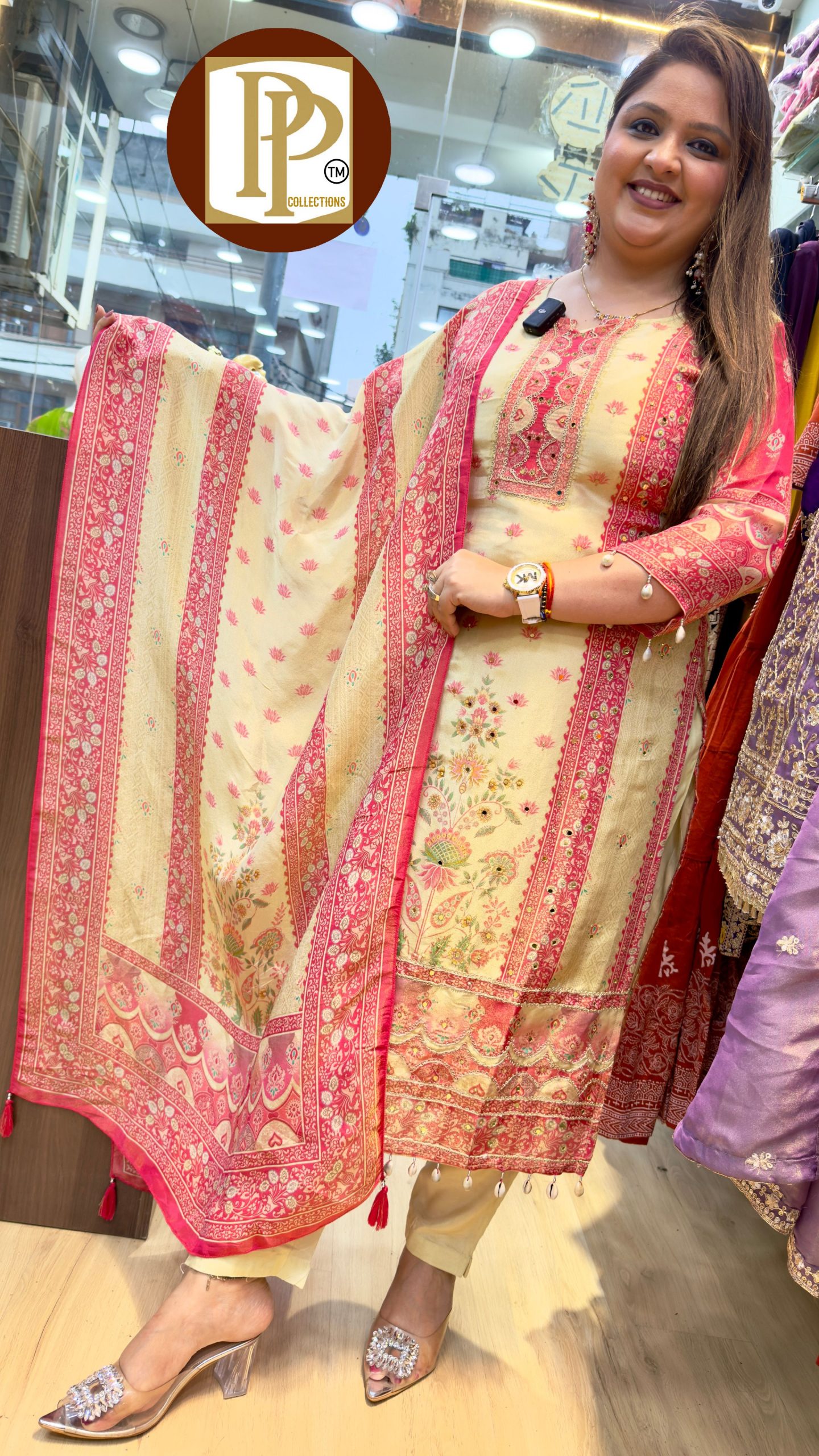 Description : 3piece Pant Set Fabric Type : Tissue Style : Straight Suit Work Type : heavy Jari work and mirror work Work With Matching contrast Dupatta.