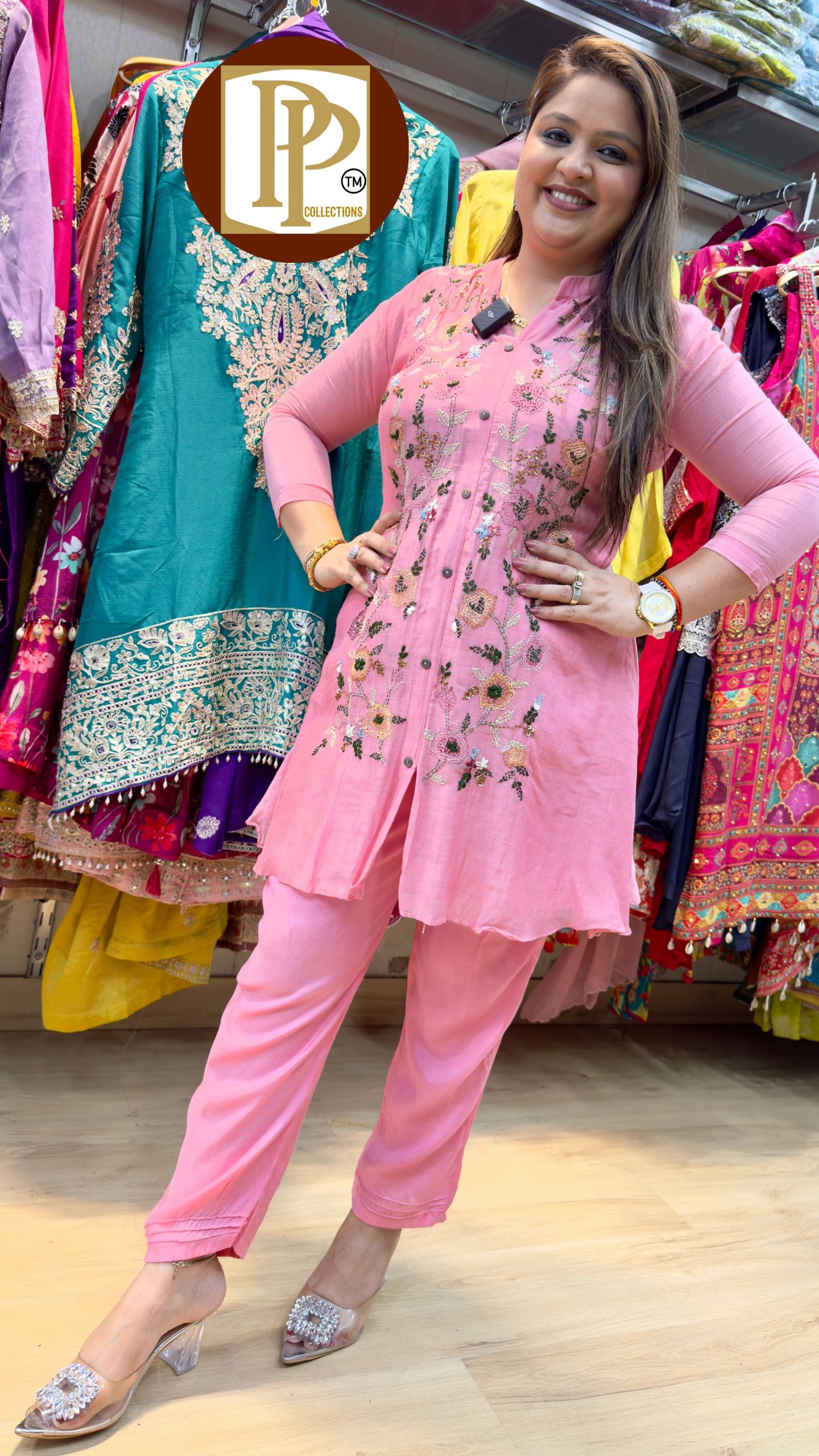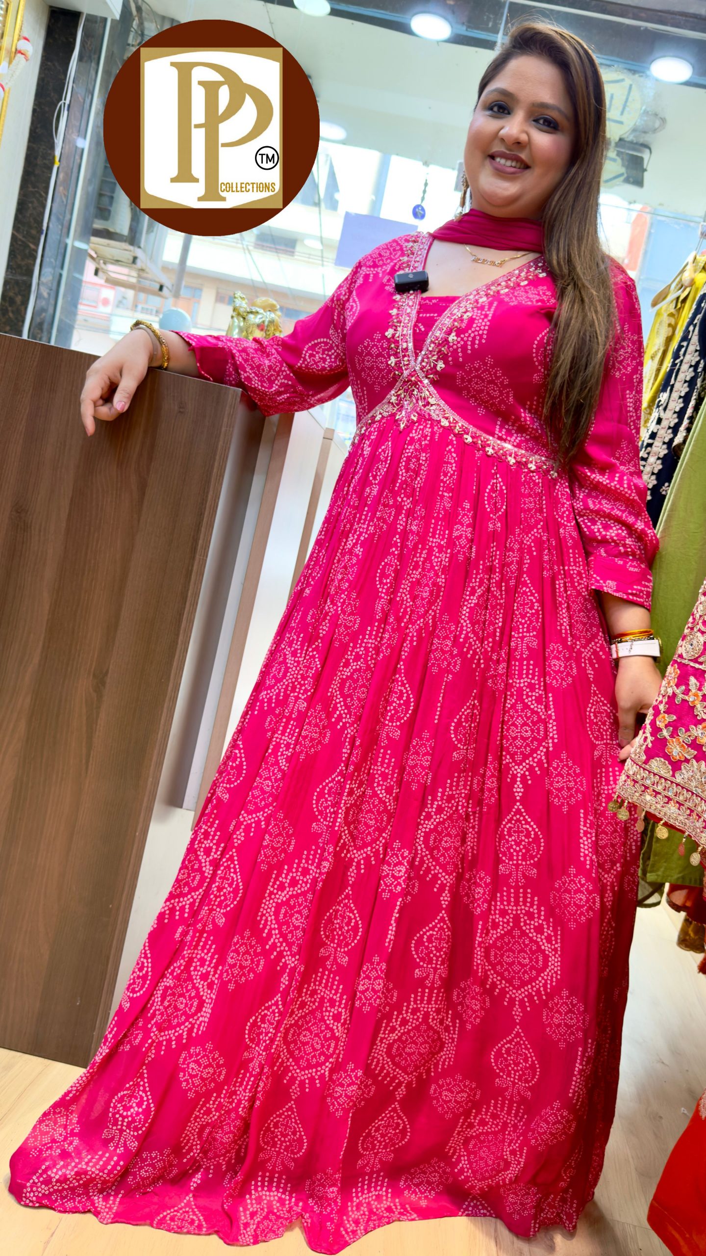 Description : 3piece Anarkali set Fabric Type : Chinon Style : Anarkali set with dupatta Work Type : Havey Hand and mirror with digital print Work With Matching pant and Dupatta.