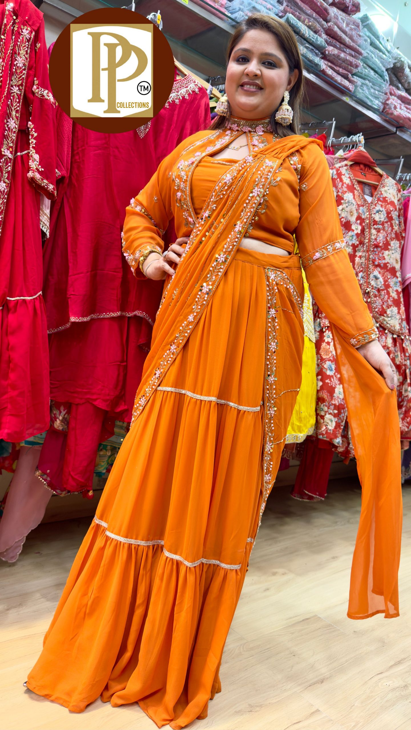 Description : 2piece Drape Set Fabric Type : Georgette Style : Blouse & Skirt Drap Sari Set Work Type : Full Havey Hand Work With Matching Choker Style Neckless.