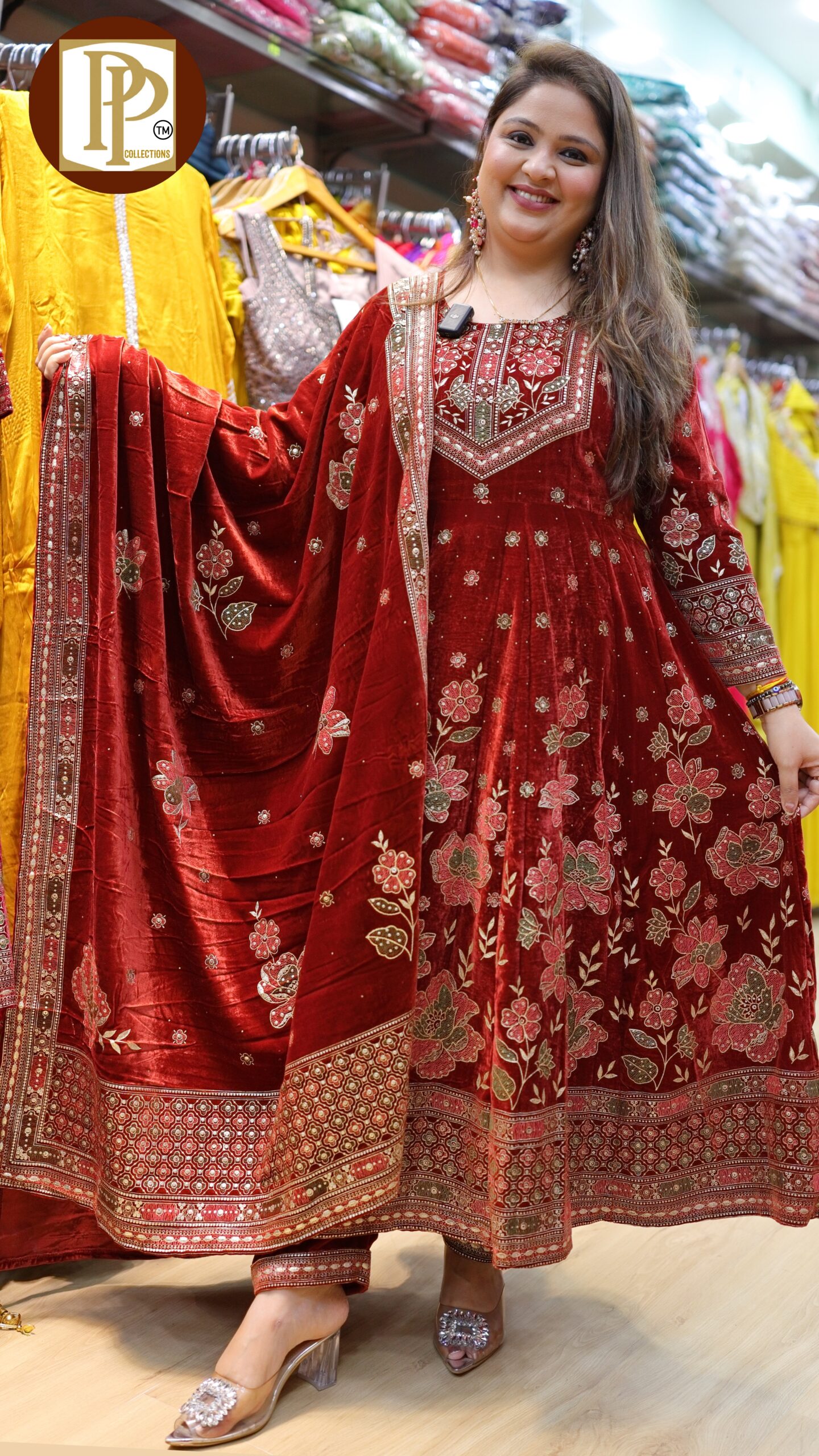 Description : 3pcs Anarkali set Fabric Type : velvet Style : shawl with Anarkali Work Type : full emboss print in an Anarkali & matching shawl and pants . B001 B009