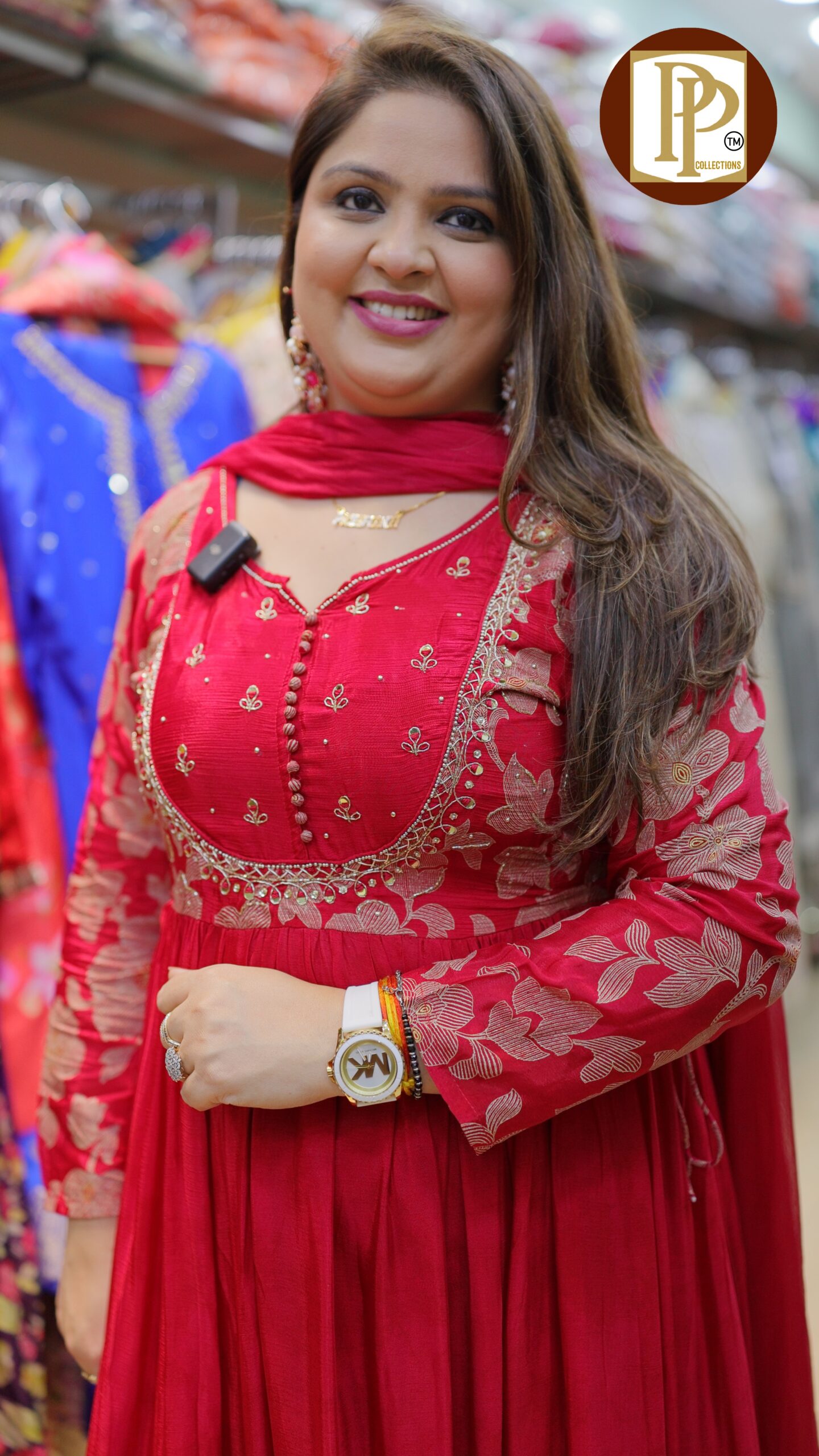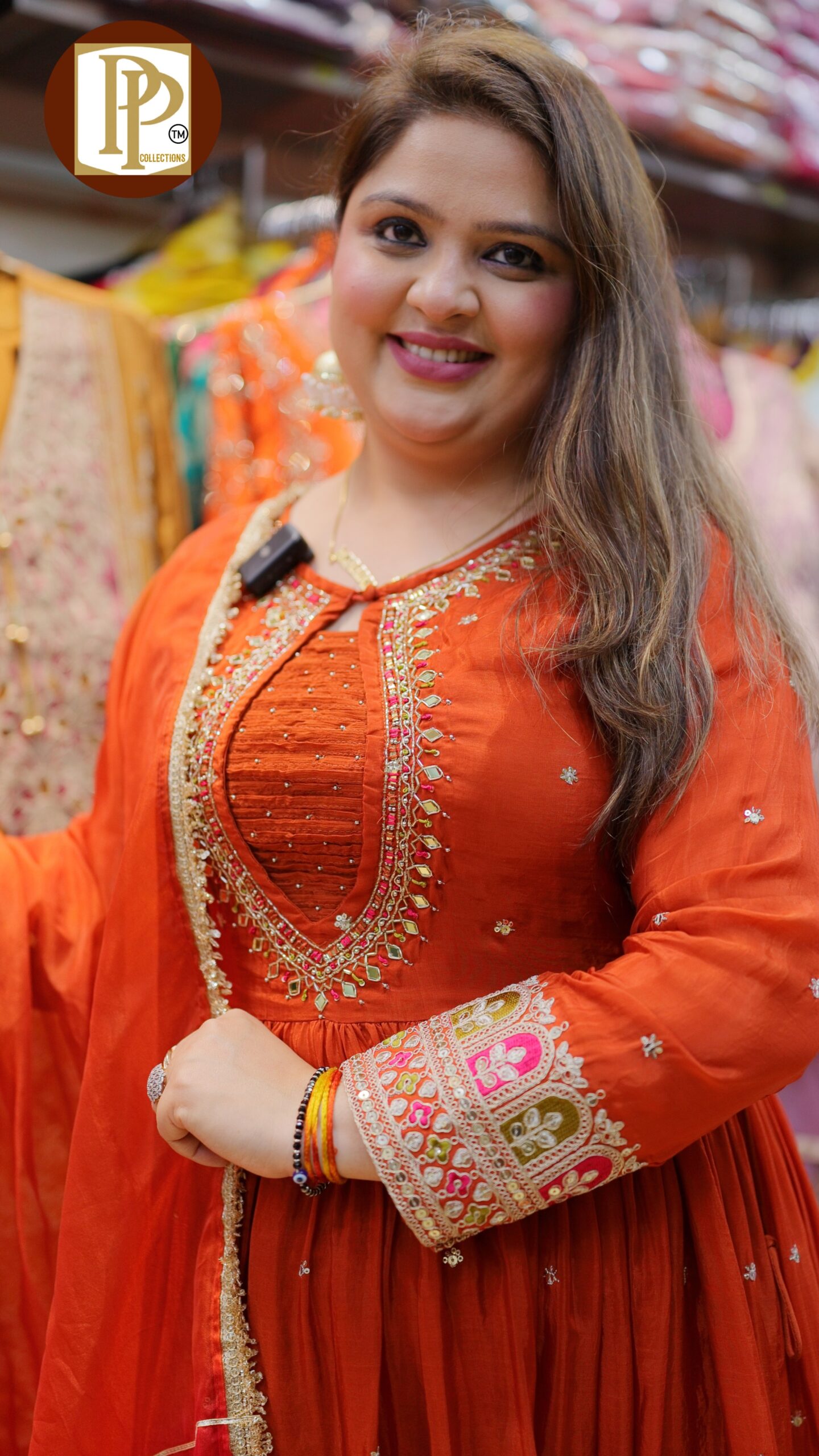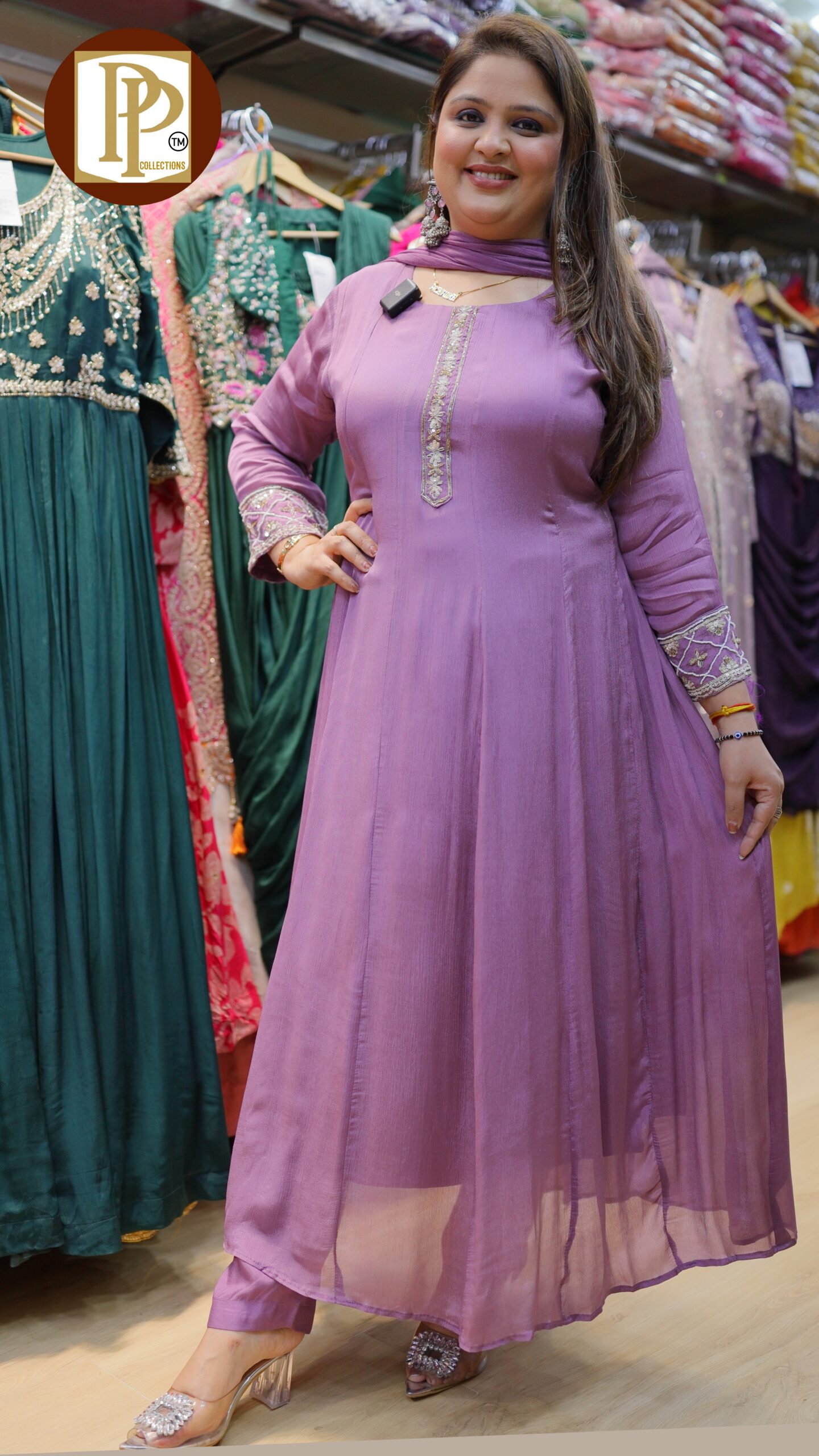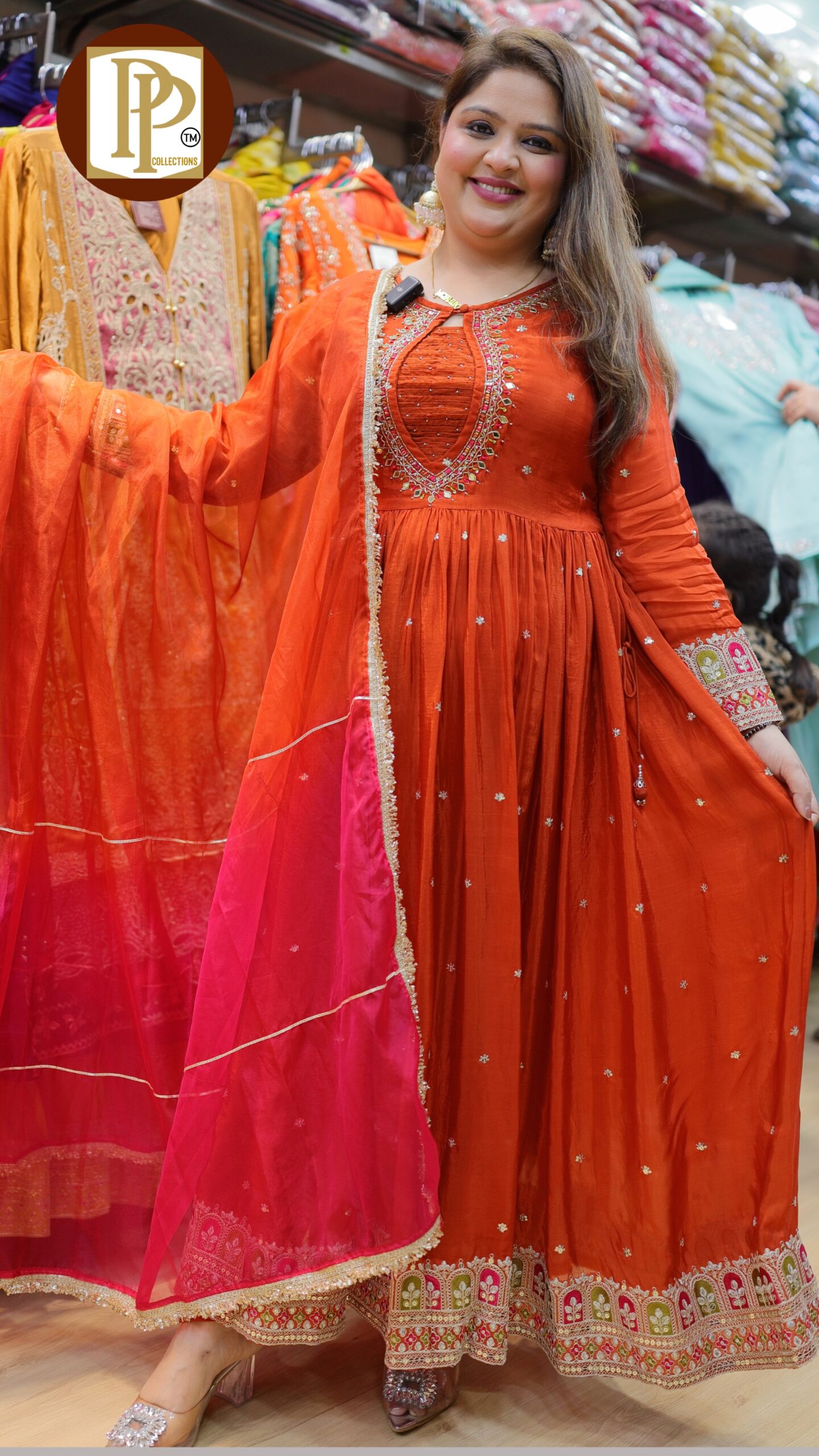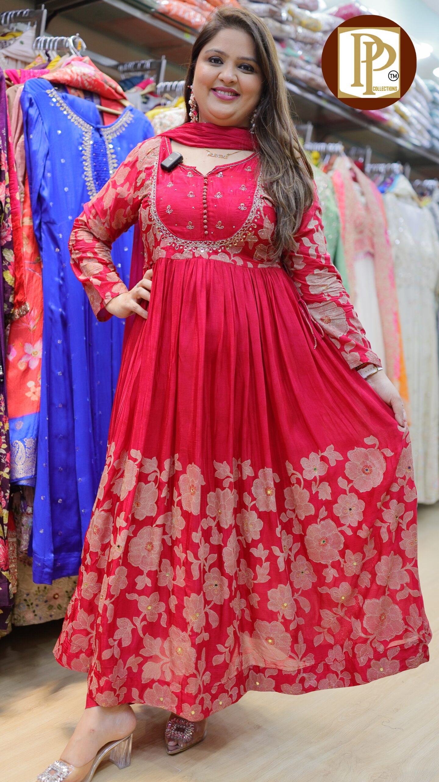 Description : 3pcs anarkali set Fabric Type : chinnon Style : anarkali with pants Work Type :heavy handwork in anarkali with digital printed dupatta with Banarasi work .