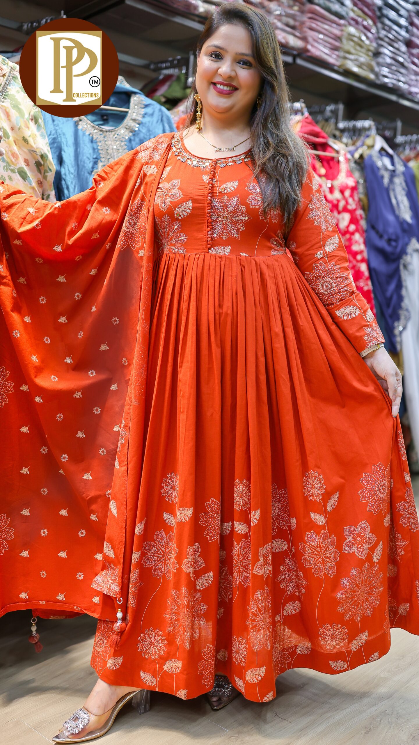 Description : 3pcs pant set Fabric Type : Cotton Style : Aline anarkali with pants  Work Type : all over printed Full threadwork in anarkali both side pocket with matching pants & dupatta . L106