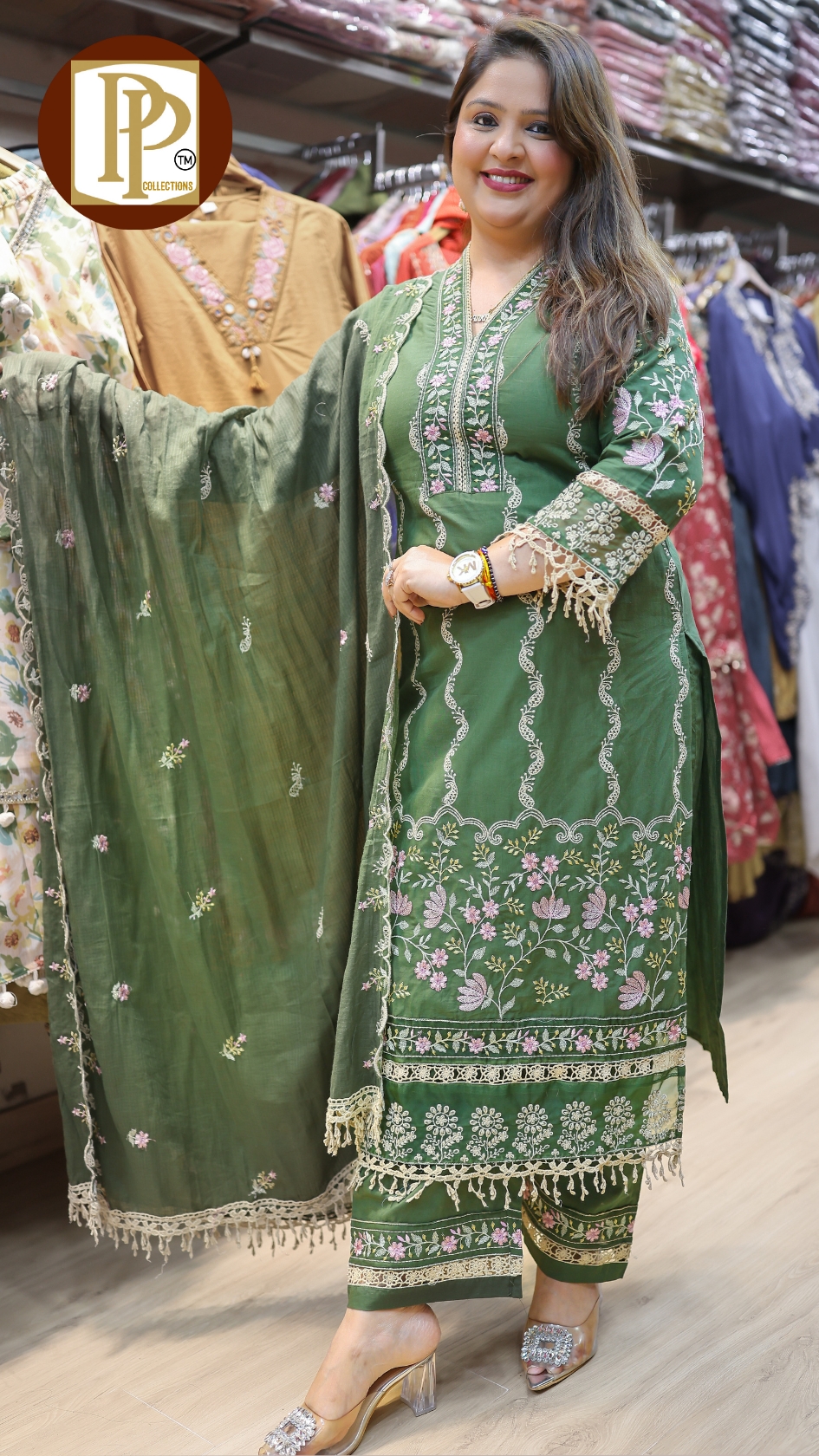 Description : 3pcs pant set Fabric Type : Cotton Style : Straight suit with pants Work Type :full heavy threadwork in kurta with matching pants & dupatta .   SA35 SA17