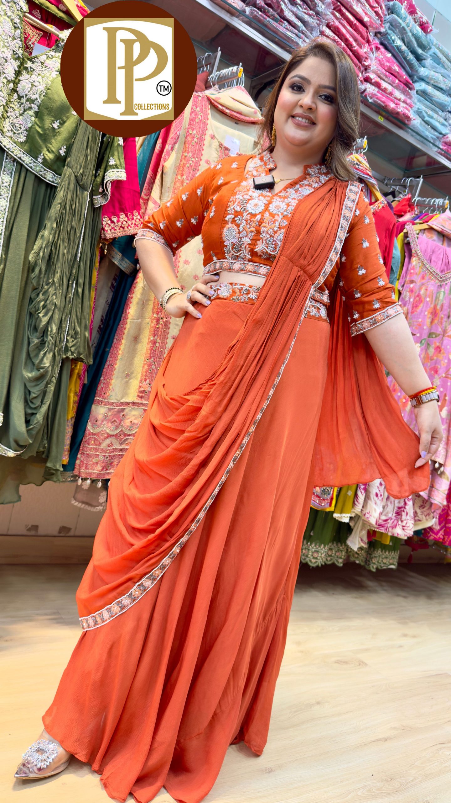 Description : 2piece Drape Sari Set Fabric Type : Chinnon Style : Drape Sari Work Type : Collar Pattern On Have Hand Work With Ready To Ware Sari.