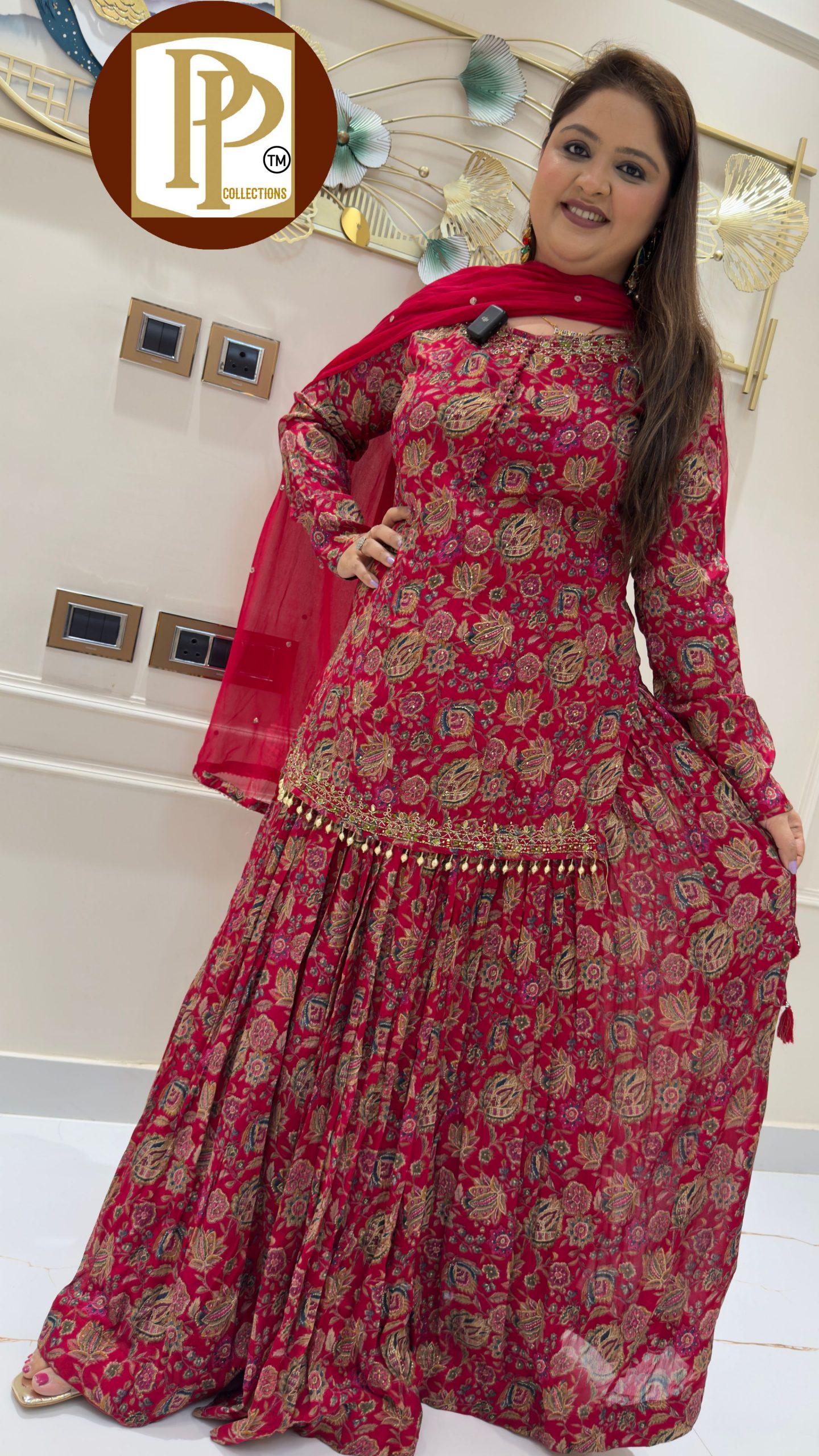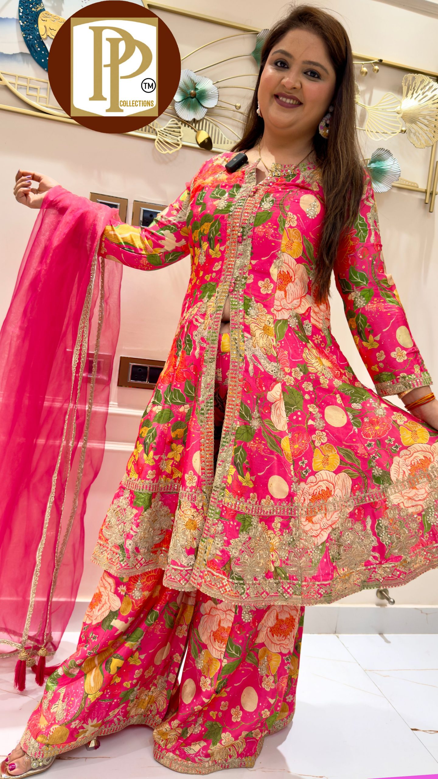 Description : 3piece Pant Set Fabric Type : Silk Style : Short Anarkali Set Work Type : Zari & Hand Work With Matching Printed Dupatta.