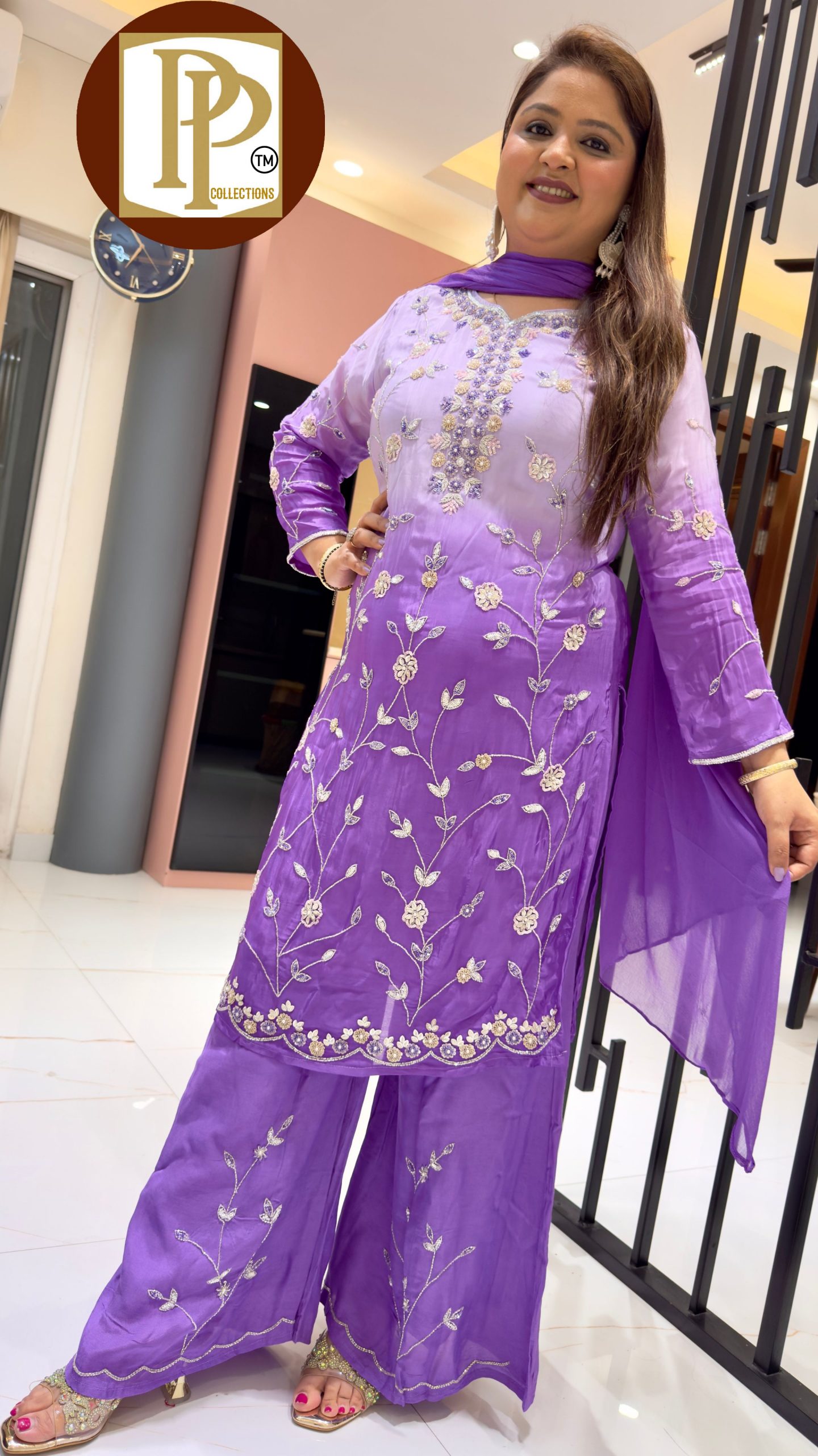Description : 3piece Plazzo Set Fabric Type : Organza Style : Straight Set Work Type : Thread & Pearl Work With Matching Dupatta.