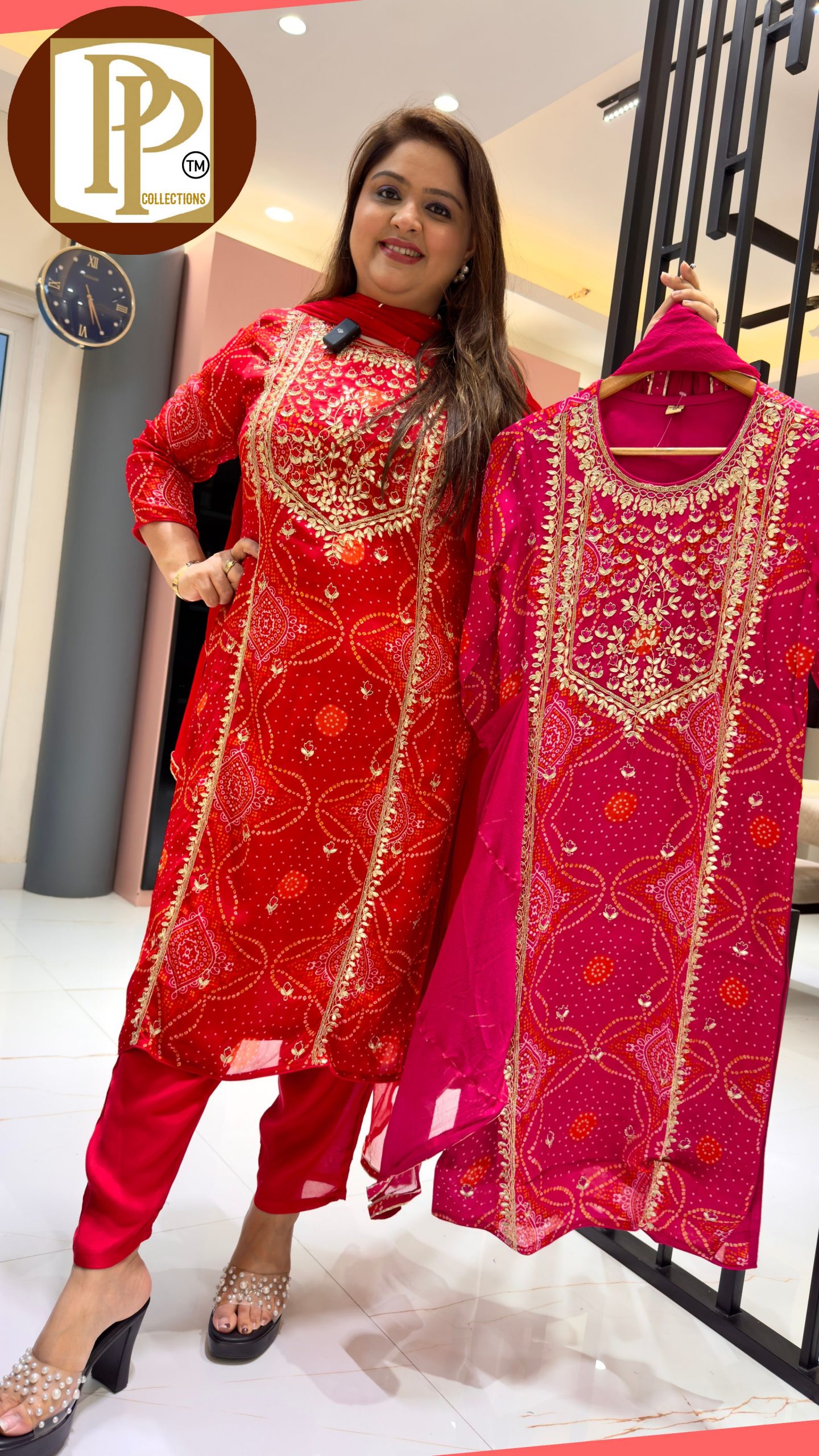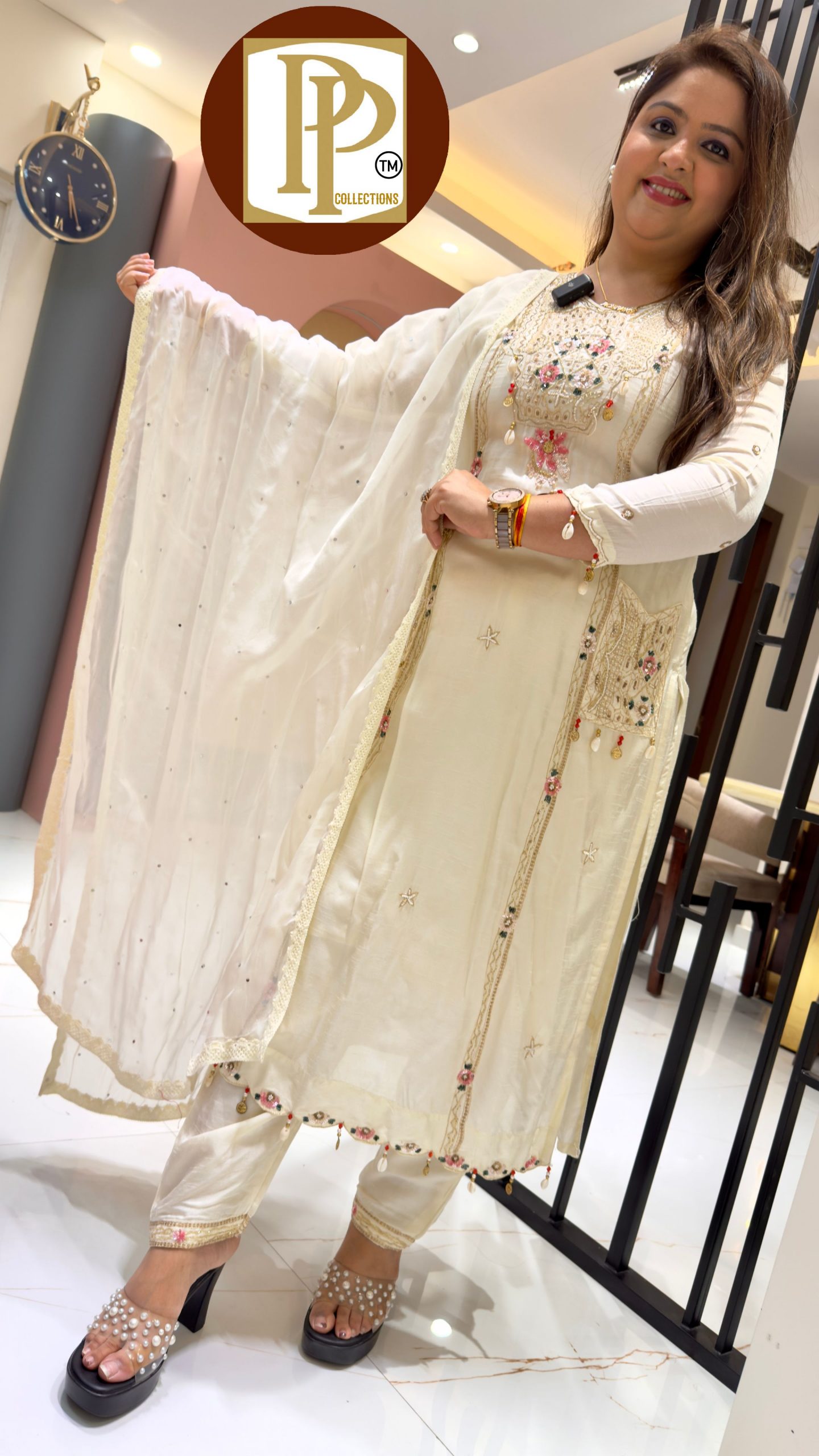 Description : 3piece Pant Set Fabric Type : Chinnon Style : Straight Set Work Type : Hand & Cut Dana Work With Matching Dupatta.