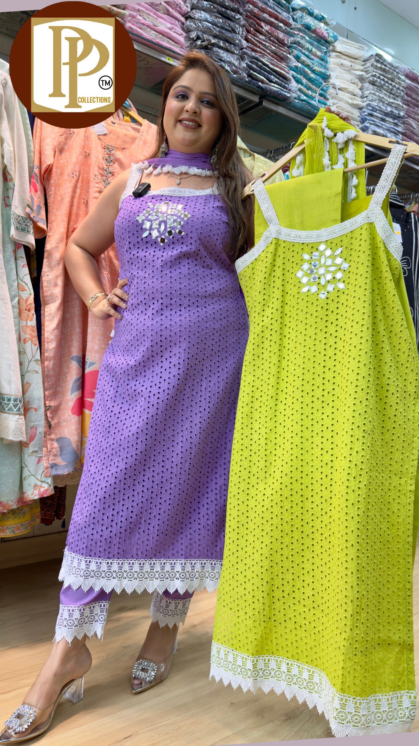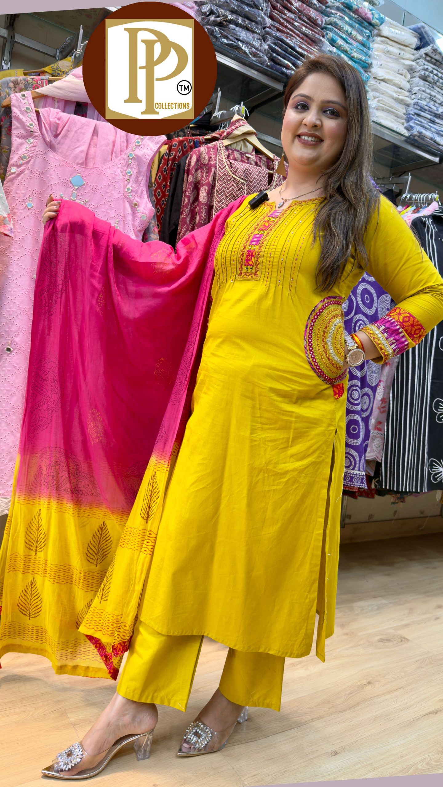 Description : 3piece Pant Set Fabric Type : Cota Doriya Cotton Style : Straight Set Work Type : Printed On Laces Work With Matching Dupatta.