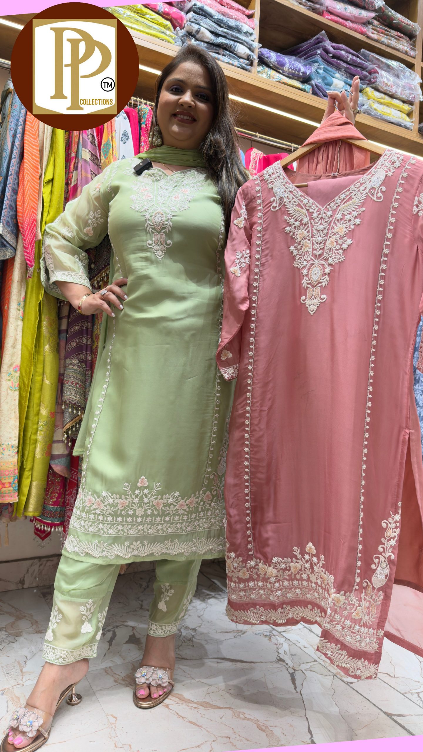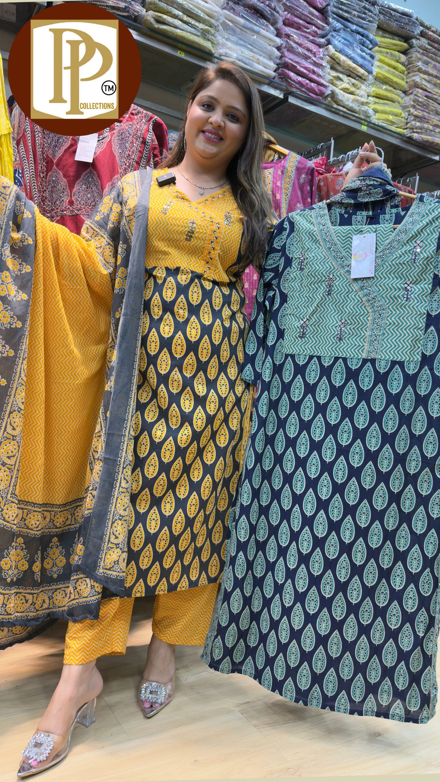 Description : 3piece Pant Set Fabric Type : Cotton Style : A-Line Work Type : Hand & Patch Print Work With Matching Printed Dupatta.