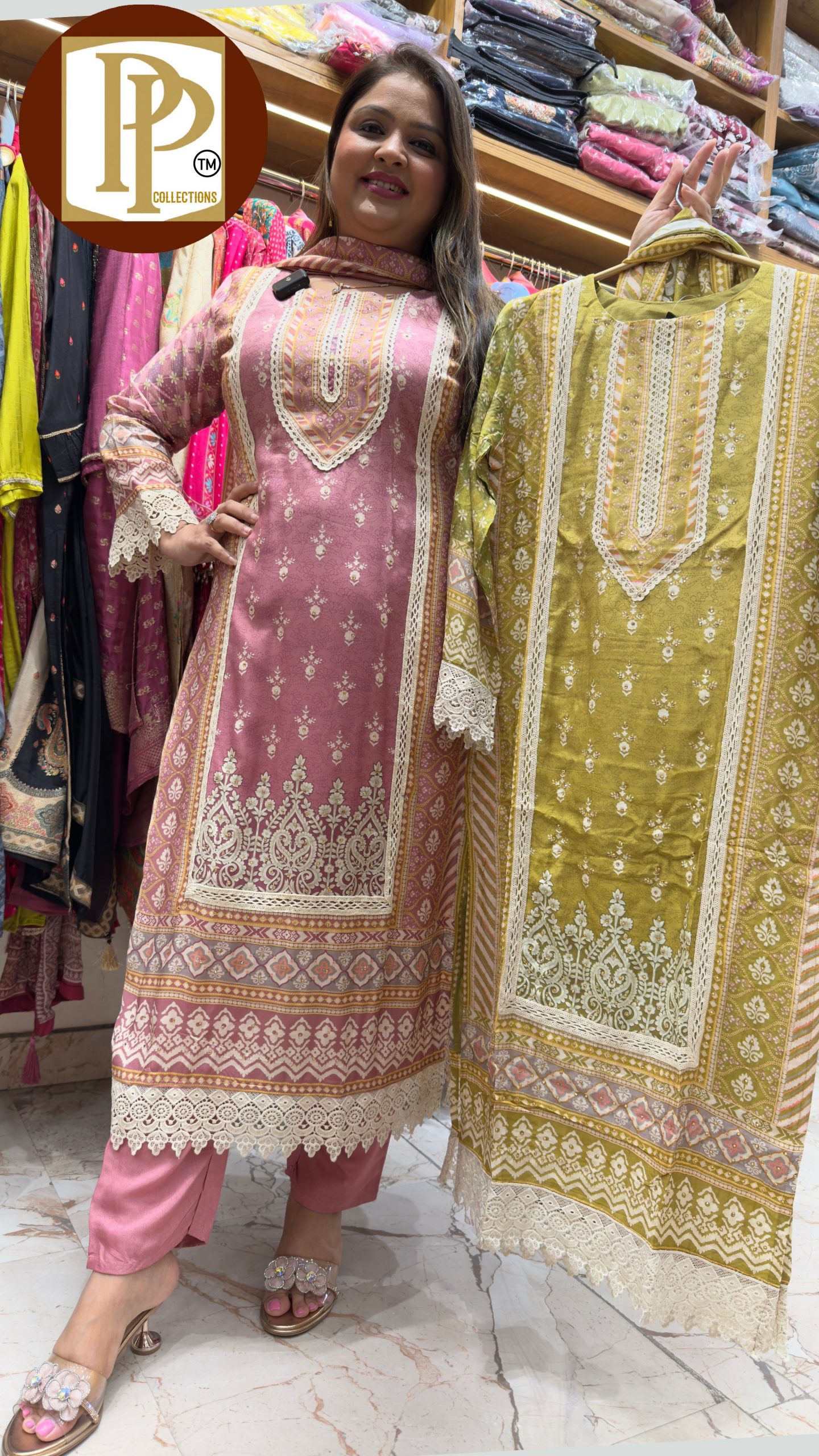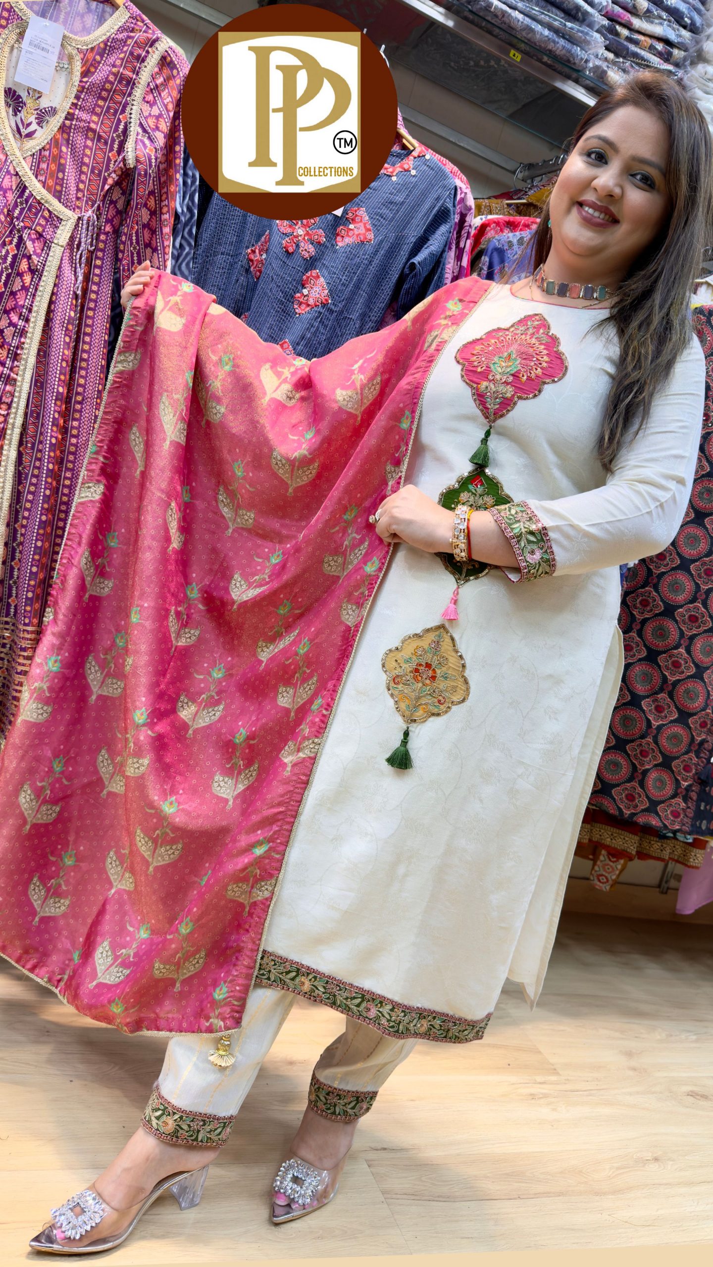 Description : 3piece Pant Set Fabric Type : Dola Silk Style : Straight Set Work Type : Cut Dana Original Mirror & Hand Work With Matching Banarasi Dupatta.