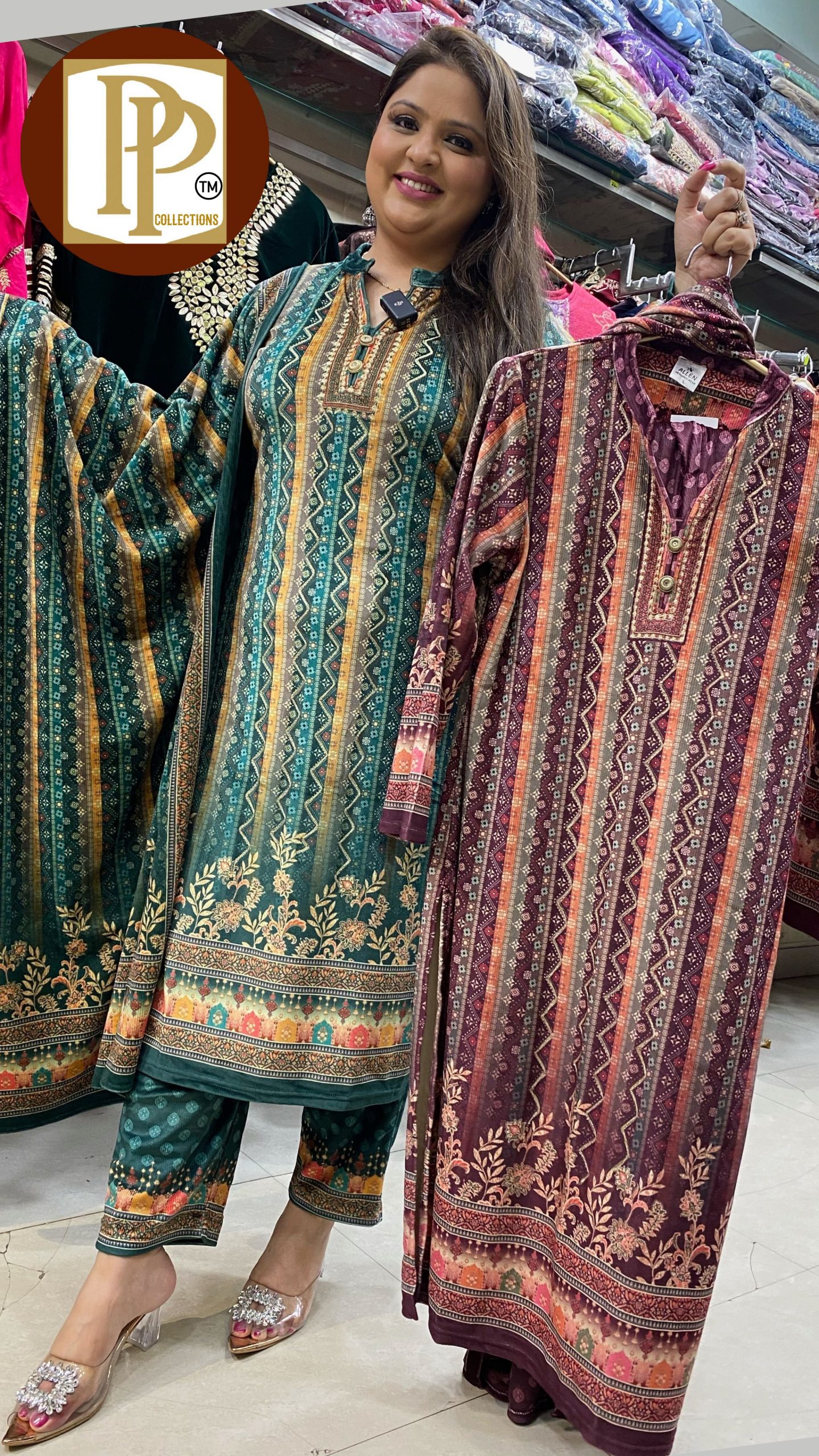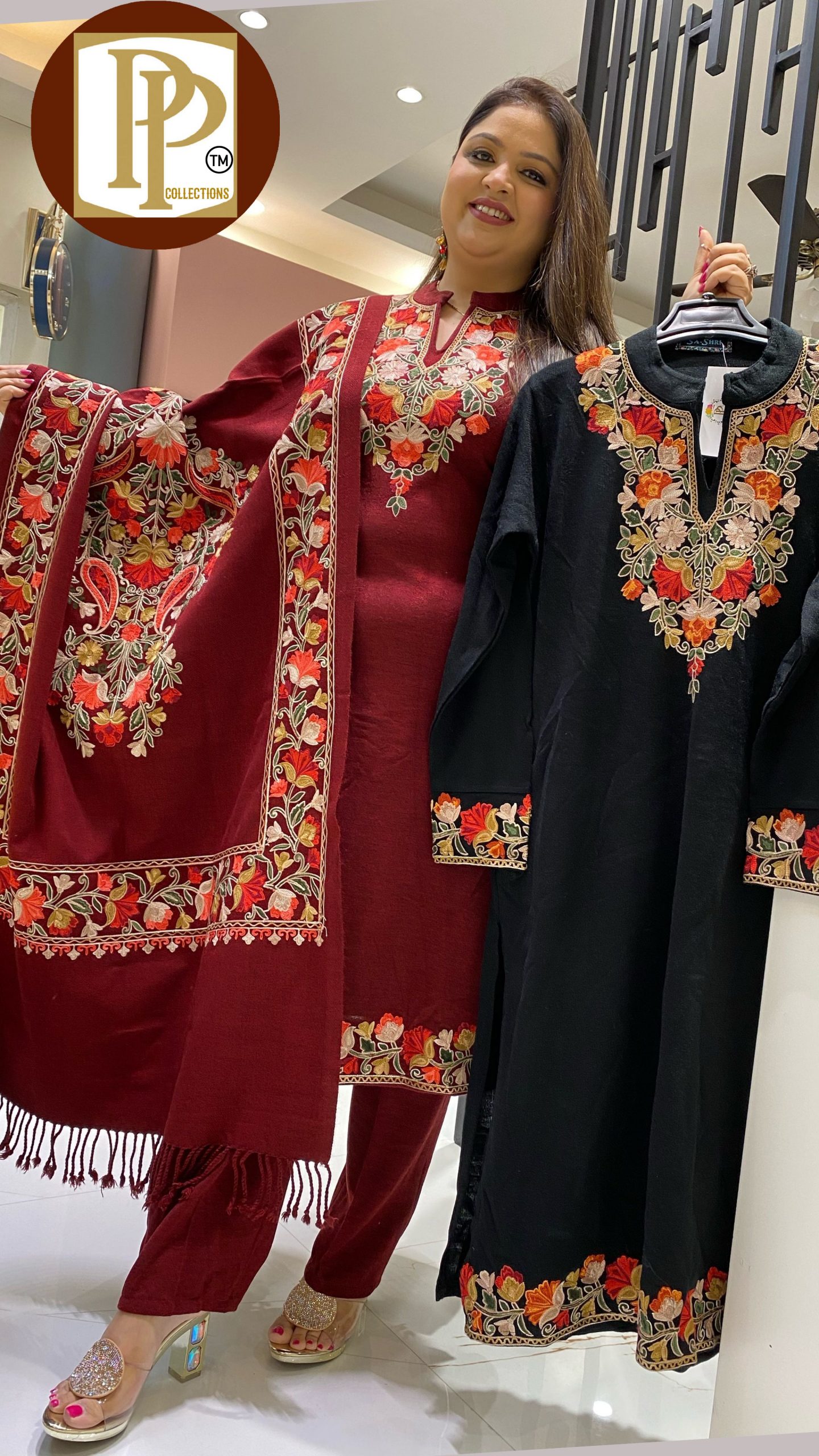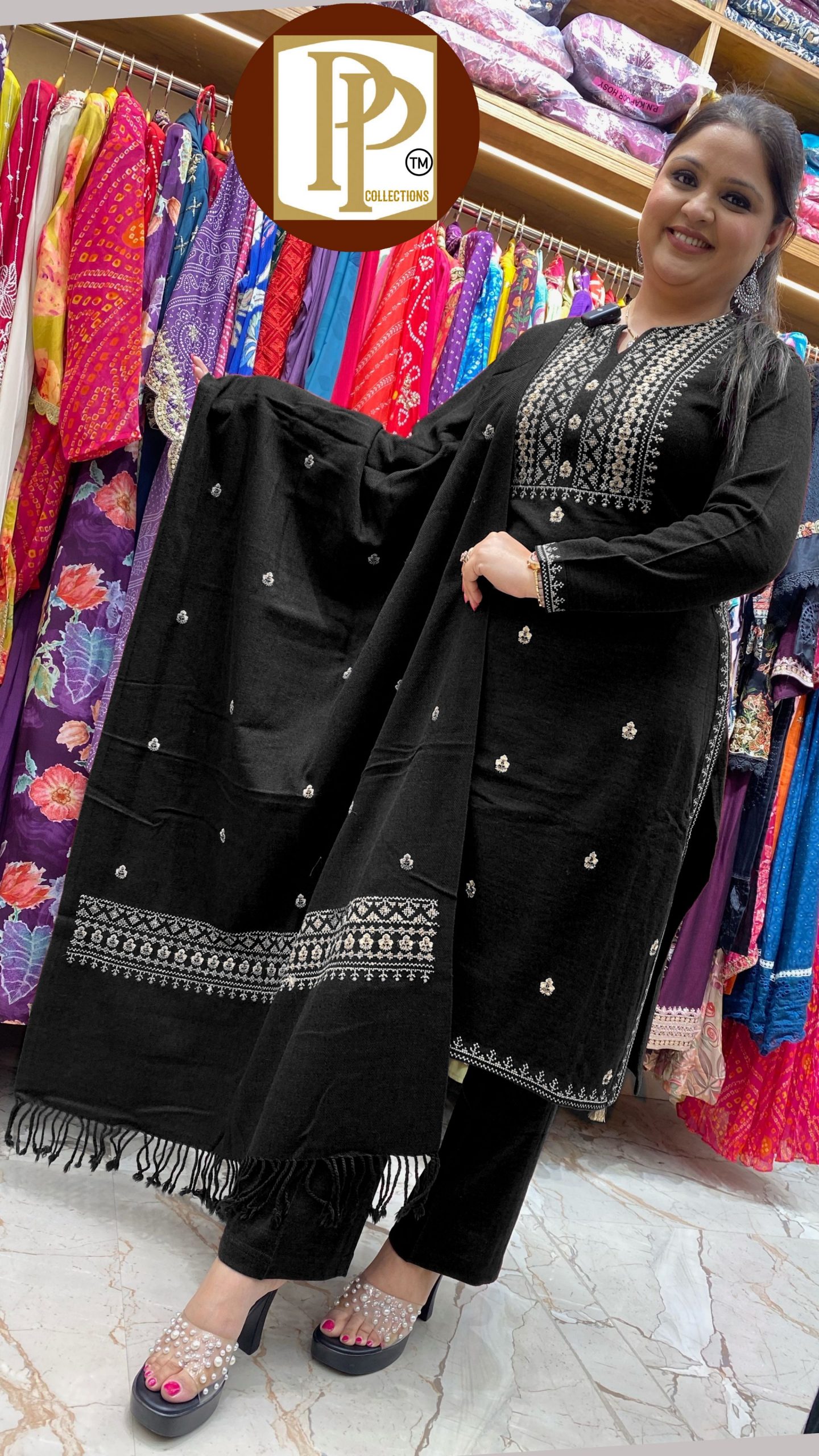 Description : 3piece Pant Set Fabric Type : Woollen Style : Stright Set Work Type : Full Thread Work With Matching Dupatta.