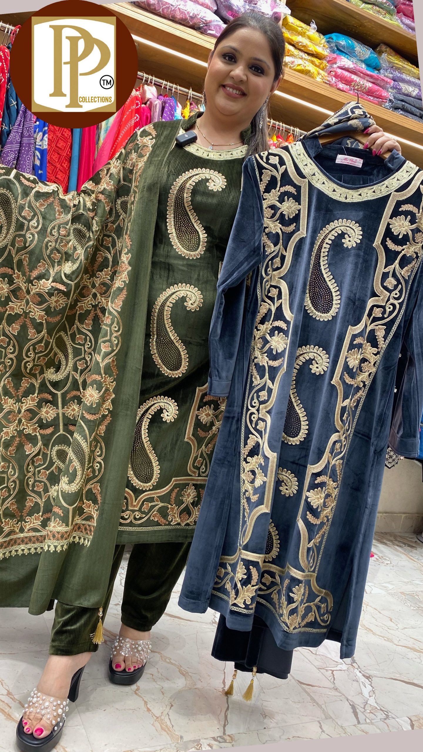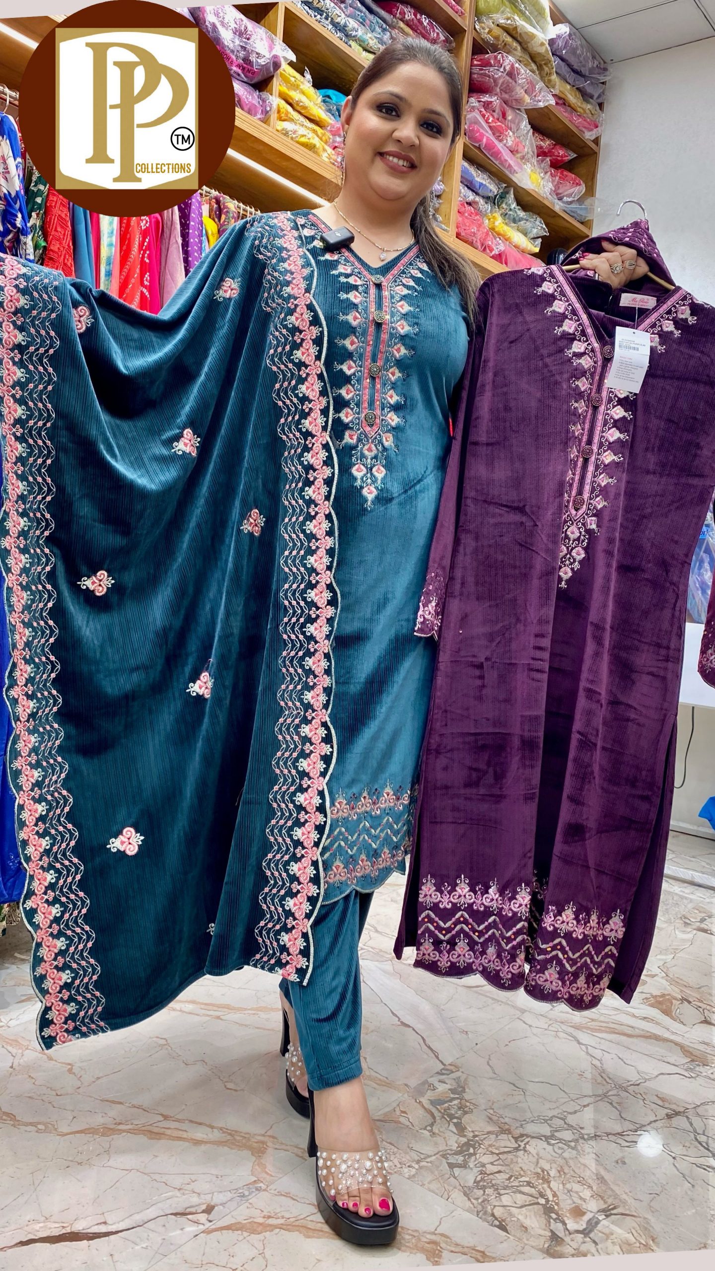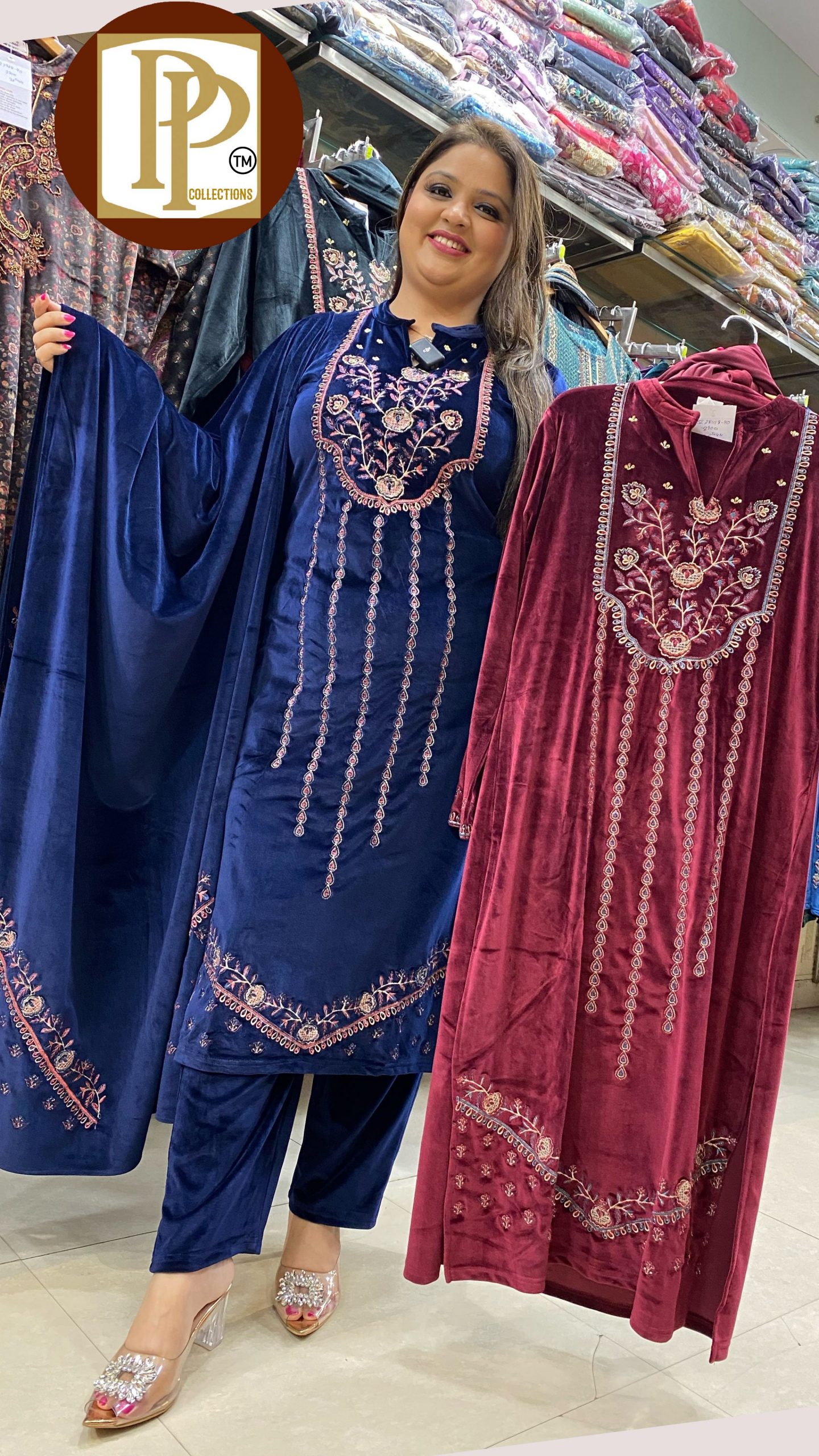 Description : 3piece Pant Set Fabric Type : Velvet Style : Stright Set Work Type : All Over Printed On Hand Work With Matching Shawl.