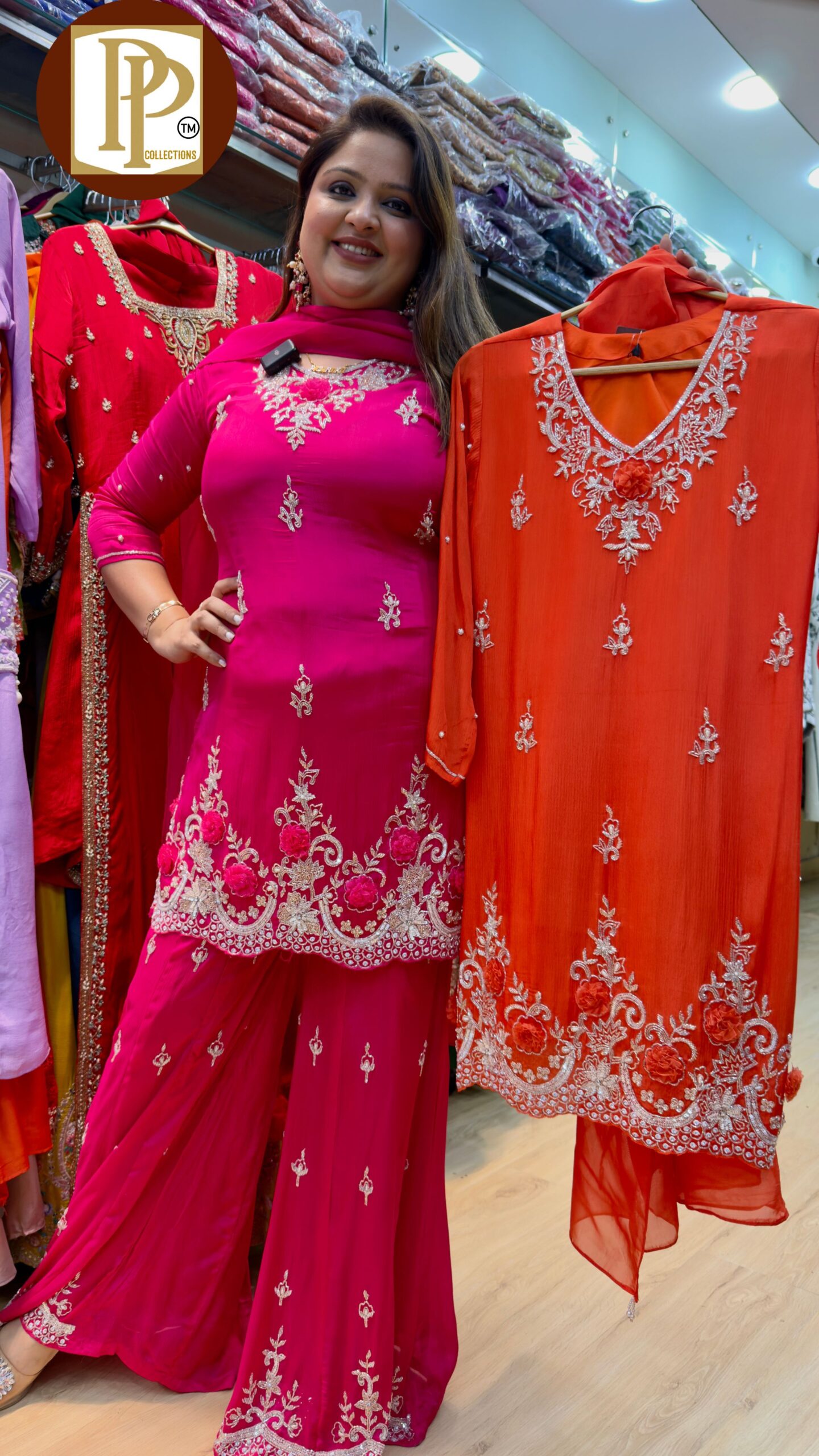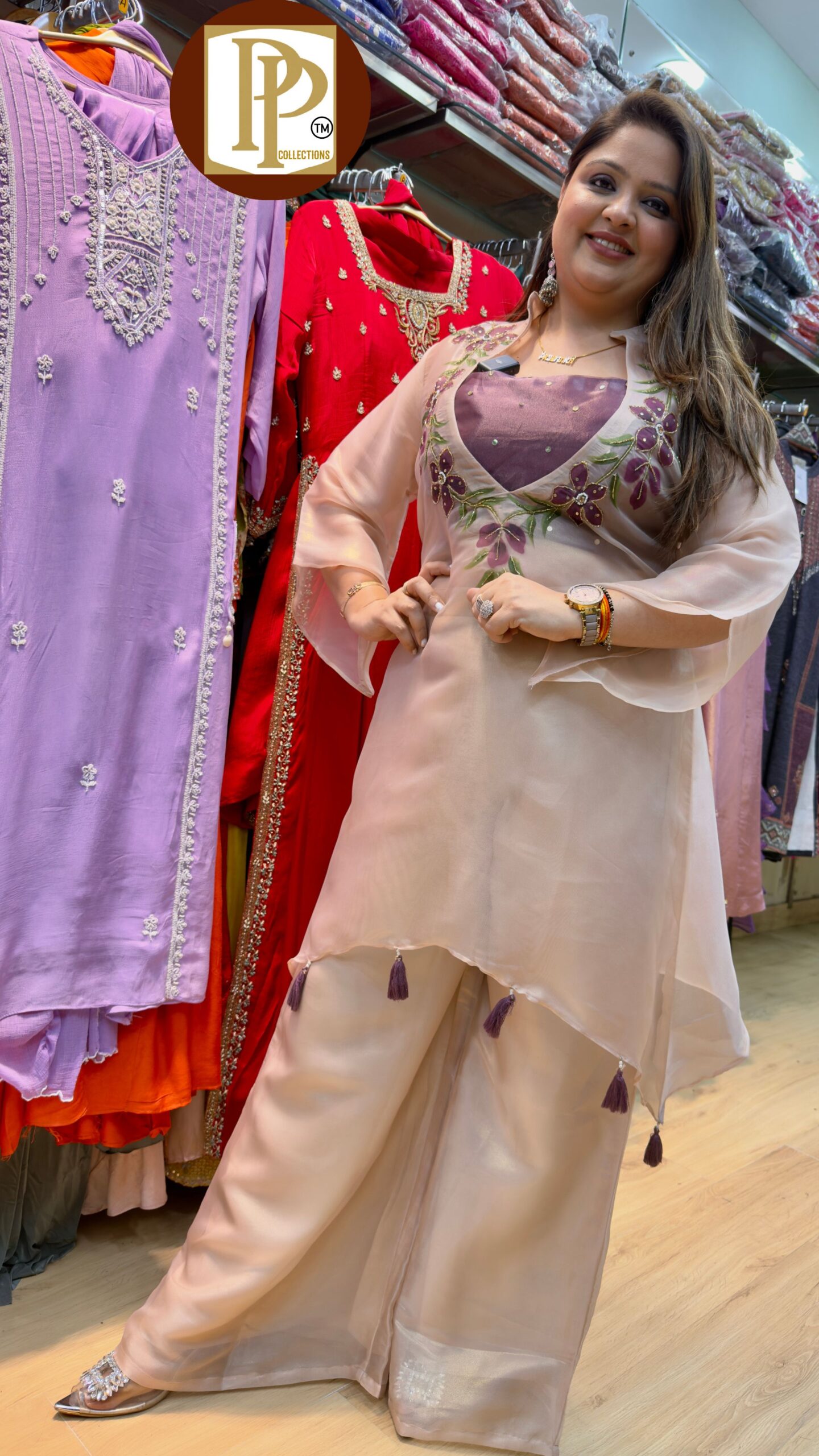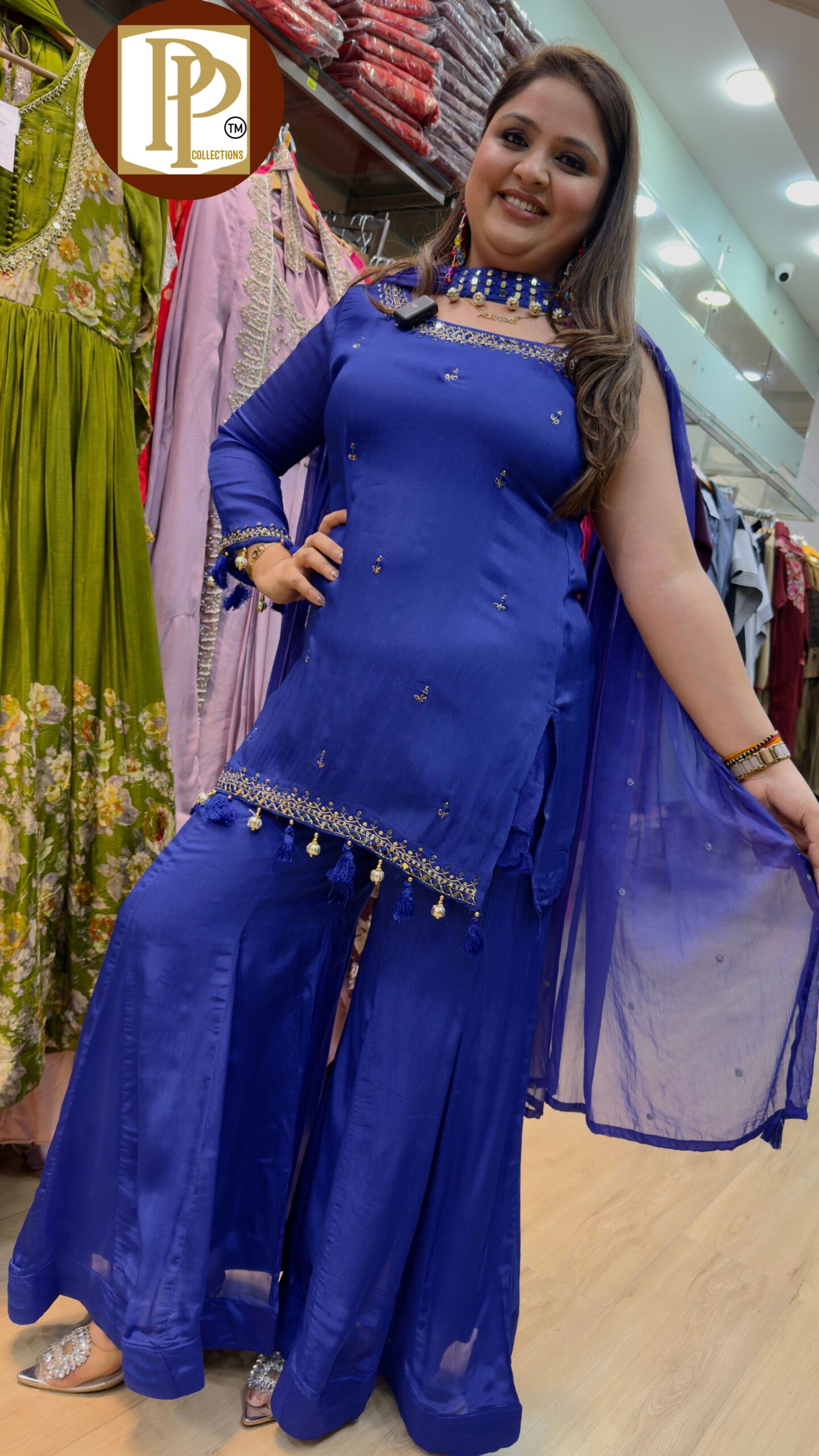 Description : 3pcs Plazzo Set Fabric Type : Fendi Style : Contracts Crop Top & Plazzo Set Bust Year Work Type : Pant Brush On Stone Work With Matching A-Line Detachable Kurta Shrug.