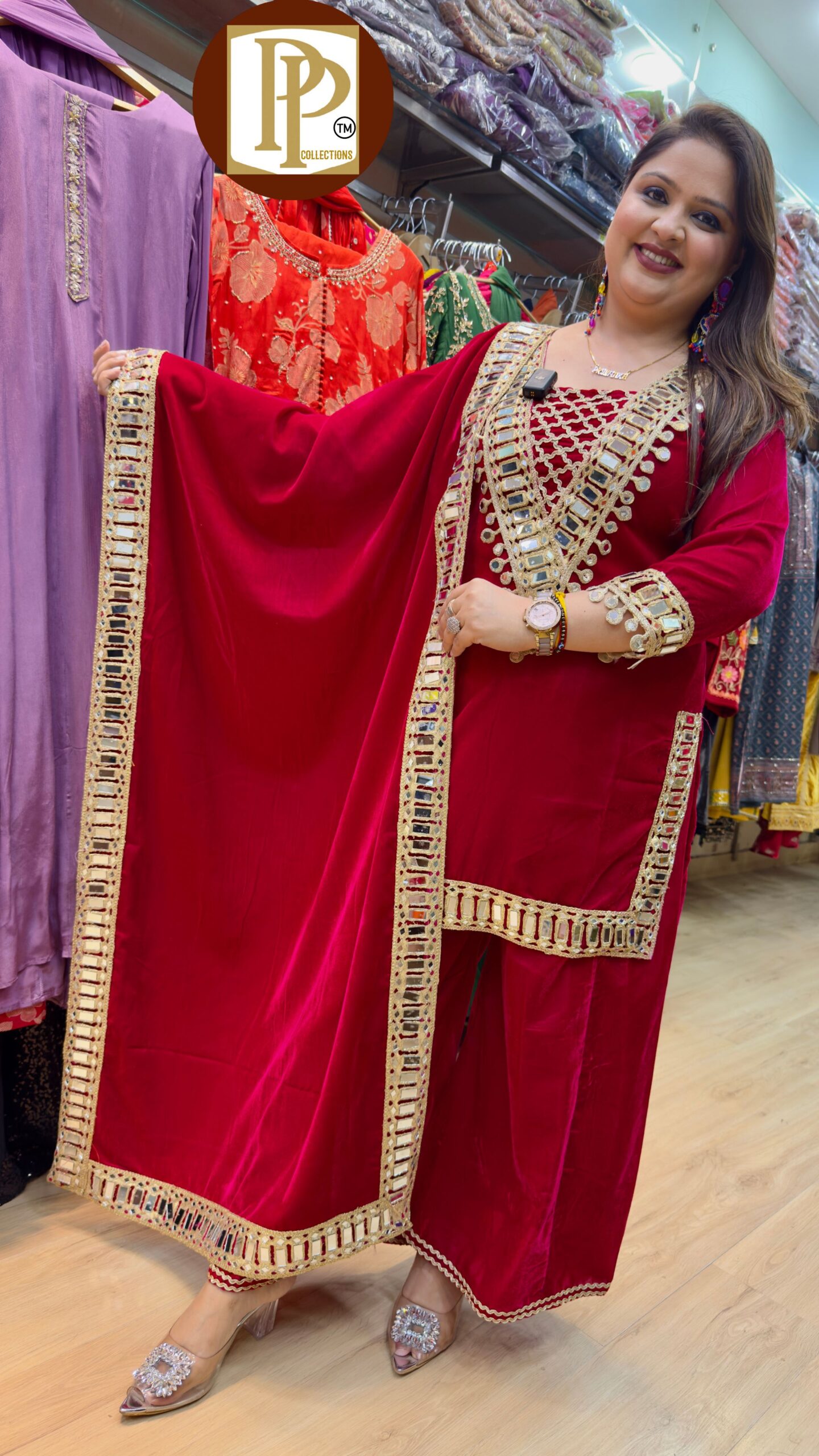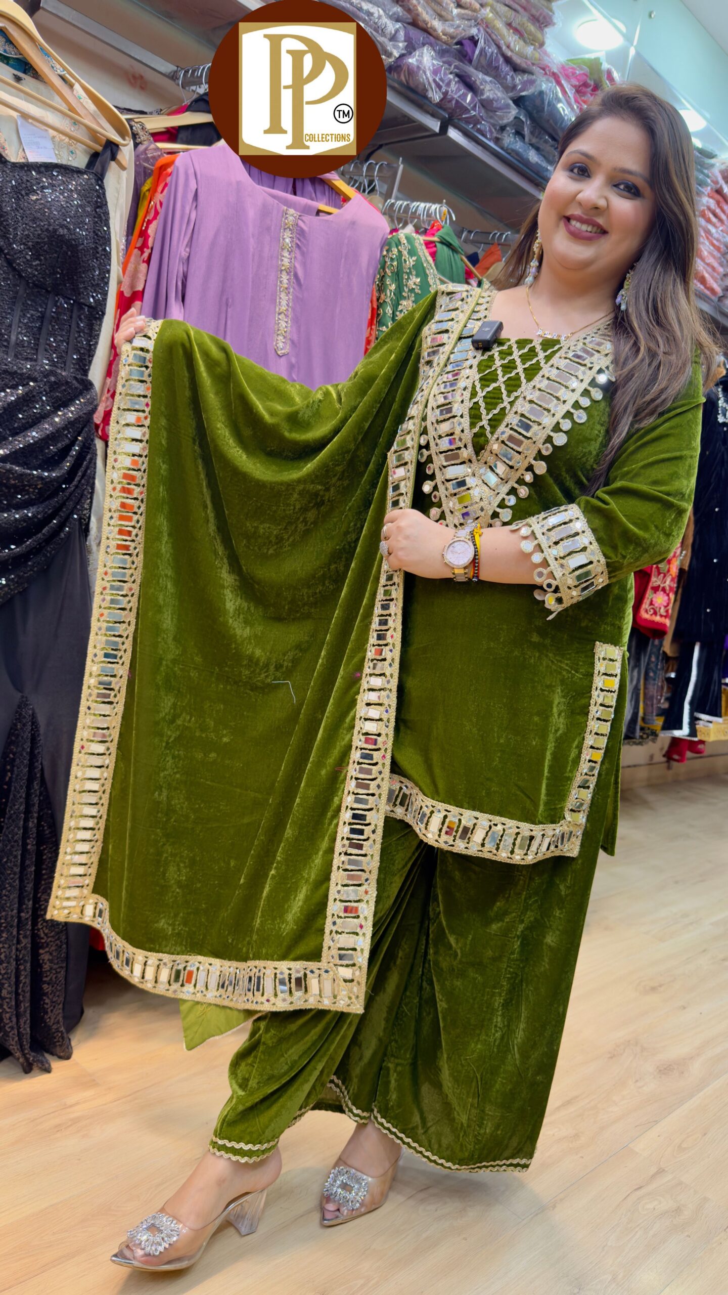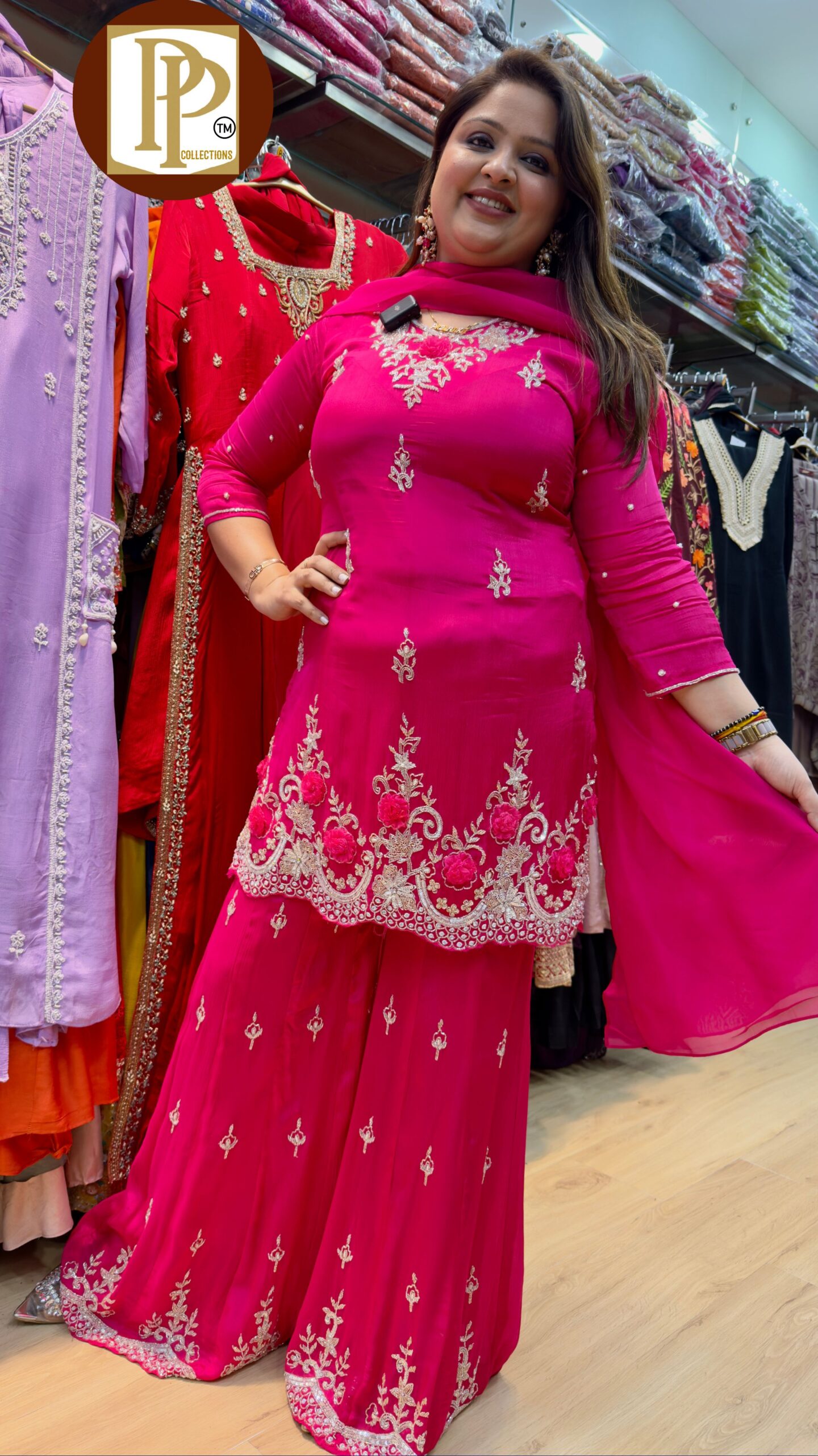 Description : 3pcs Plazzo Set Fabric Type : Fendi Style : Contracts Crop Top & Plazzo Set Bust Year Work Type : Pant Brush On Stone Work With Matching A-Line Detachable Kurta Shrug.