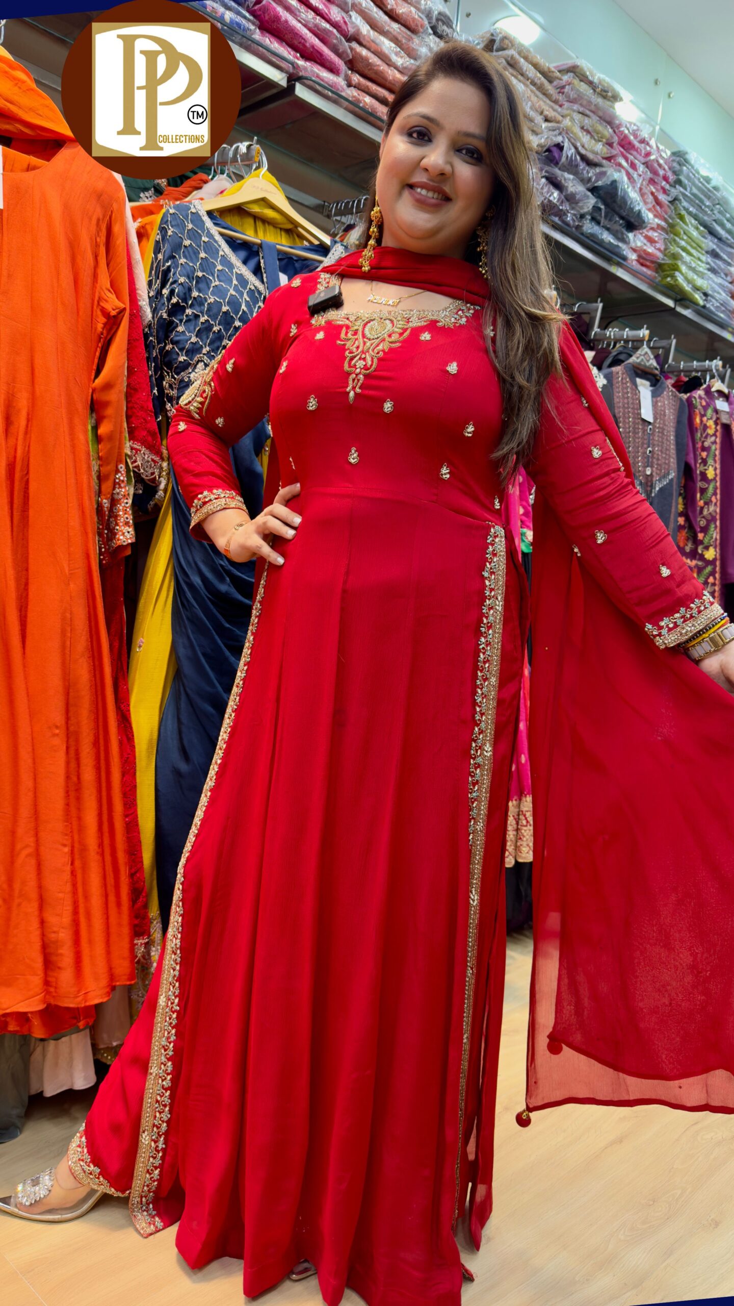 Description : 3pcs divider Set Fabric Type : Chinnon Style : aline Co-ord Sets Bustier Article Work Type : All Over Printed Hand Work Potli With Matching Detachable Jacket & choker neck dupatta .