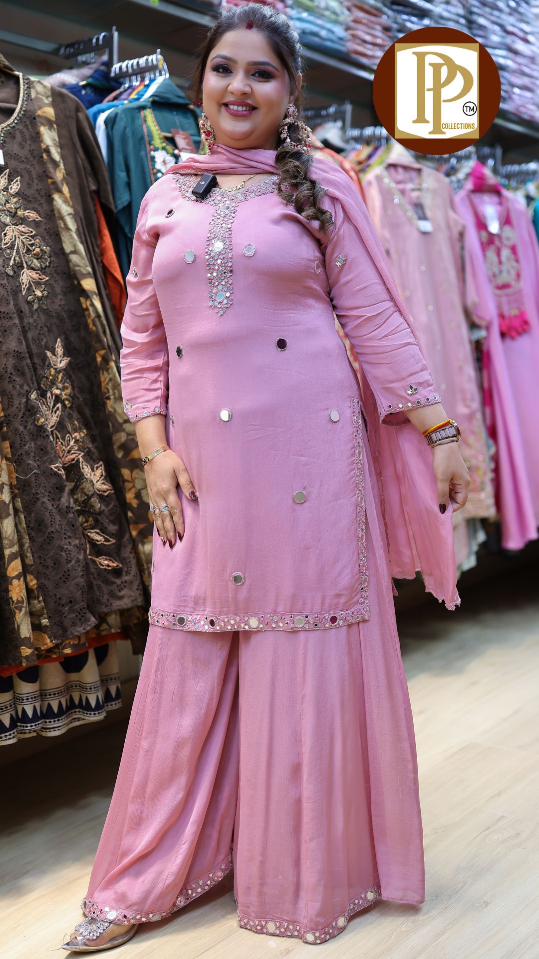 Description : 3pcs Divider set Fabric Type : Chinnon Style : Short kurta with Divider Work Type : Full heavy handwork original mirror work in kurta with Matching heavy Divider & dupatta. G843