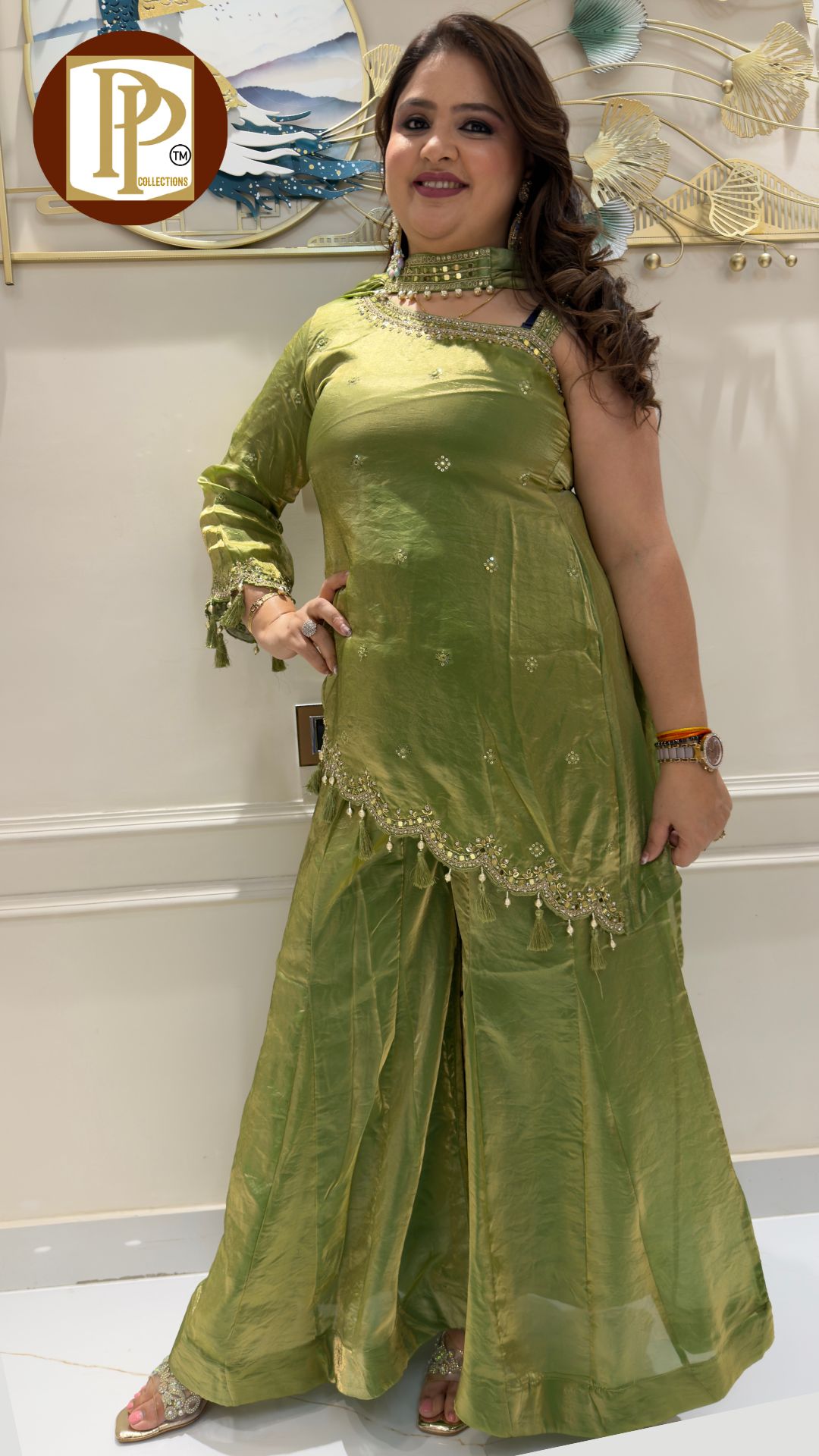 Description : 3pcs Divider set Fabric Type : Muslin Style : Kurta with Divider Work Type : Full heavy handwork threadwork Stone work Sipi work in kurta with matching Divider & Printed Dupatta. W137