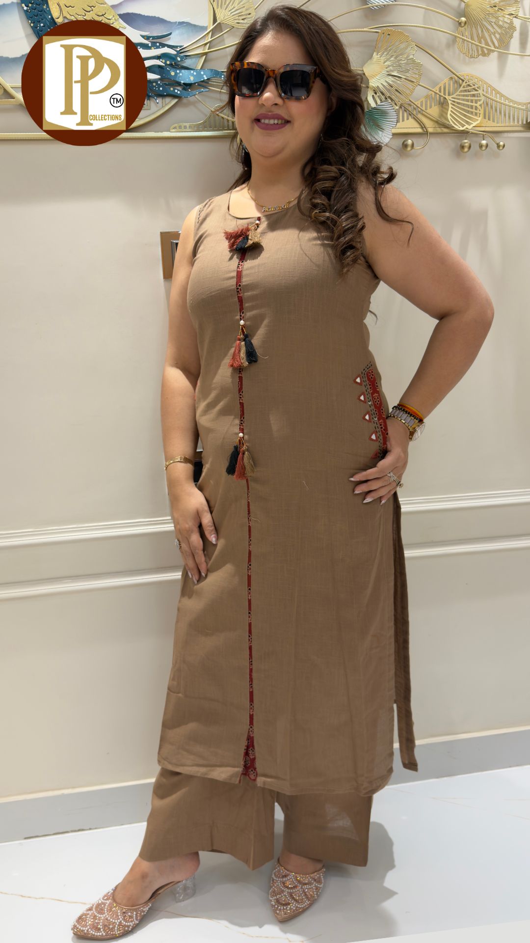 Description : 3pcs Divider set Fabric Type : Cotton Style : Aline kurta with Divider Work Type : Full heavy threadwork original mirror work in kurta Both Side pocket with matching Divider & Dupatta. Sz82
