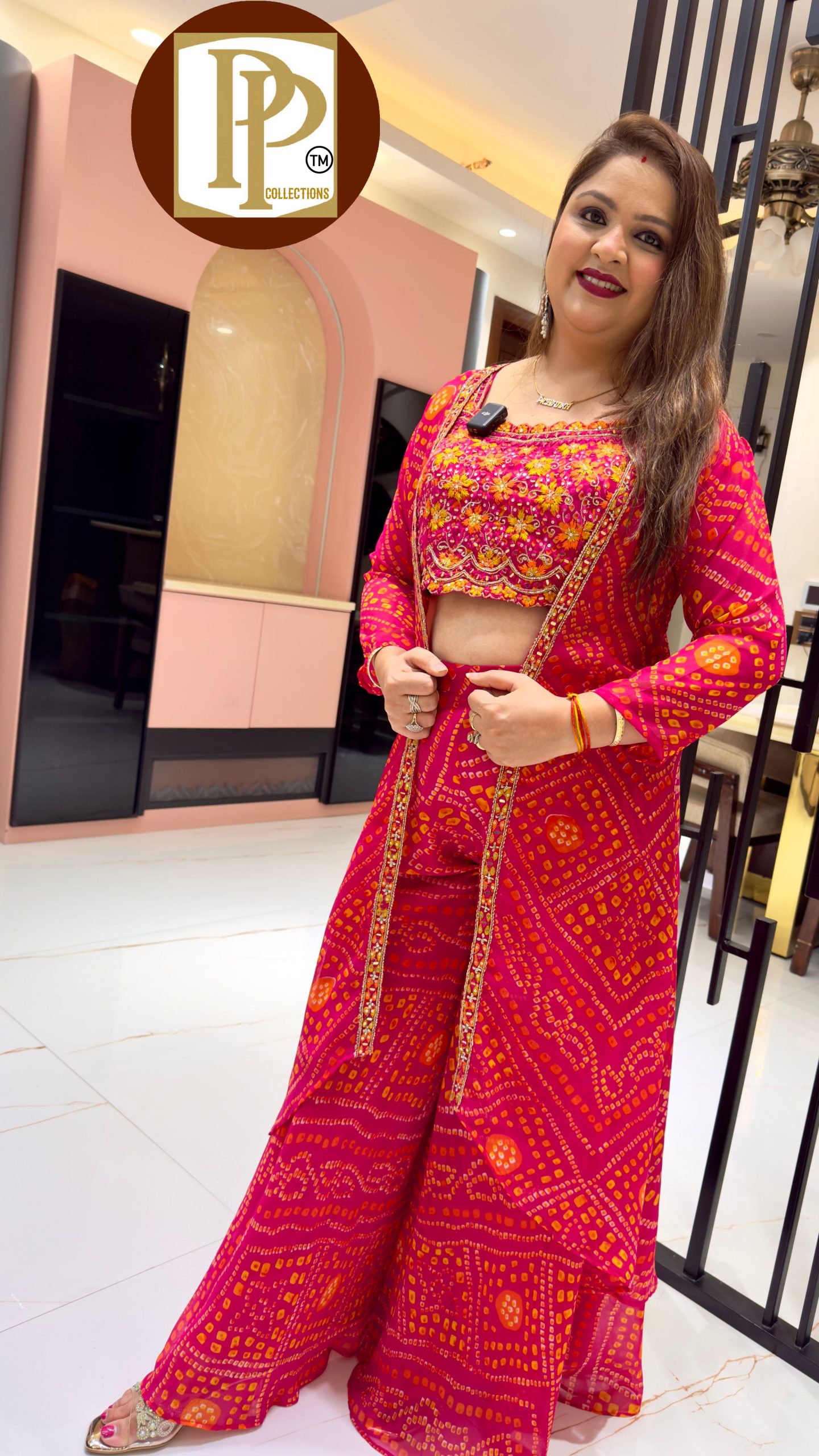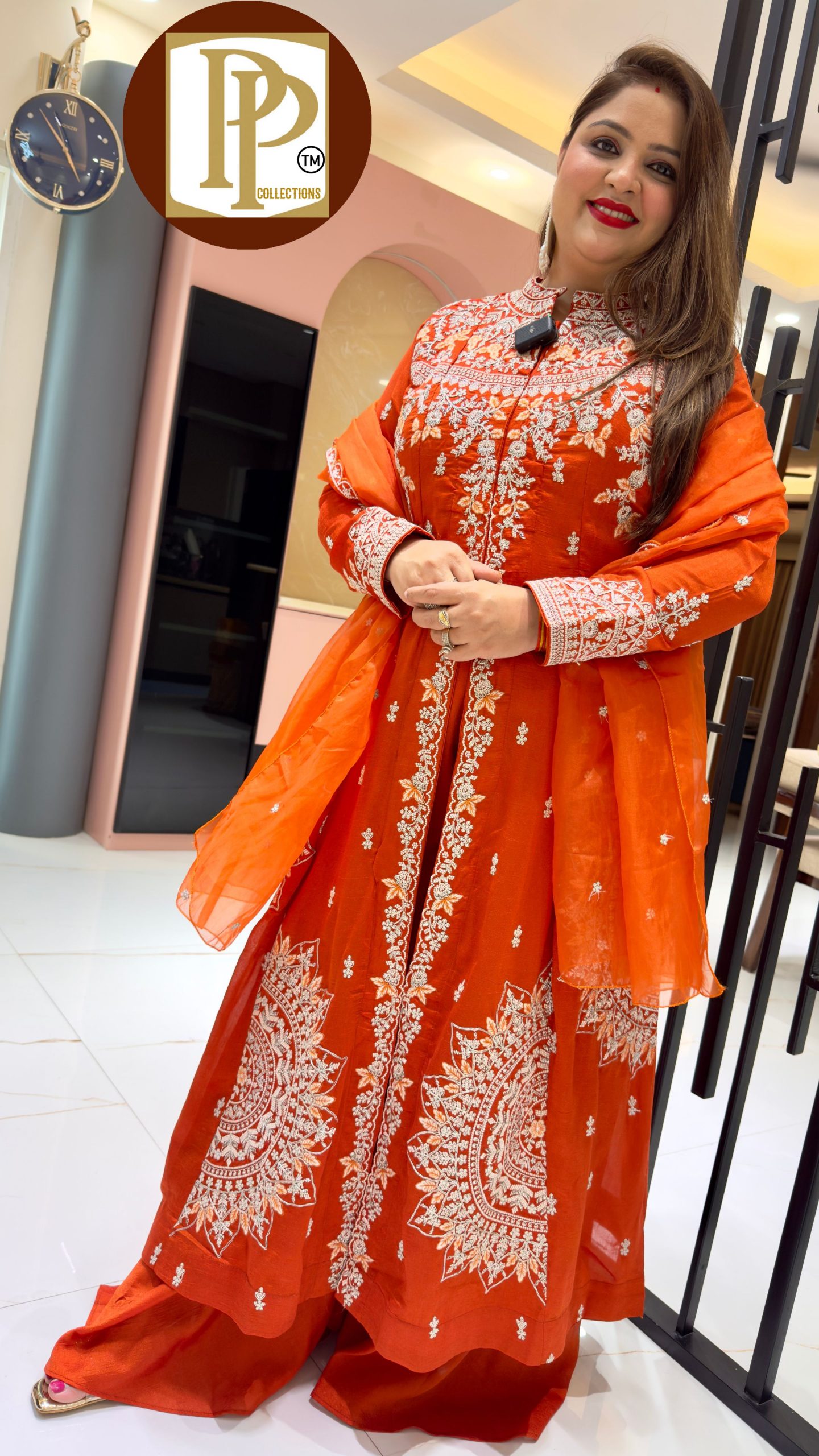Description : 3piece Plazzo Set Fabric Type : Vichitra Silk Style : Short Kurta & Plazzo Set Work Type : Full Have Thread & Zari Work With Matching Dupatta.