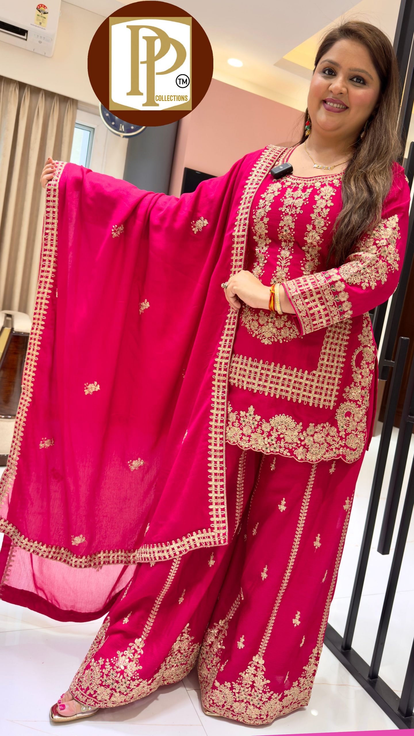 Description : 3piece Plazzo Set Fabric Type : Silk Style : Frint Slit Cut Work Type : Full Have Thread Work With Matching Net Choker Stye Dupatta.