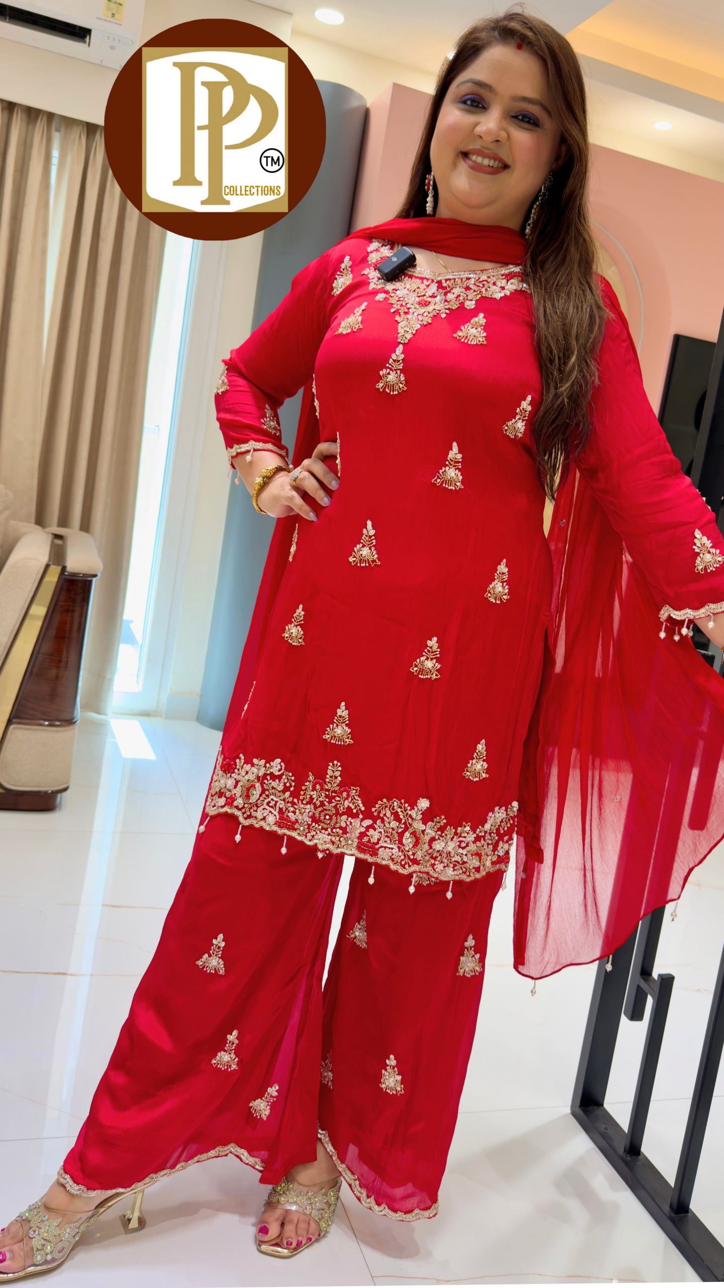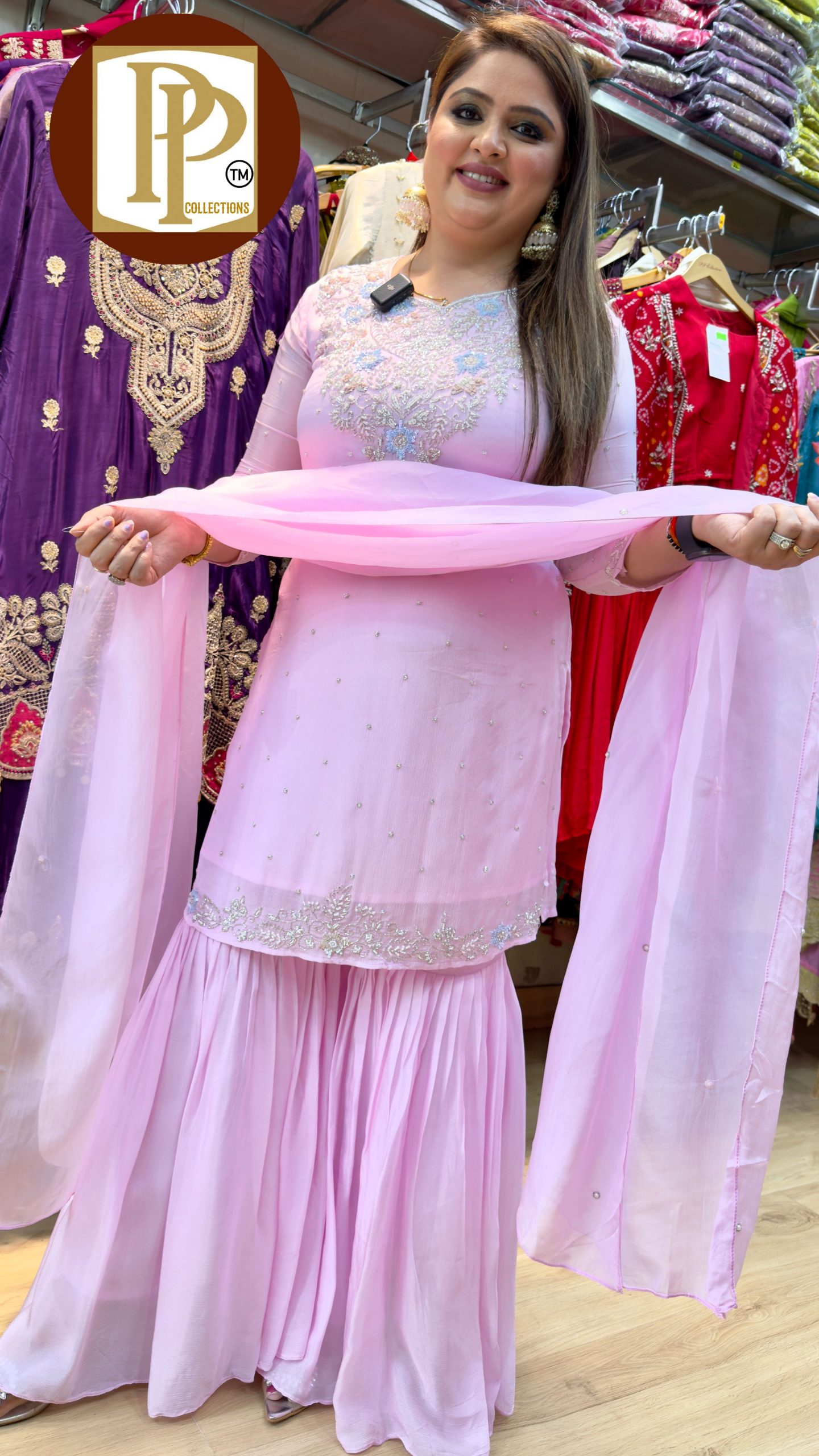 Description : 3piece Sharara Set Fabric Type : Crepe Style : Short Kurti & Sharara Set Work Type : Printed On Zari & Thread Work With Matching Dupatta.