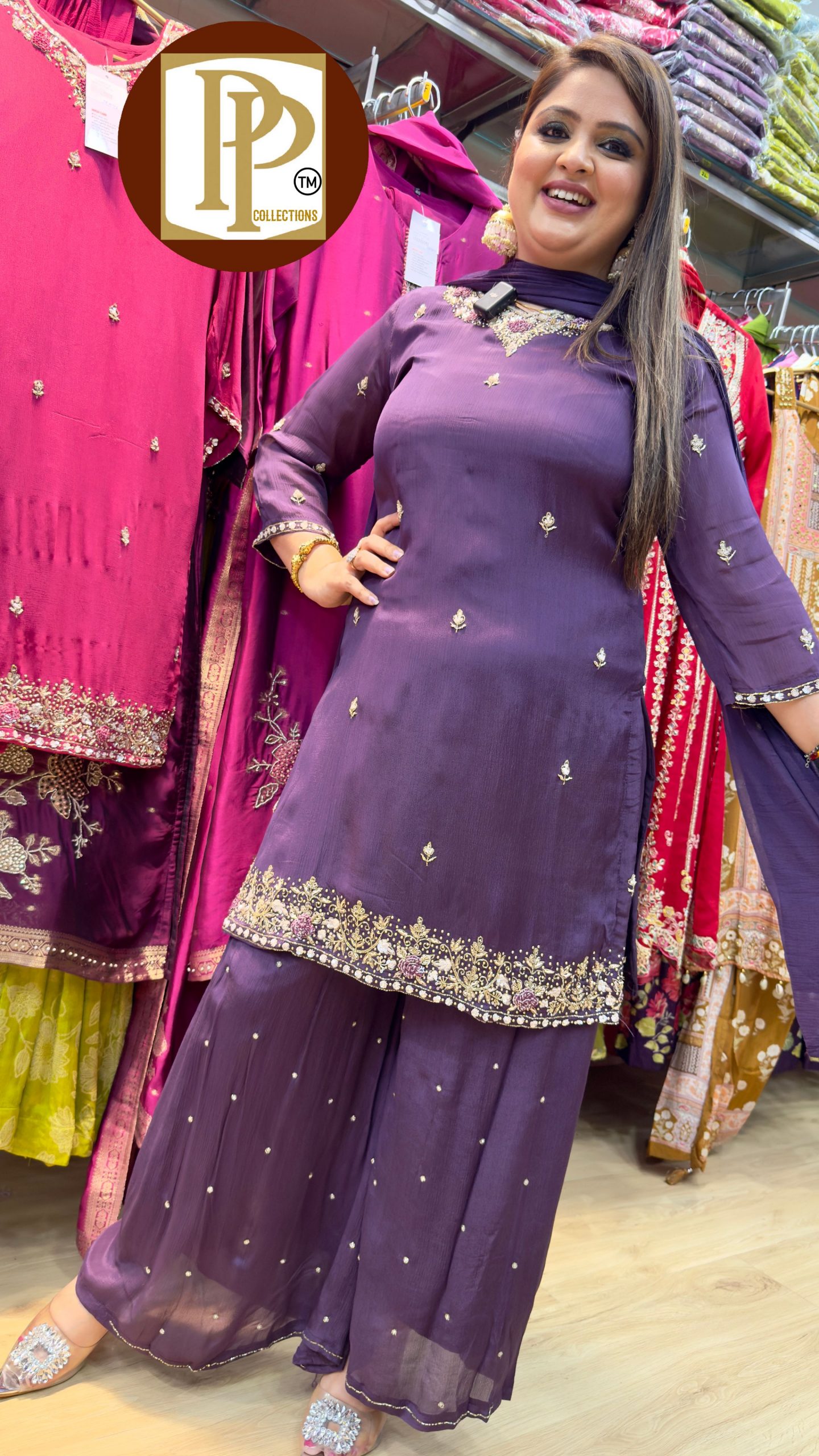 Description : 3piece Divider Set Fabric Type : Chinnon Style : Anarkali Set with divider Work Type : Havey Hand Work Mirror work With Matching Dupatta.