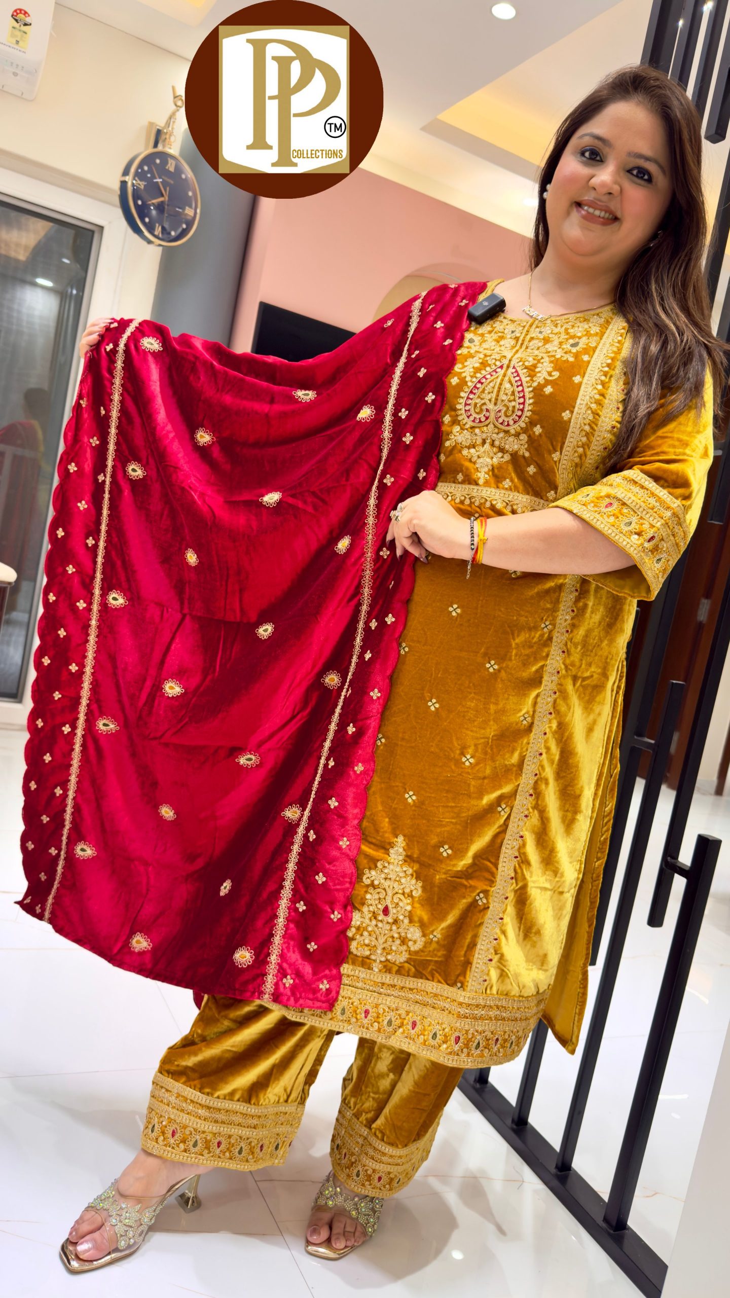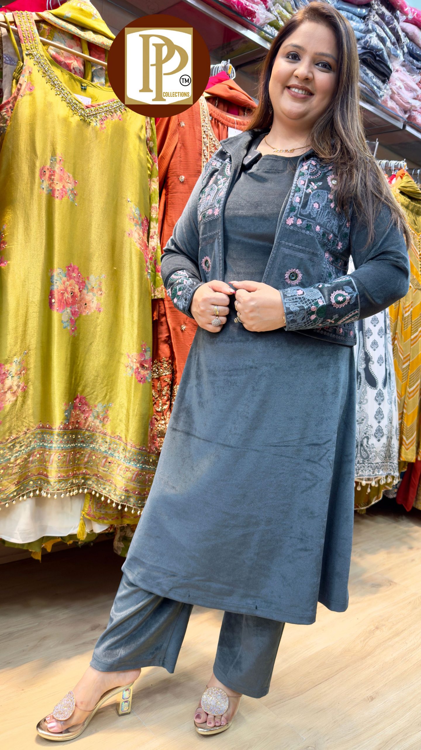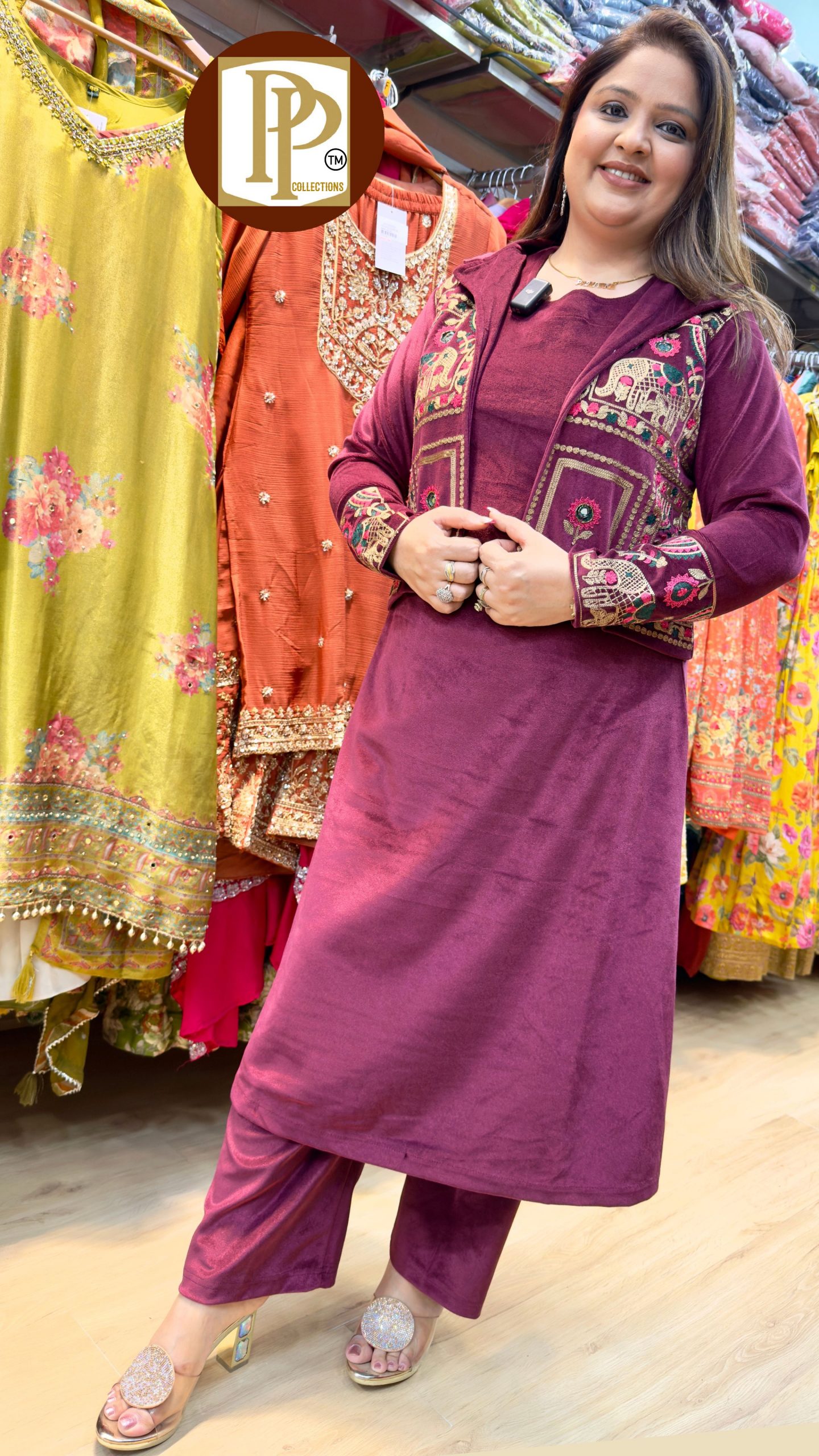 Description : 3 pcs cord set Fabric Type : velvet Style : inner & jacket with pants Work Type :embroidery in jacket with matching inner & matching pants
