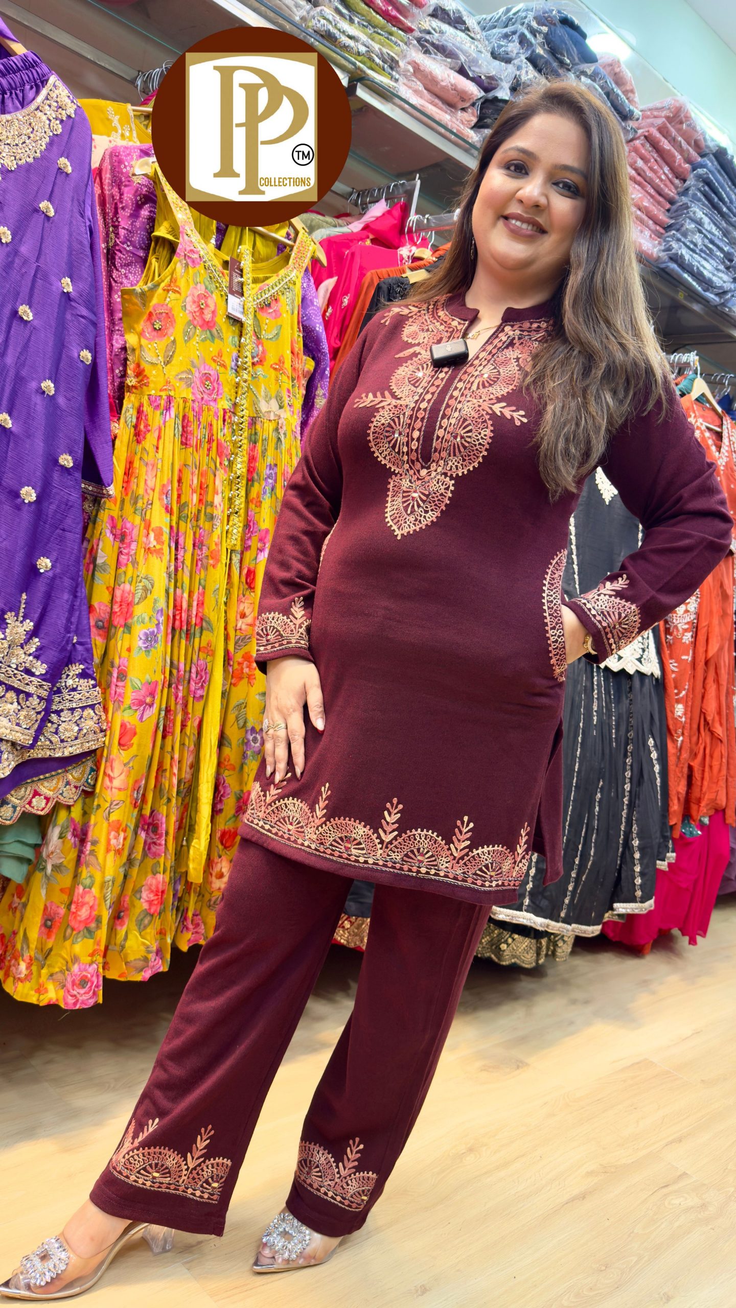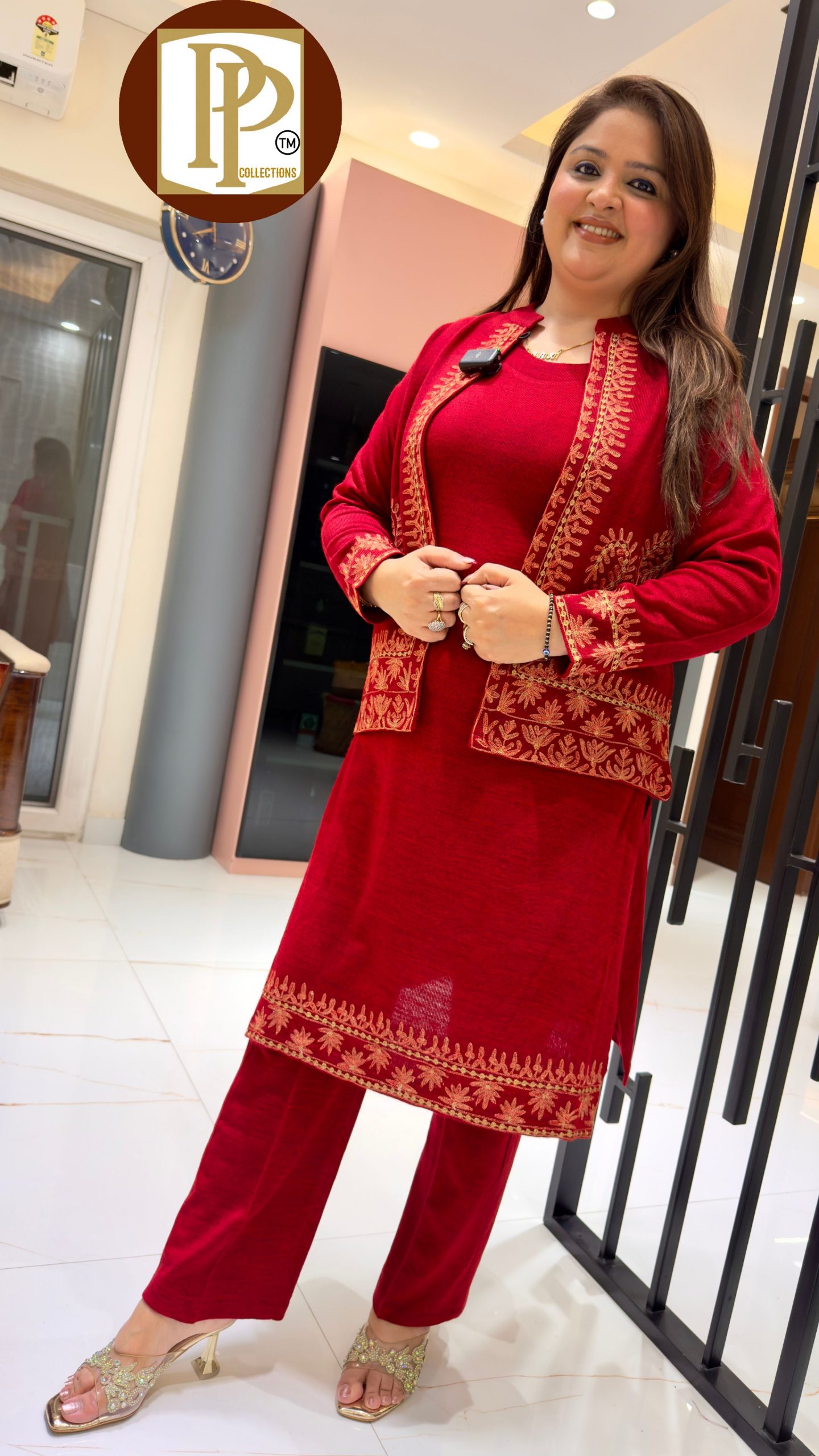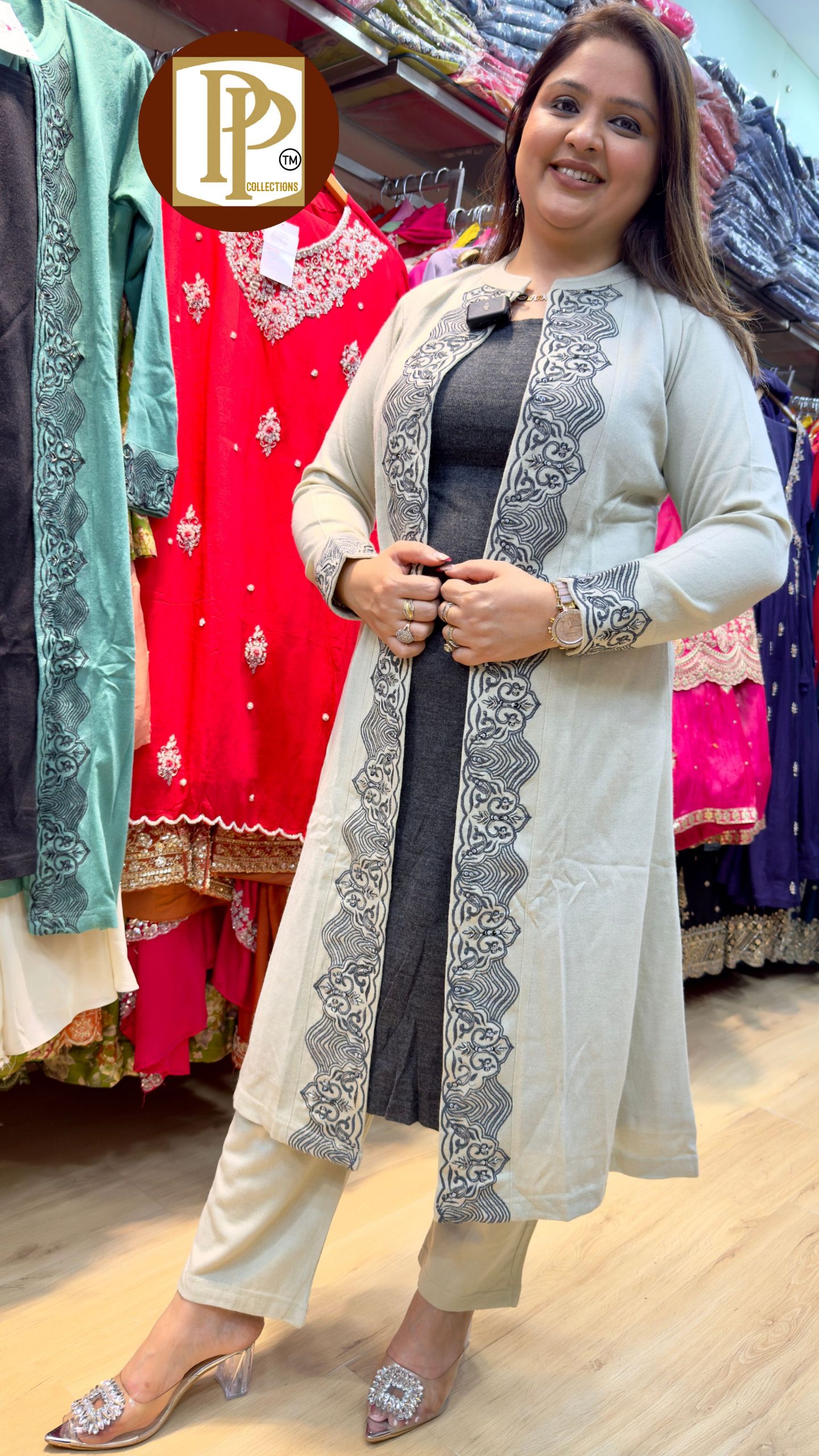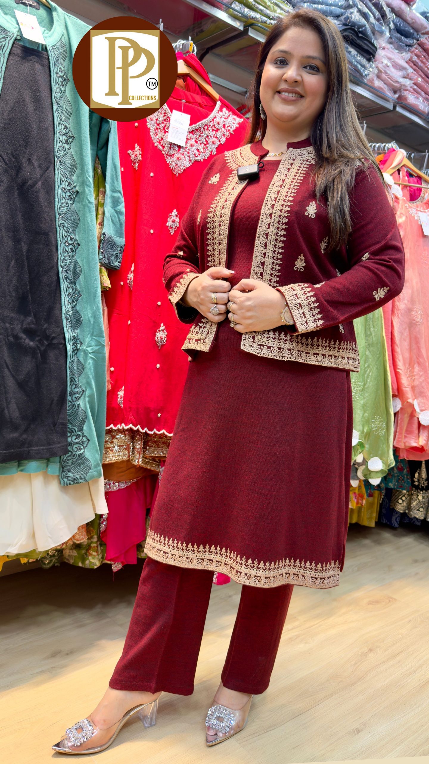 Description : 3pcs cord set Fabric Type : woollen Style : pashmina shrug Work Type : handwork in pashmina detachable shrug & matching inner with pants.