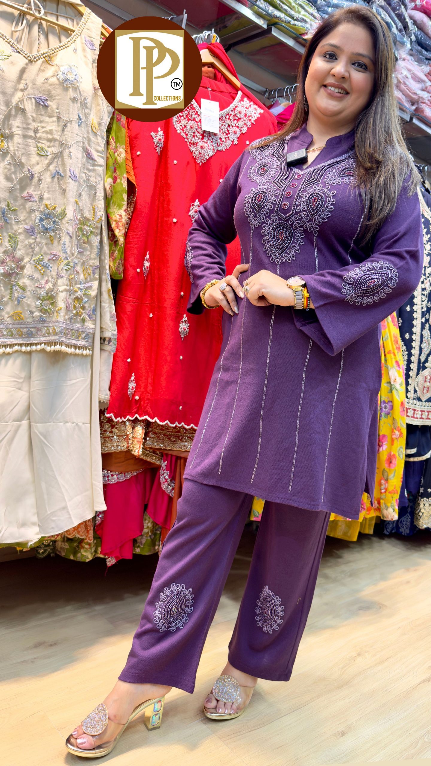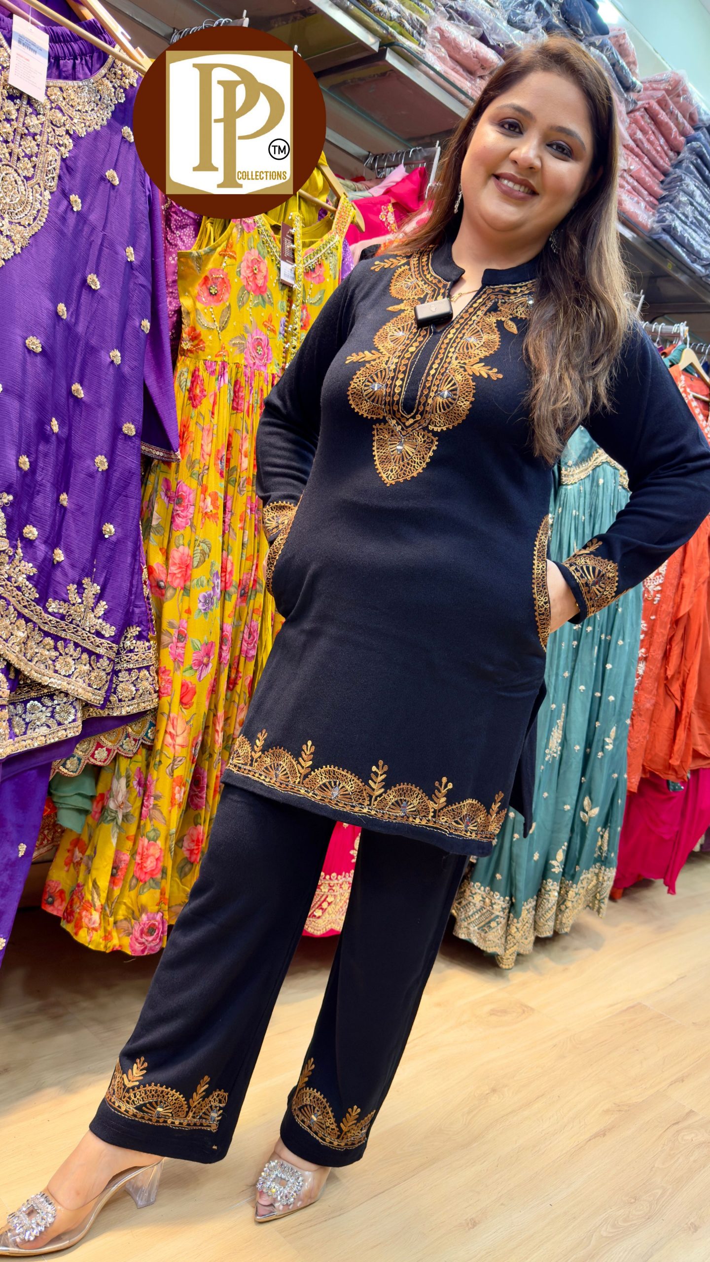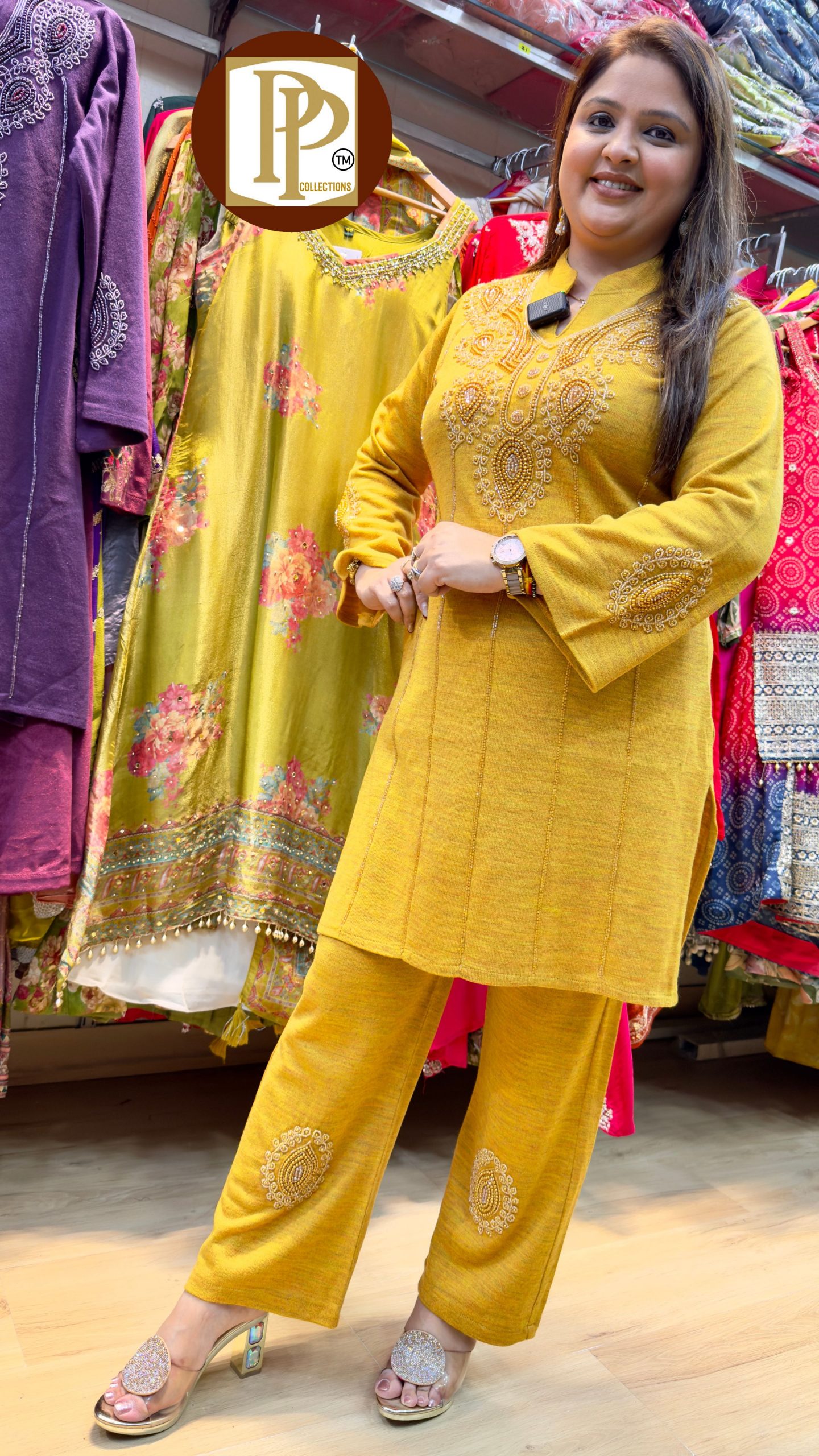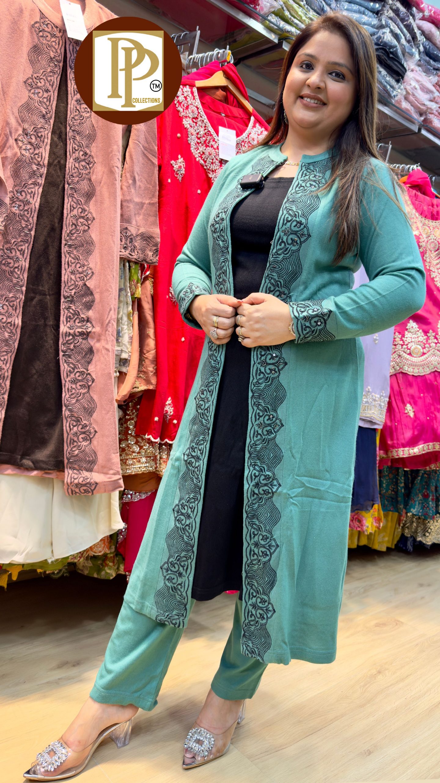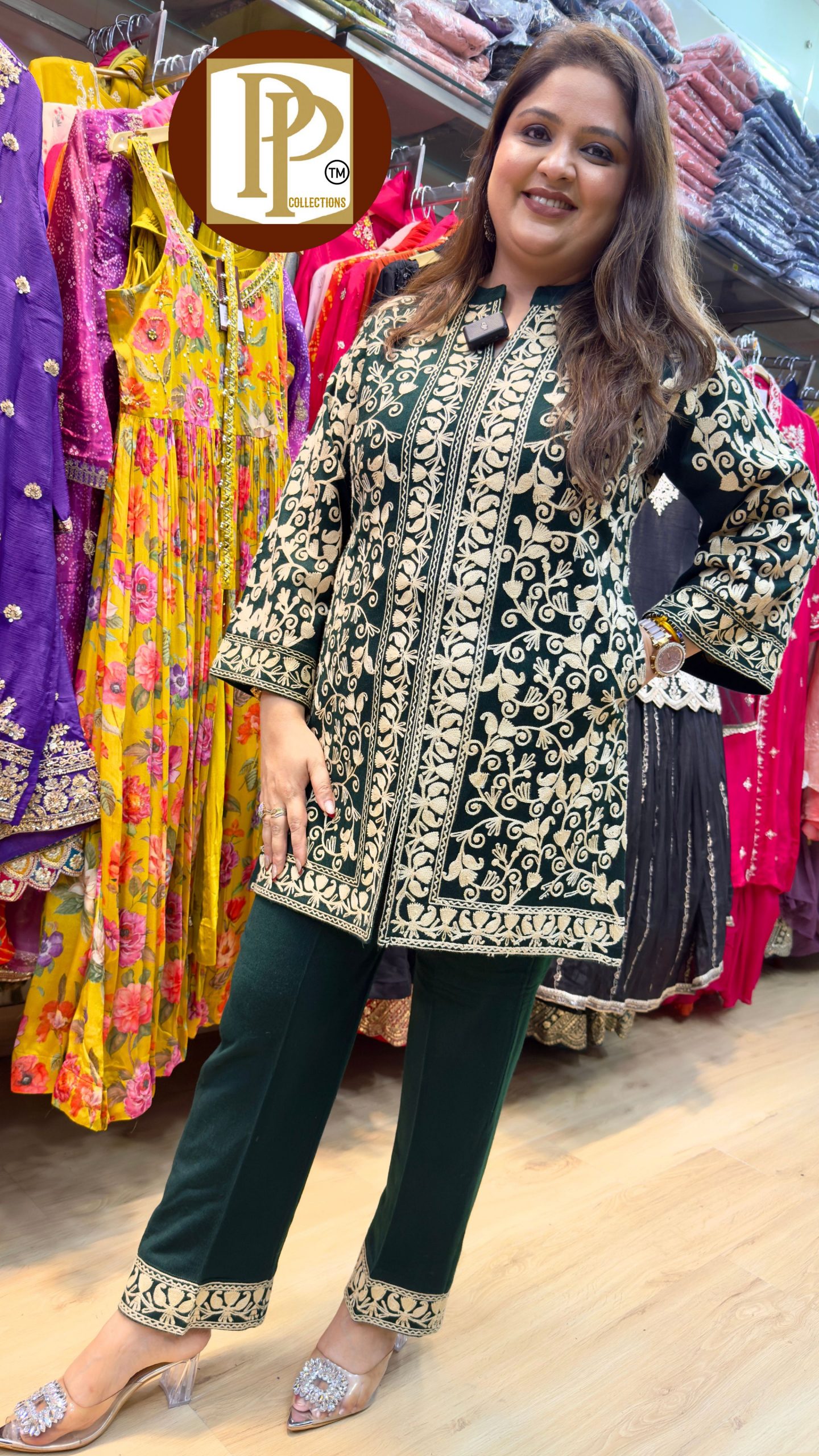 Description : 3pcs cord set Fabric Type : woollen Style : pashmina shrug Work Type : handwork in pashmina detachable shrug & matching inner with pants.