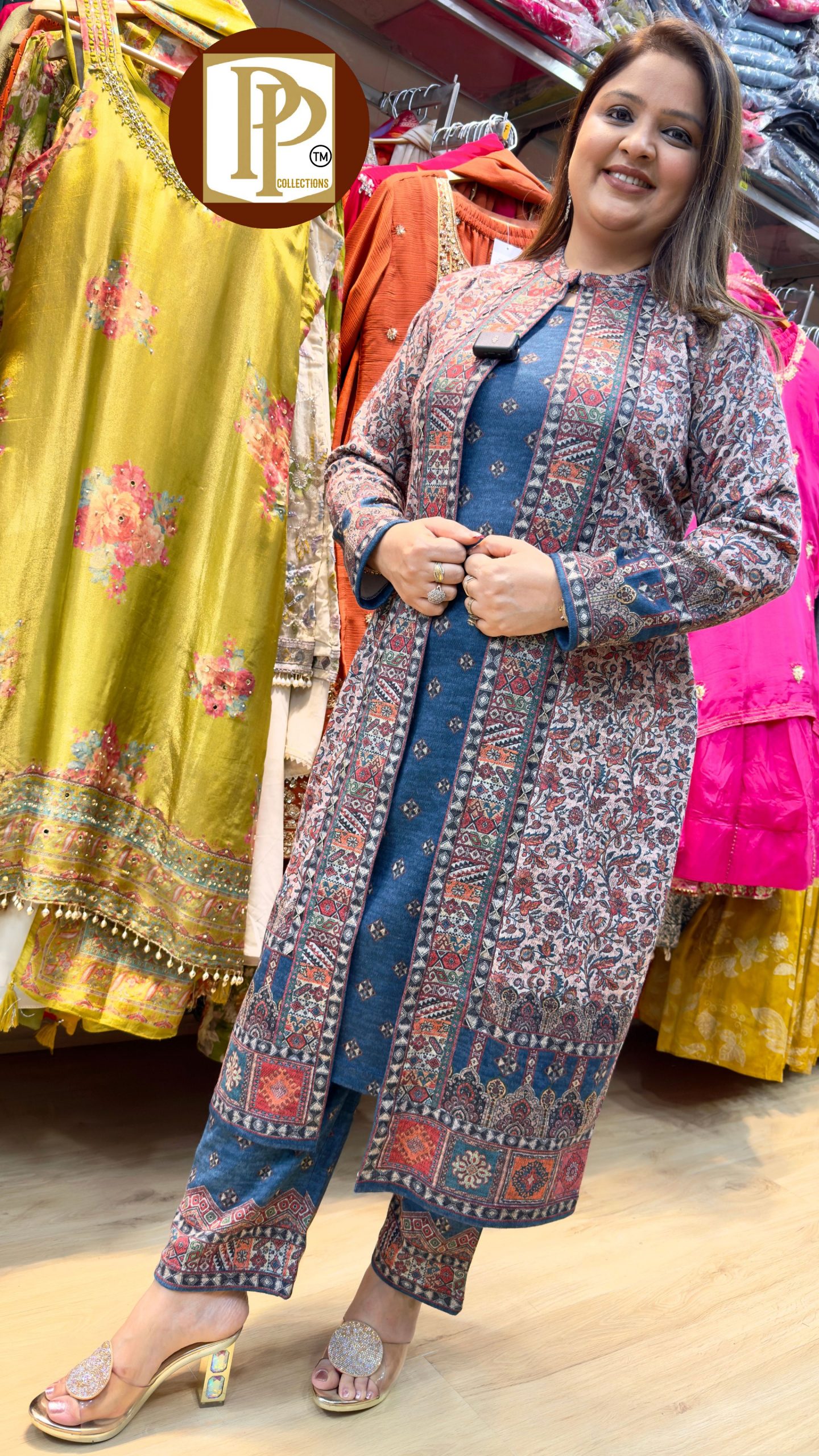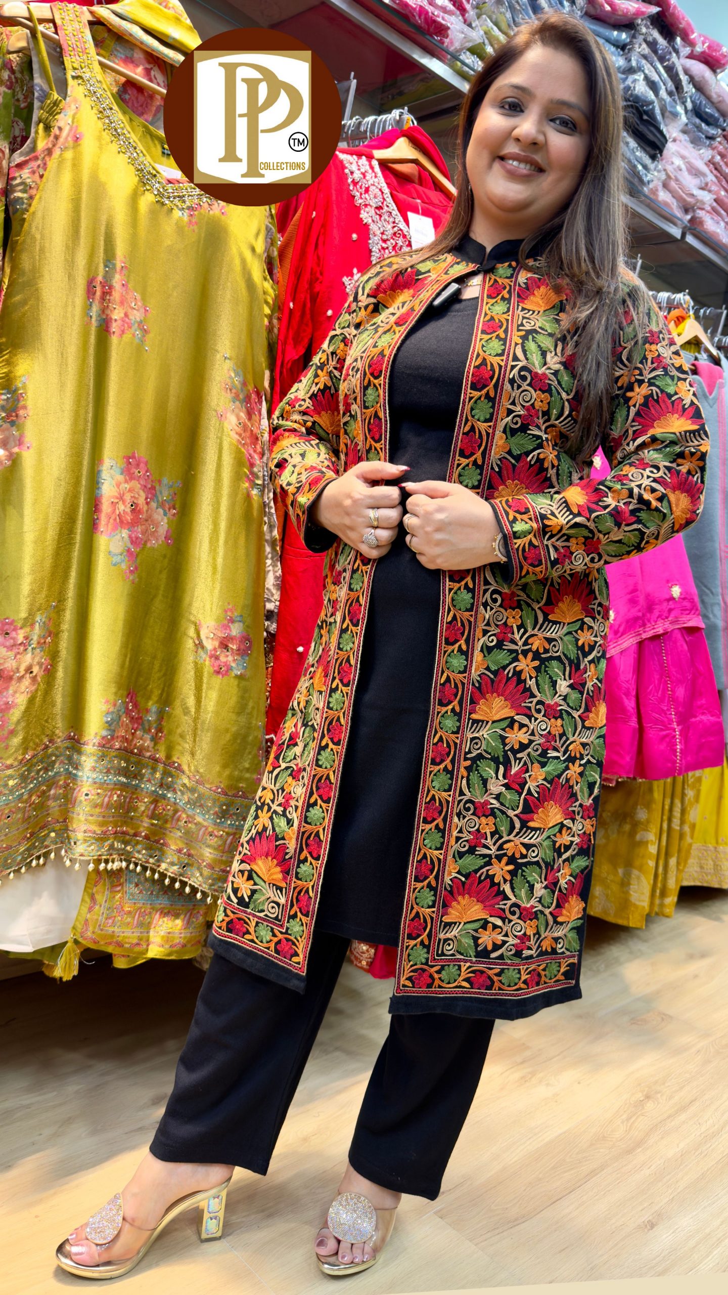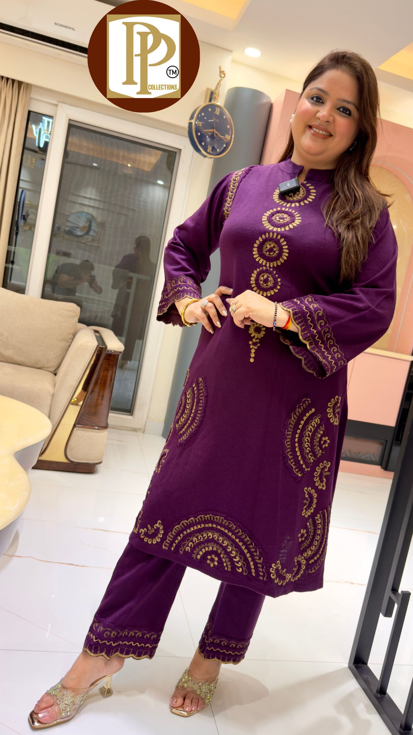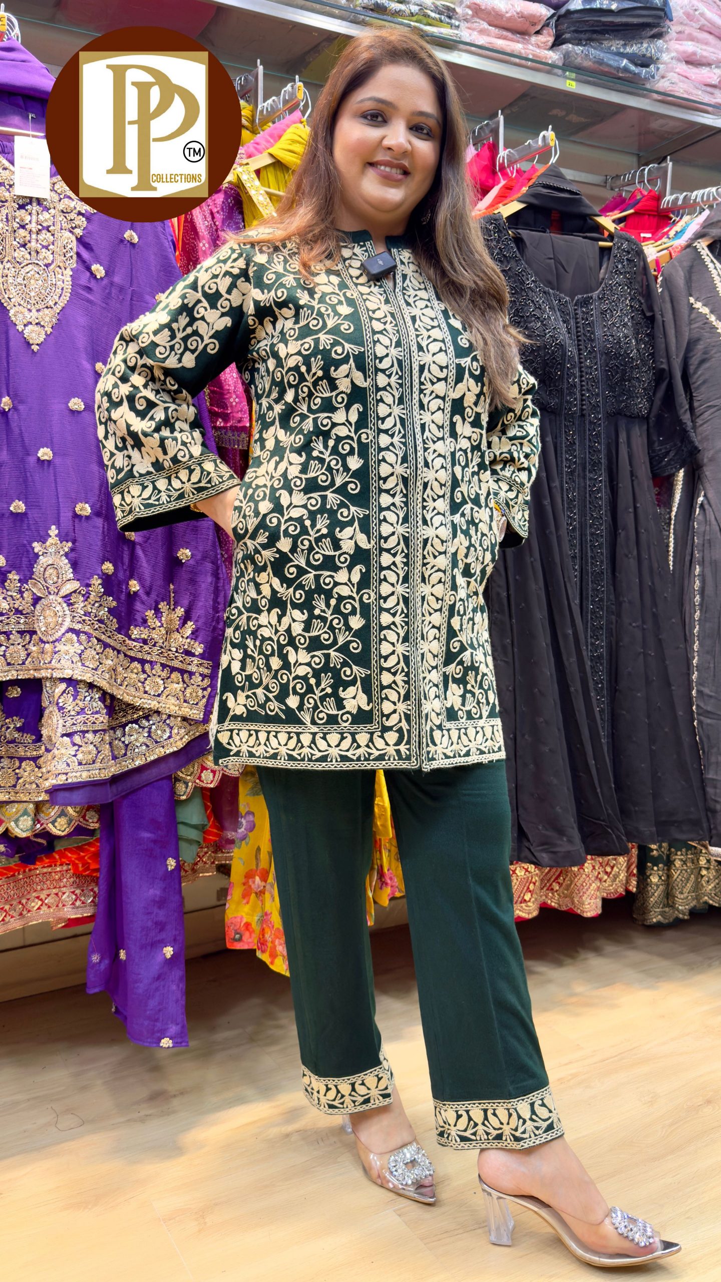 Description : 3pcs cord set Fabric Type : woollen Style : pashmina shrug Work Type : handwork in pashmina detachable shrug & matching inner with pants.