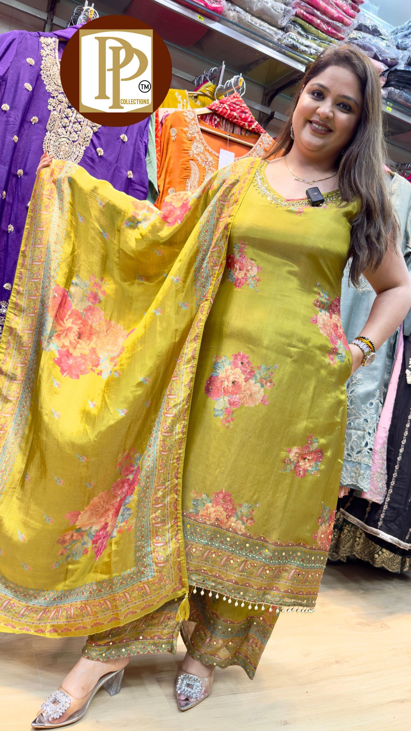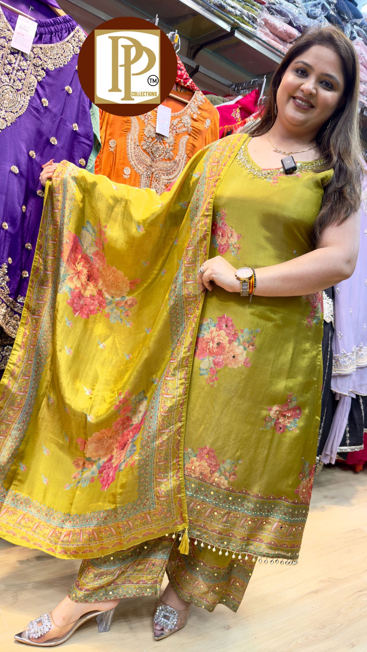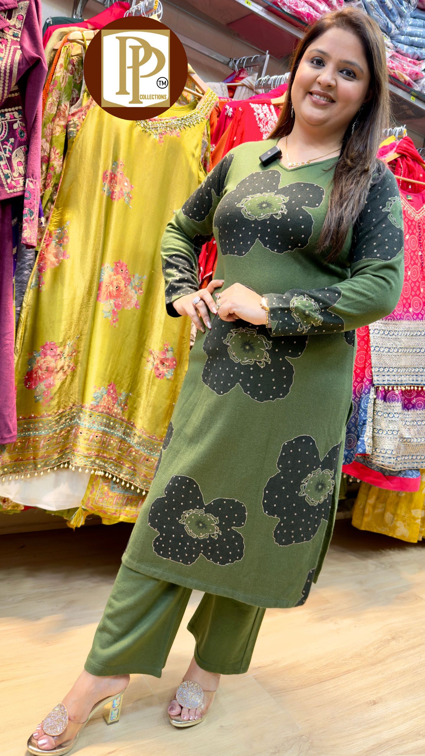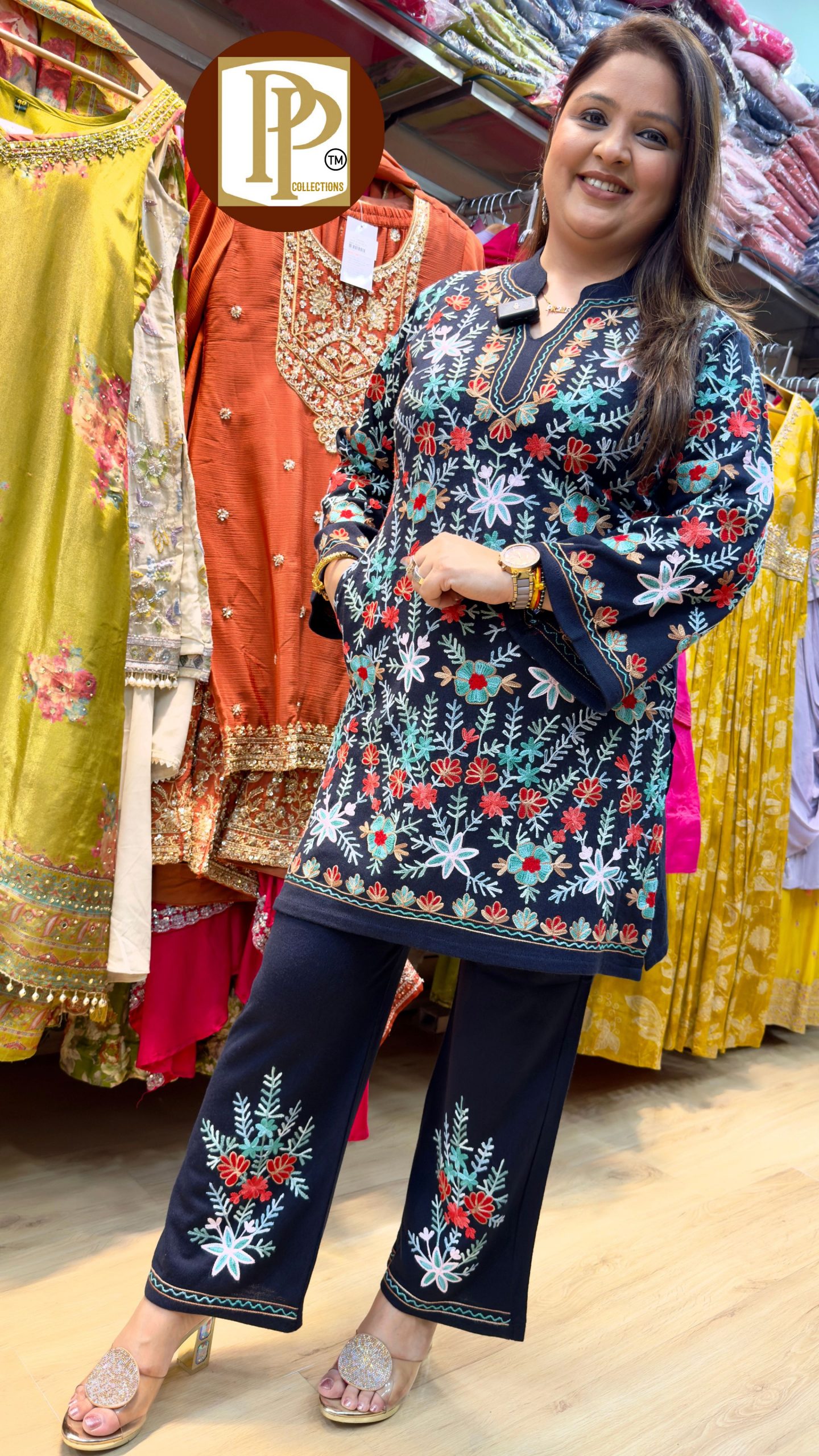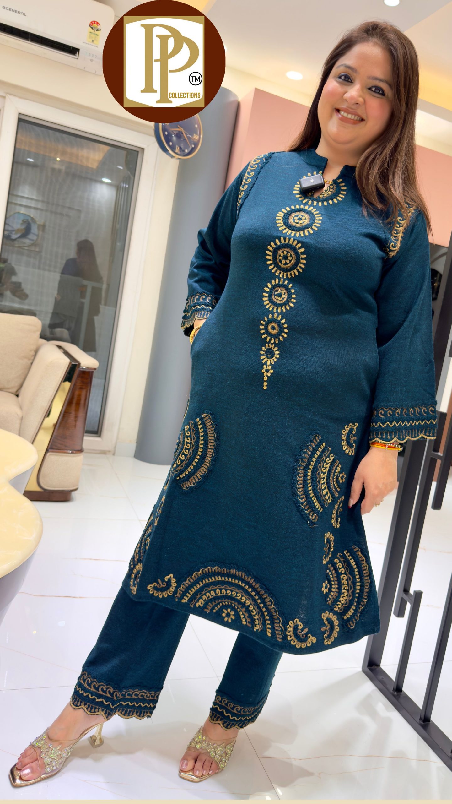 Description : 3pcs cord set Fabric Type : woollen Style : pashmina shrug Work Type : handwork in pashmina detachable shrug & matching inner with pants.