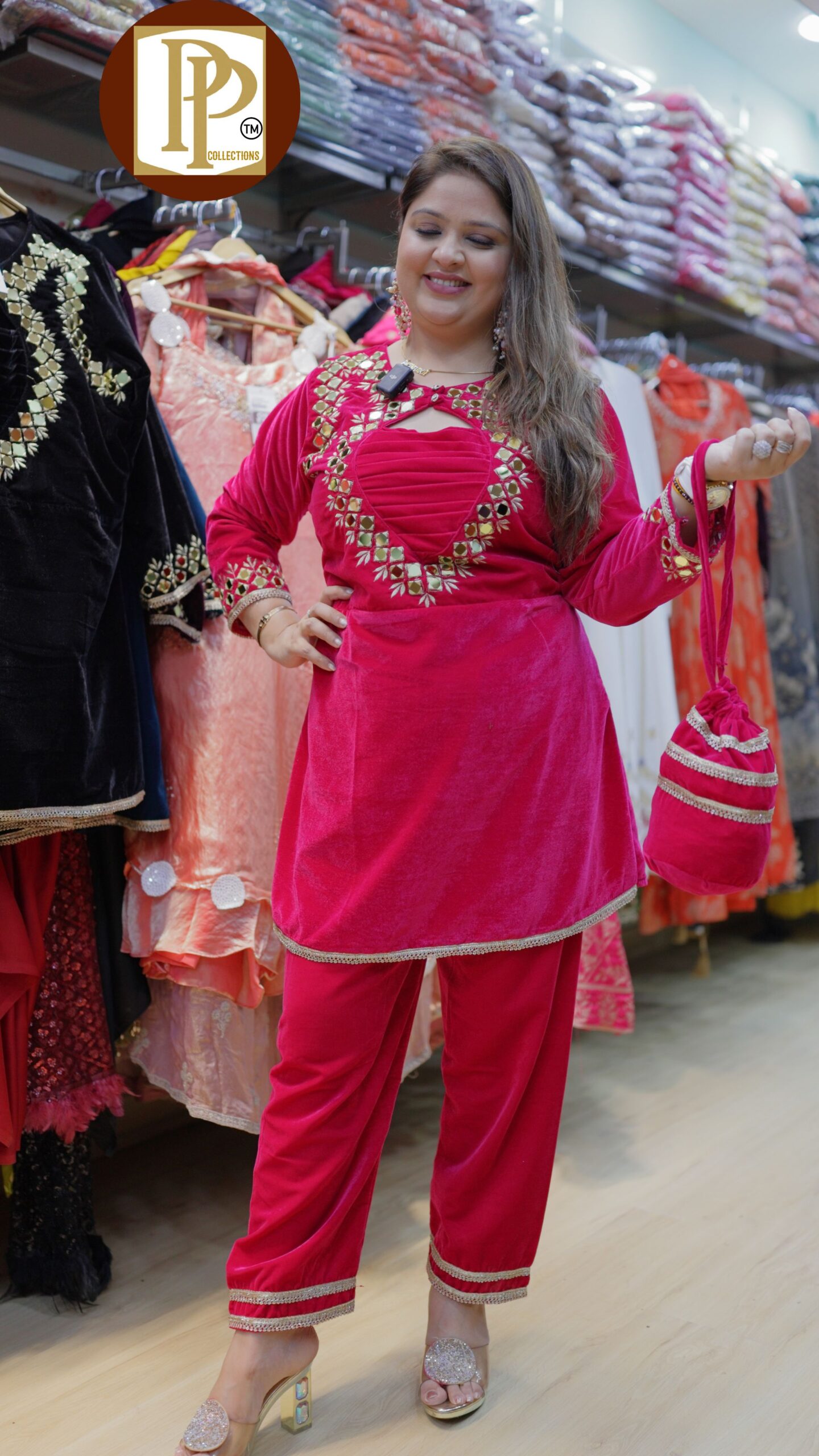 Description : 2 pcs Pant Set Fabric Type : Velvet Style : Co-ord Sets Work Type : Original Mirror & Laces Work With Matching Potli.