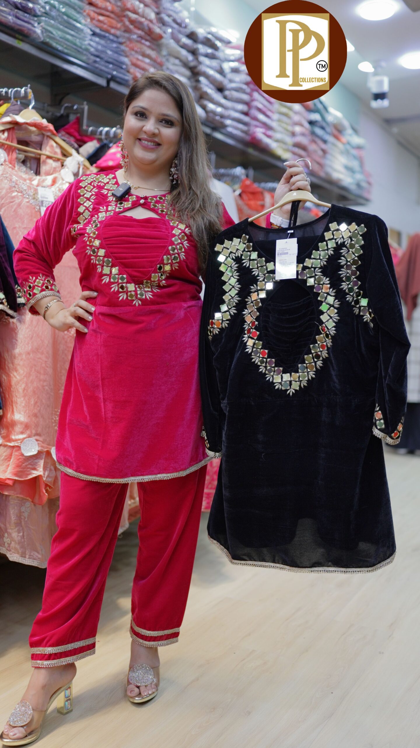 Description : 2 pcs Plazzo Set Fabric Type : Velvet Style : Co-ord Sets Work Type : Original Mirror & Hand Work.