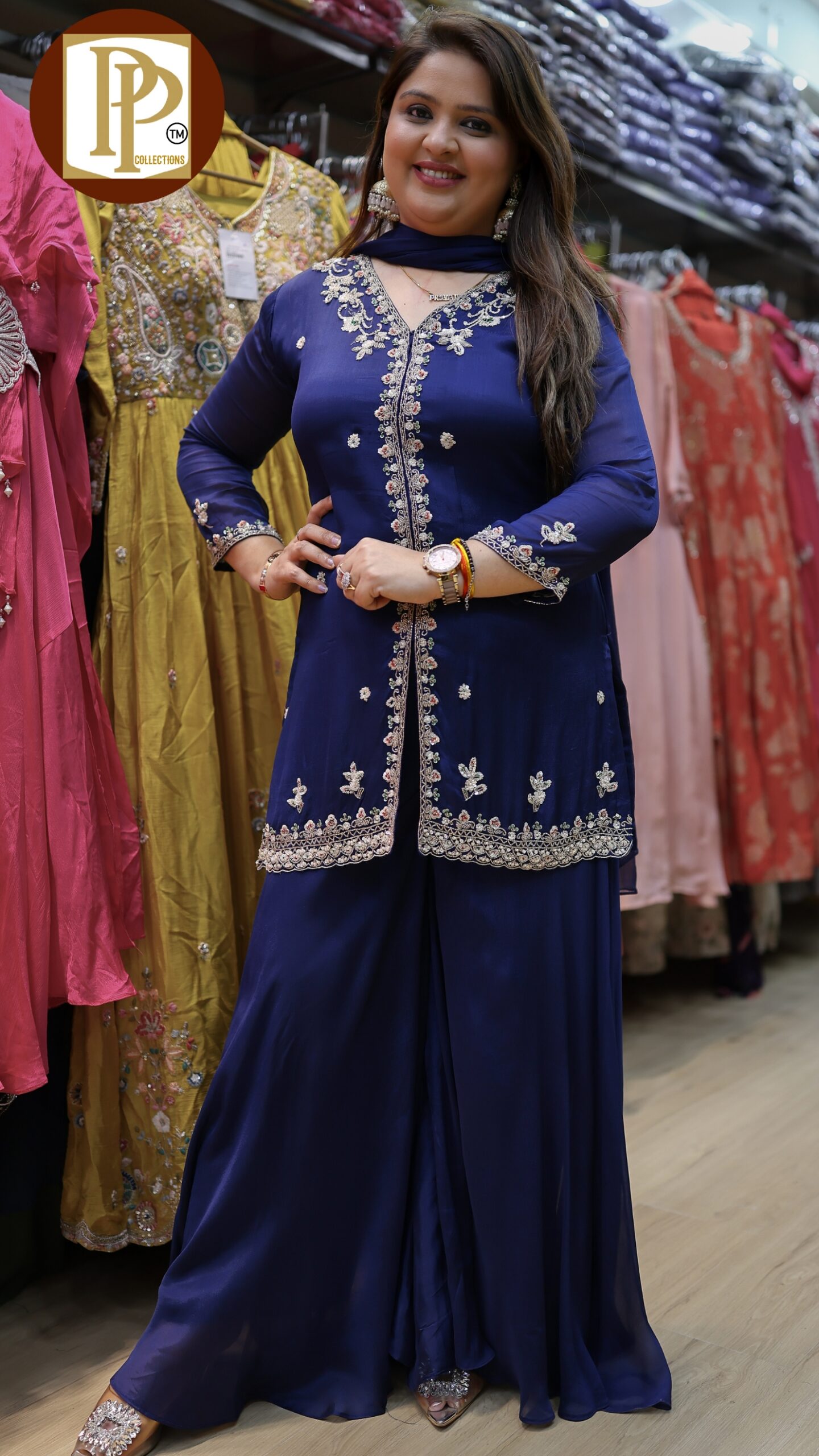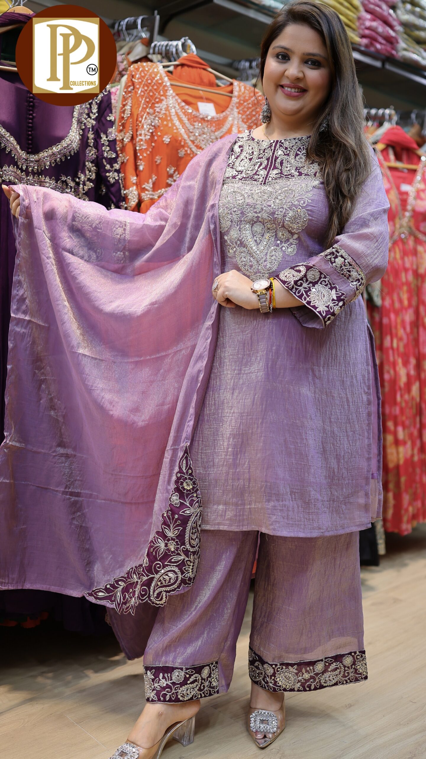 Description : 3pcs palazzo set Fabric Type : fendi Style : straight suit Work Type : heavy handwork & threadwork zari & sipi work with matching palazzo & dupatta . O020