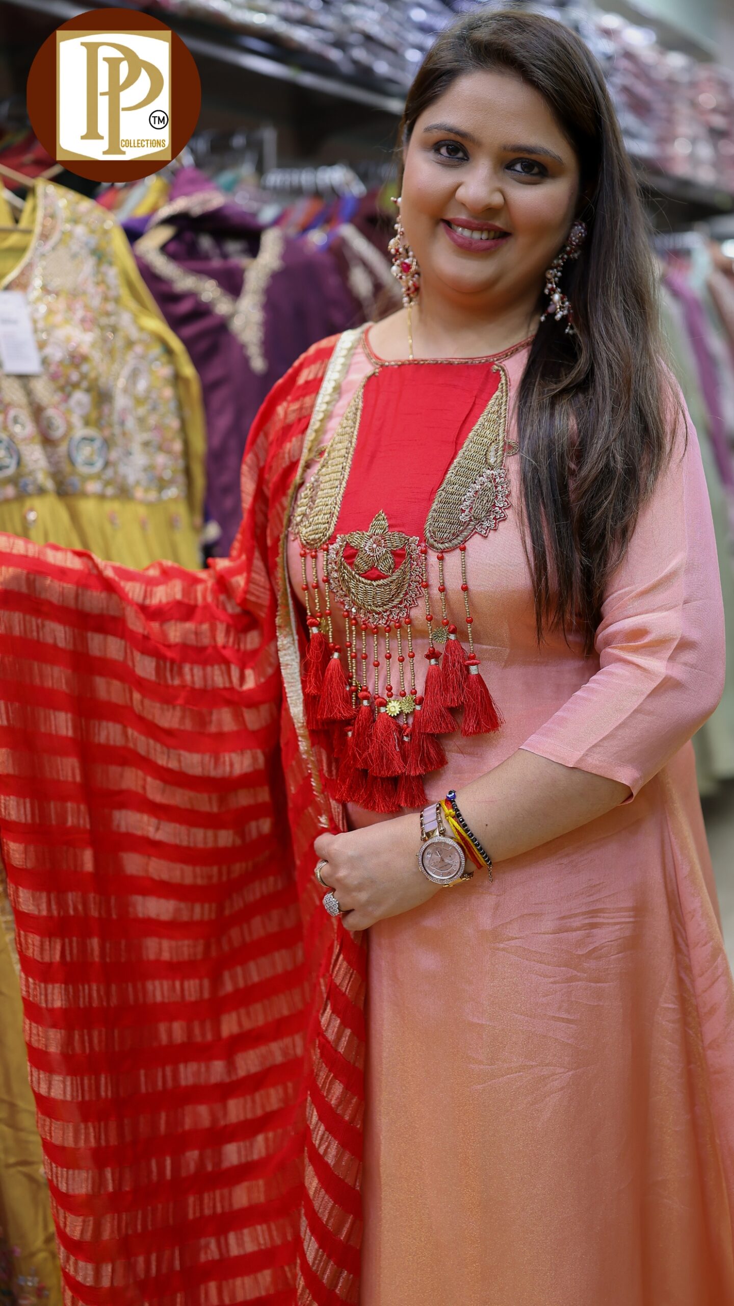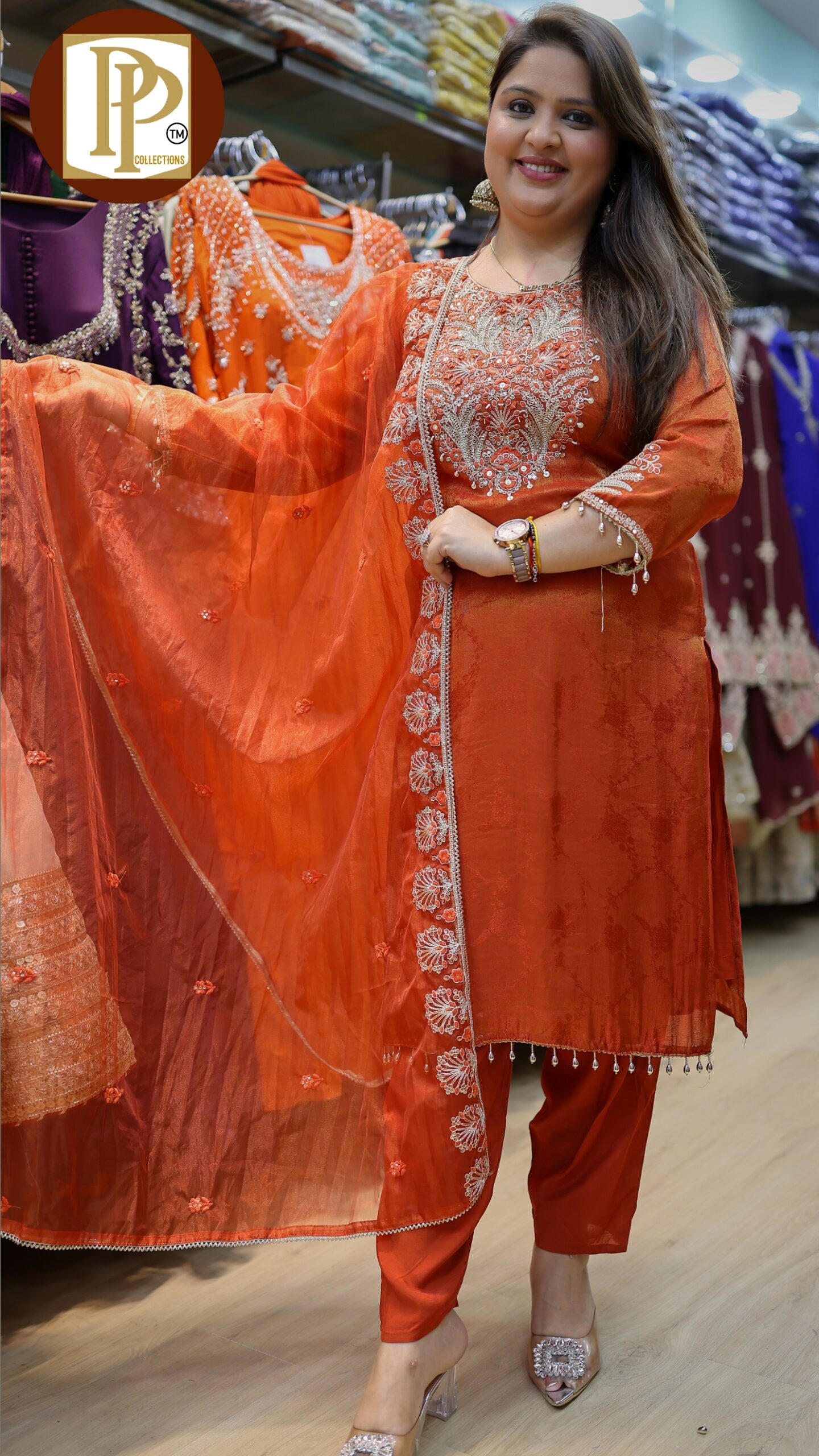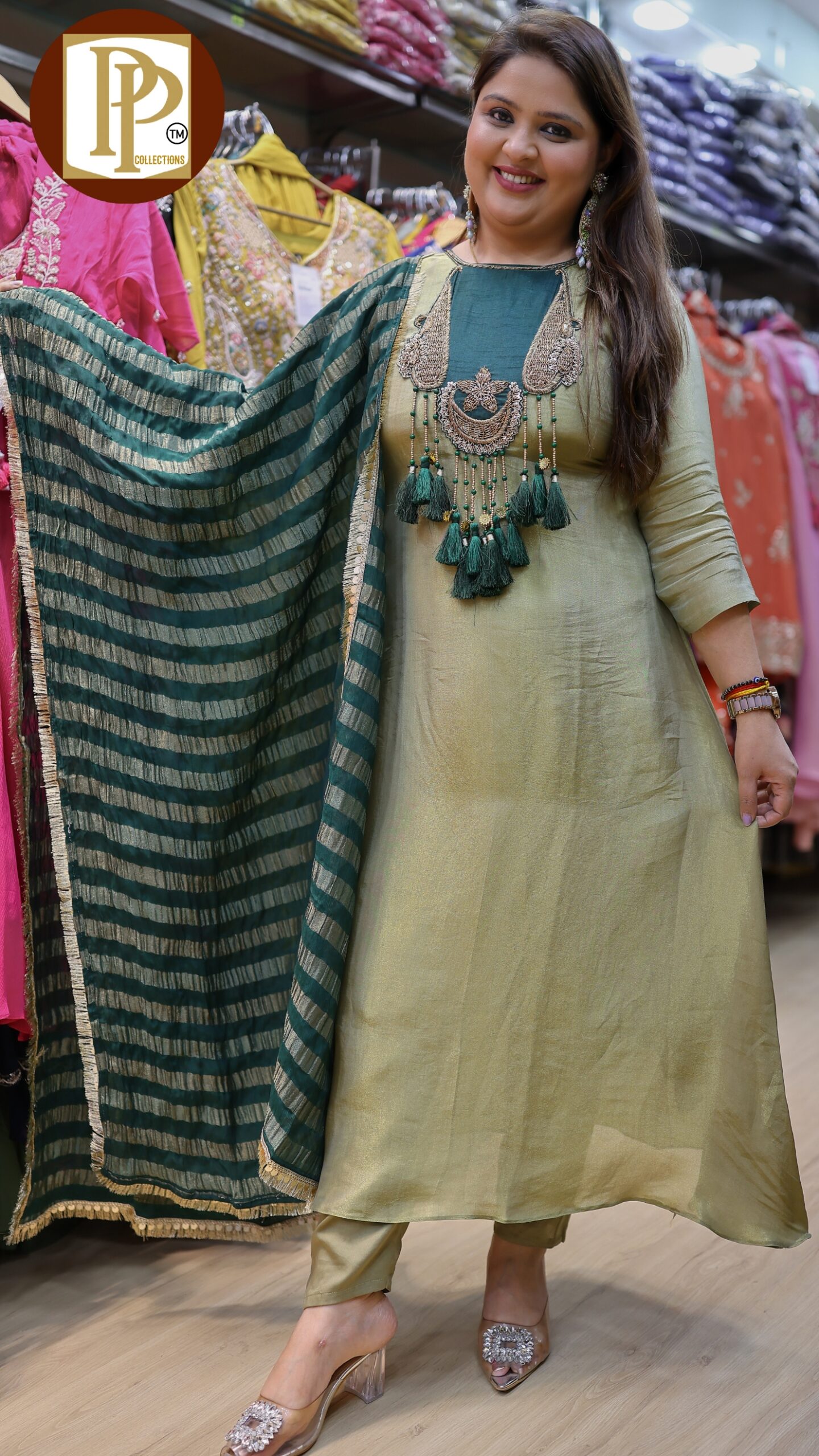 Description : 3 pcs pant set Fabric Type : Tissue Style : aline kurta with pants Work Type : heavy handwork in kurta & tassel work with matching jacquard printed work in dupatta .