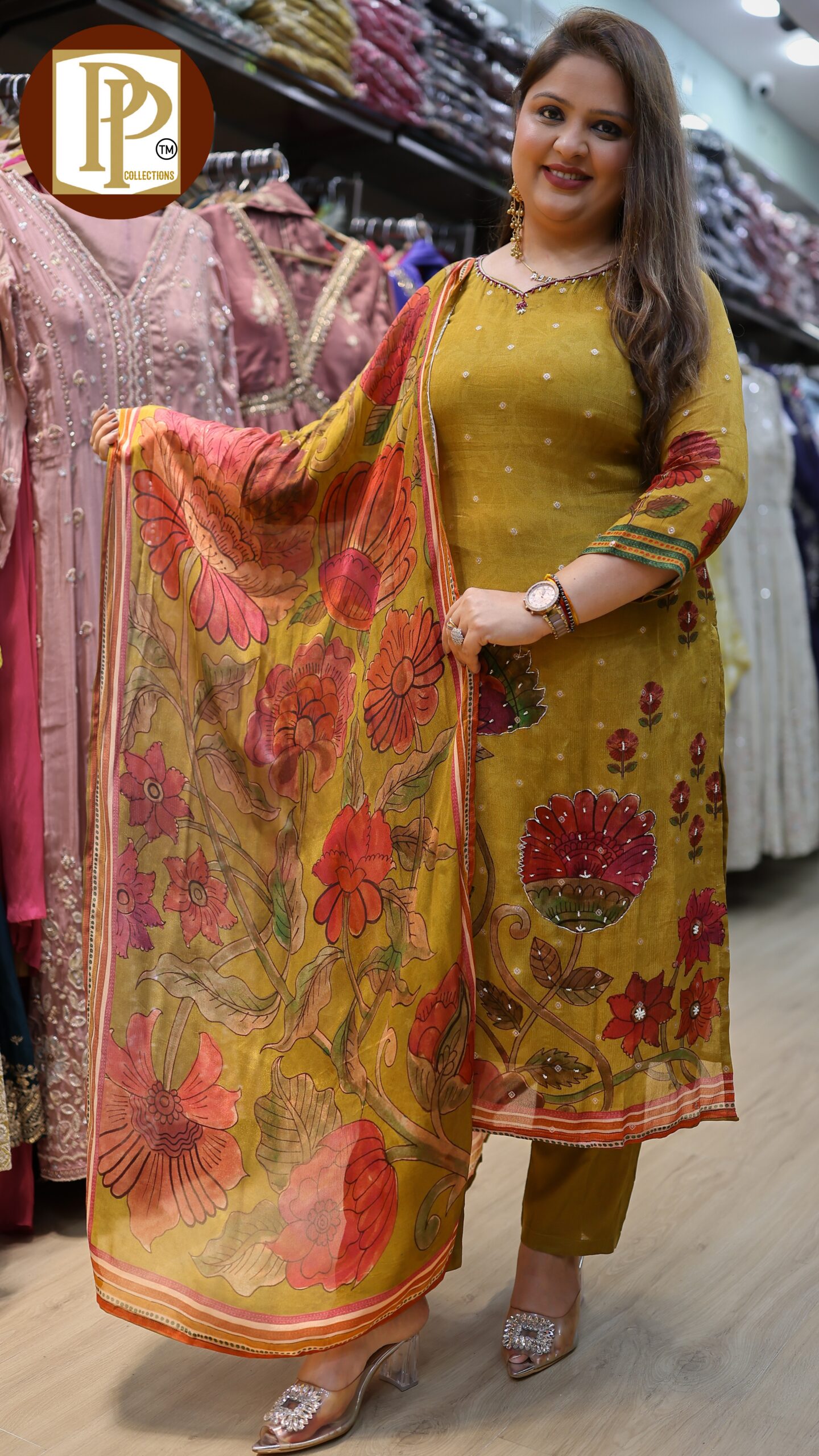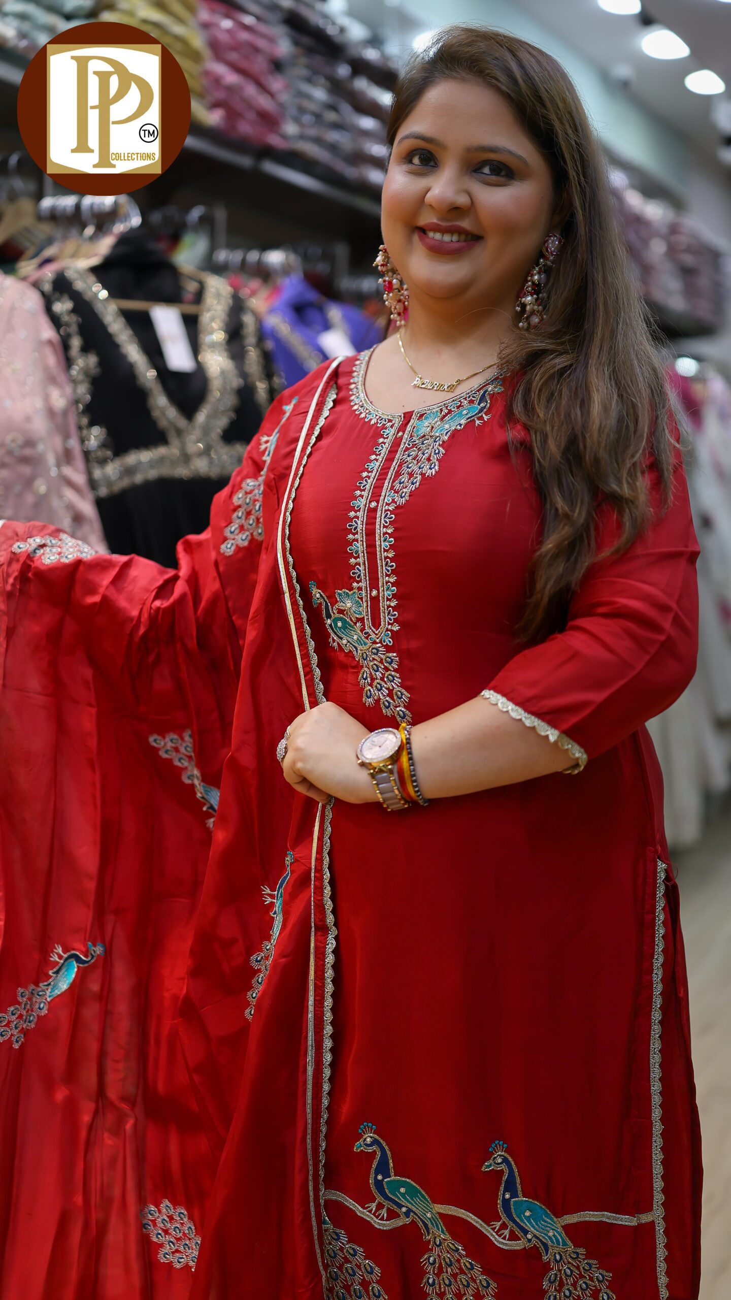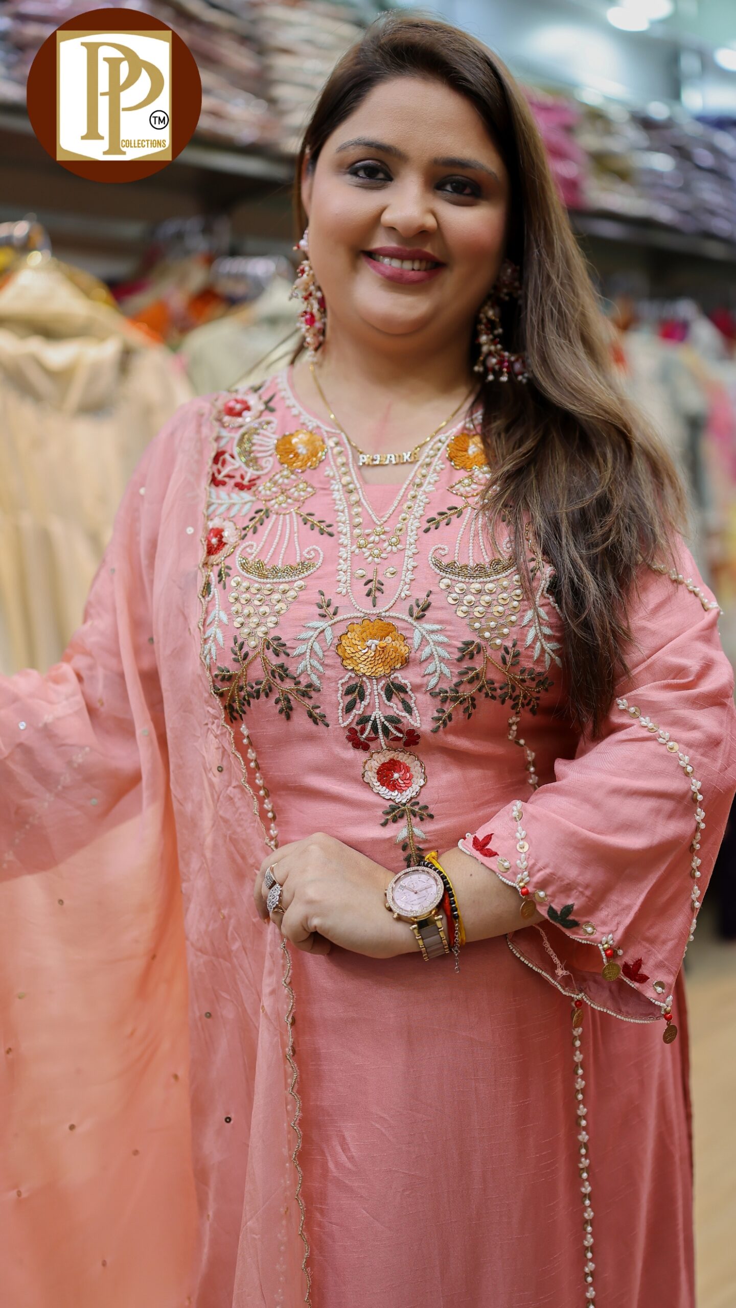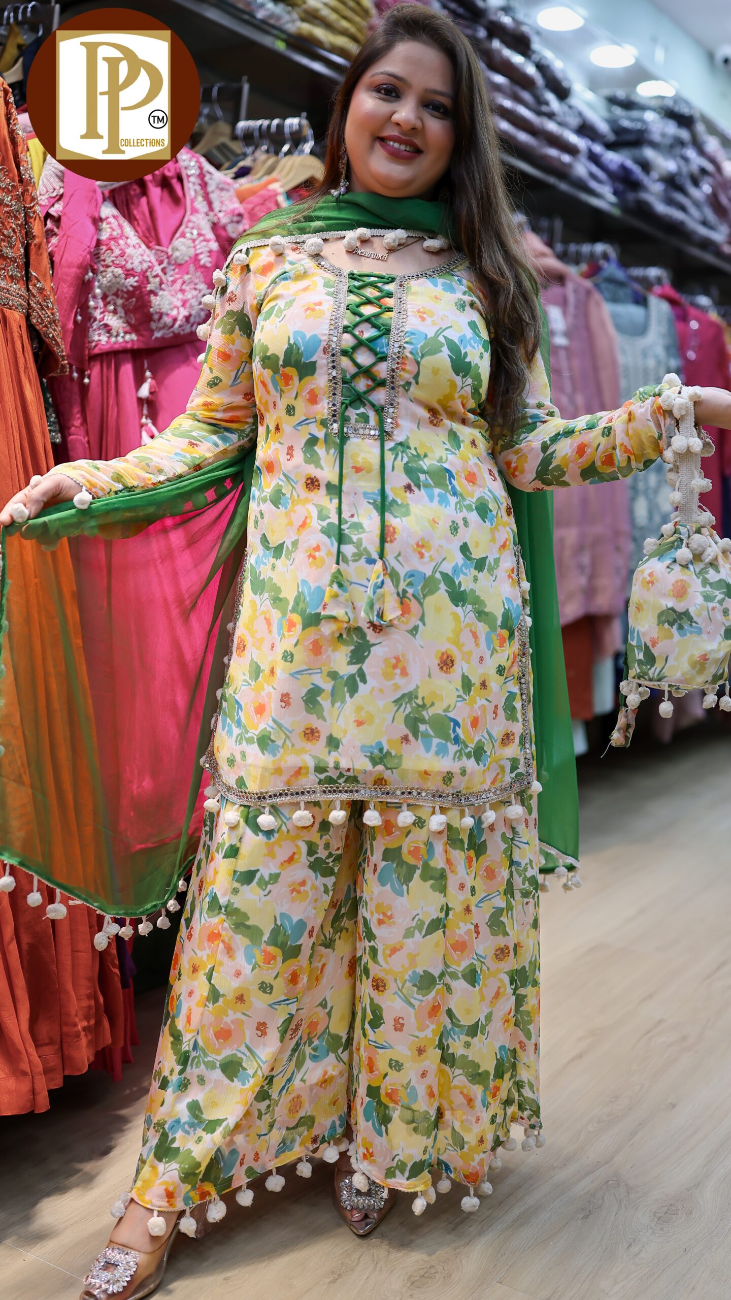Description : 3 pcs pant set Fabric Type : Tissue Style : aline kurta with pants Work Type : heavy handwork in kurta & tassel work with matching jacquard printed work in dupatta .