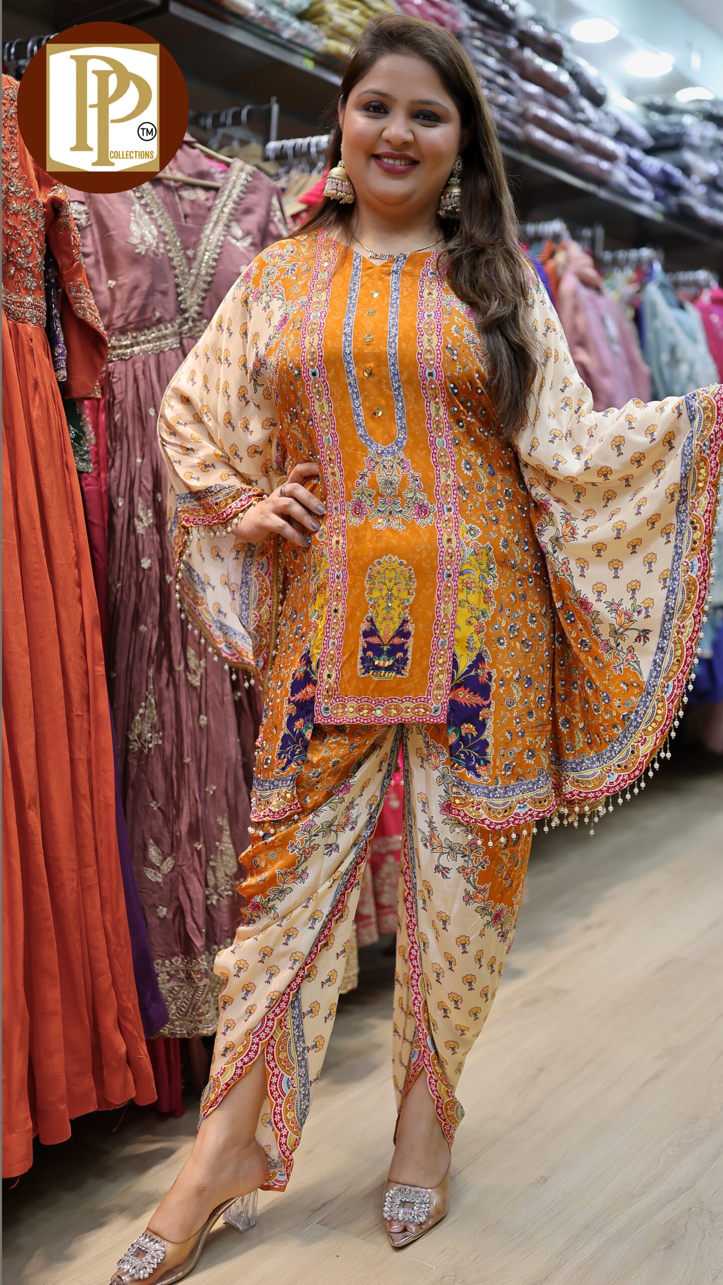 Description : 2pcs kaftan set Fabric Type : crepe Style : butterfly style kurta with tulip pants Work Type : heavy handwork original mirror work in kurta with matching tulip pants .