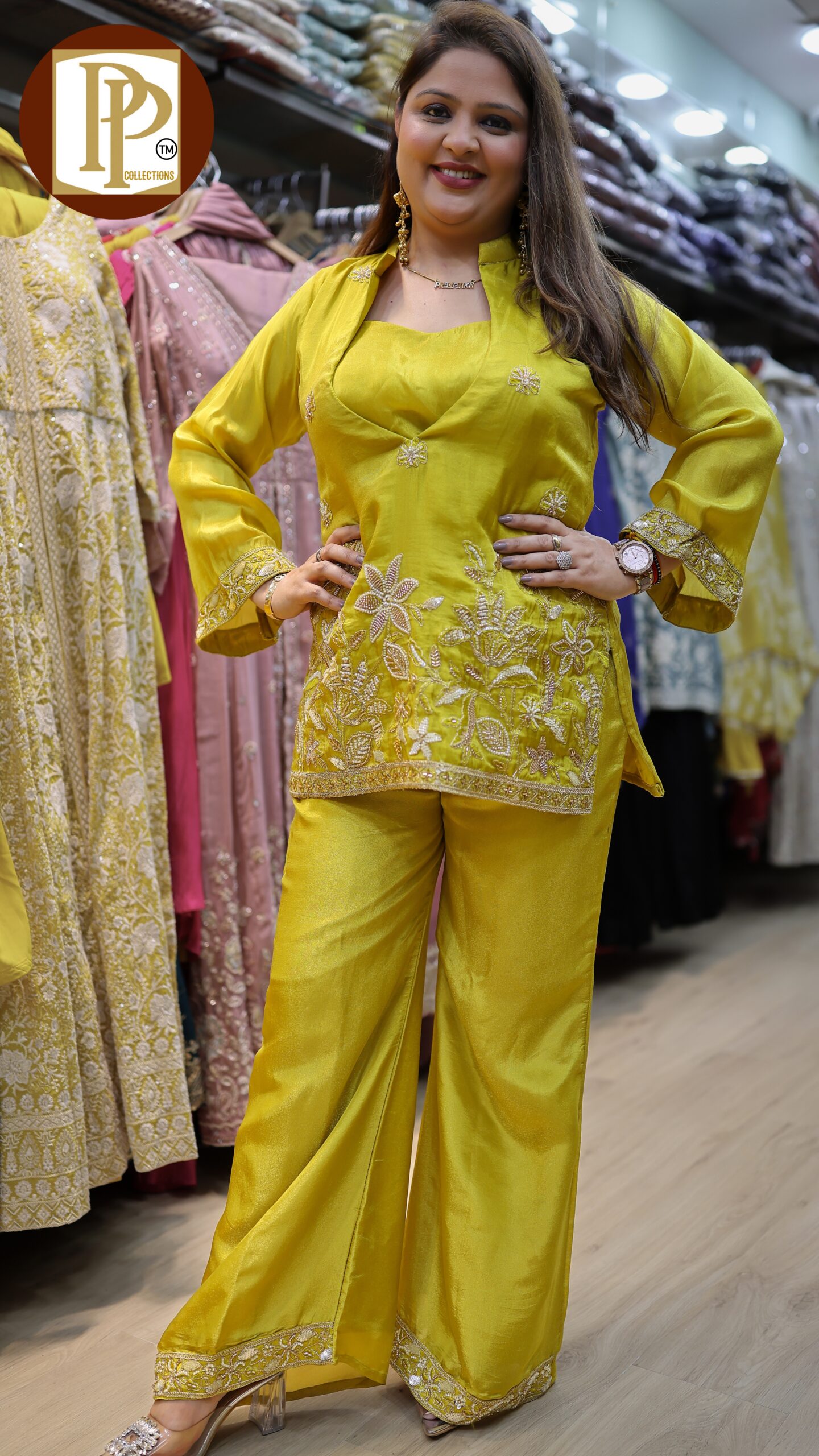 Description : 3pcs palazzo set Fabric Type : tissue Style : Bustier style cord set with palazzo Work Type : heavy handwork & Zari work in kurta with matching palazzo