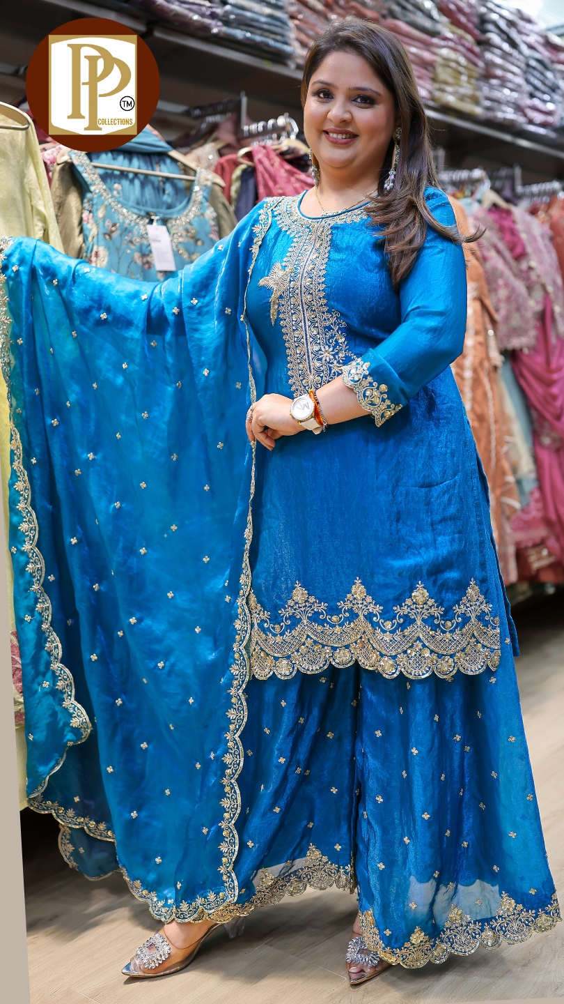 Description : 2pcs palazzo set Fabric Type : chinnon Style : cord set Work Type : Full heavy threadwork & handwork in kurta with matching Palazzo . G732