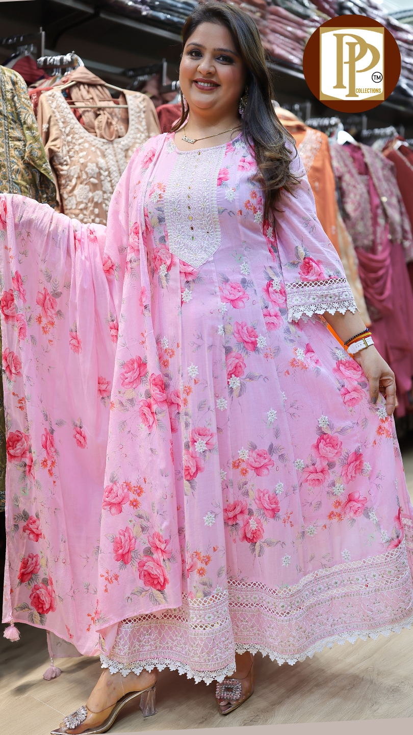 Description : 3pcs pant set Fabric Type : Mul Cotton Style : anarkali with pants Work Type : all over flower print Full threadwork lakhnavi threadwork in anarkali with matching pants & dupatta .  O023