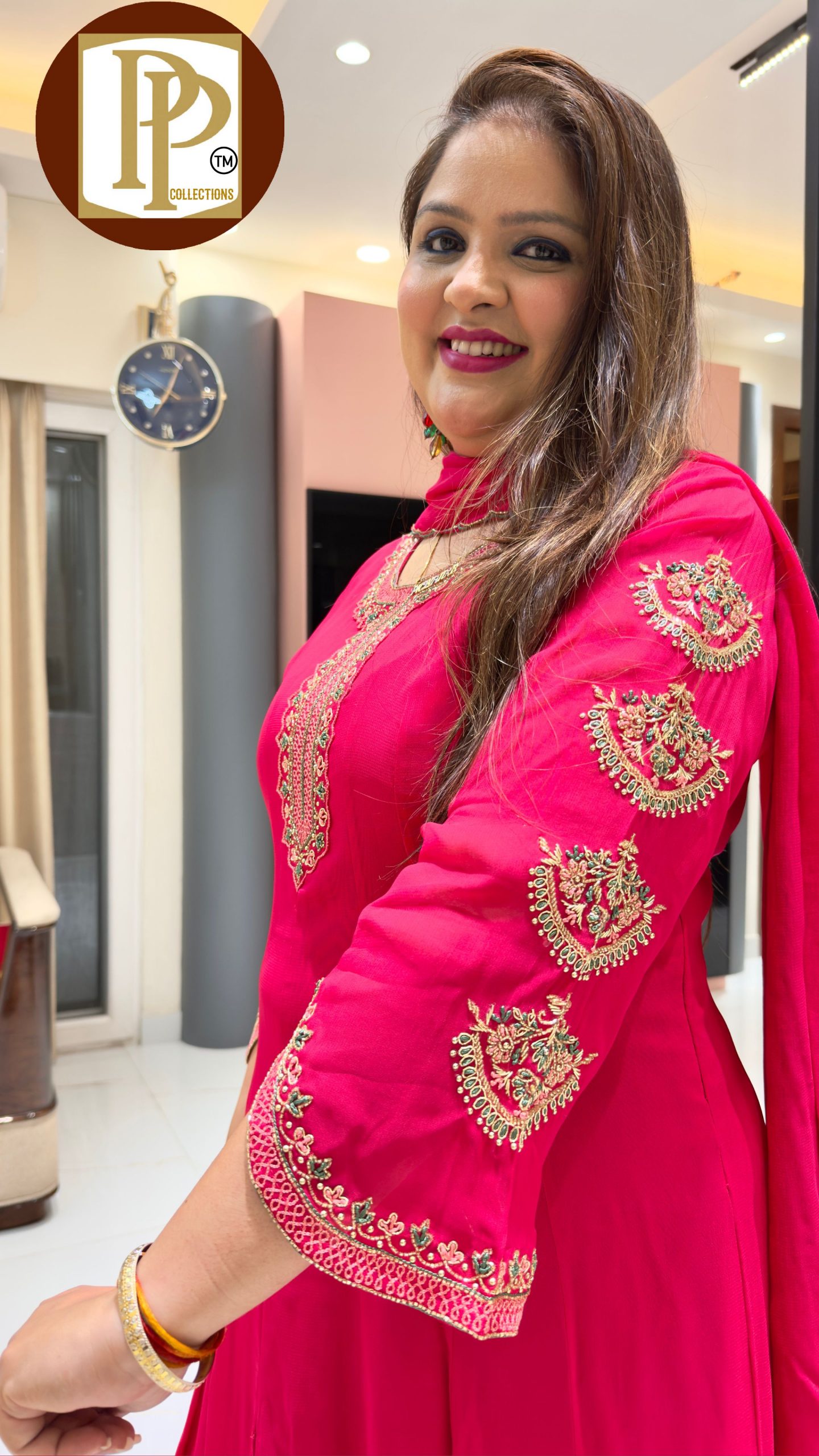 Description : 3piece Plazzo Set Fabric Type : Silk Style : Frint Slit Cut Work Type : Full Have Thread Work With Matching Net Choker Stye Dupatta.