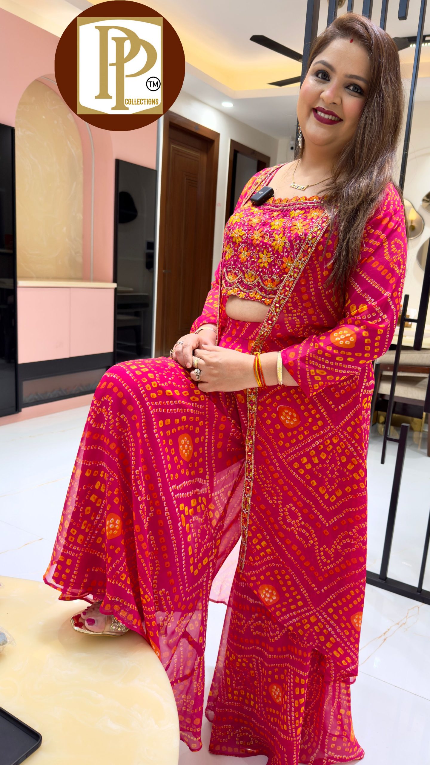 Description : 3piece Skirt Set Fabric Type : Chinnon Style : Indo western Crop Top Skirt & Cape set Work Type :Full Have hand Work With Matching Cape.